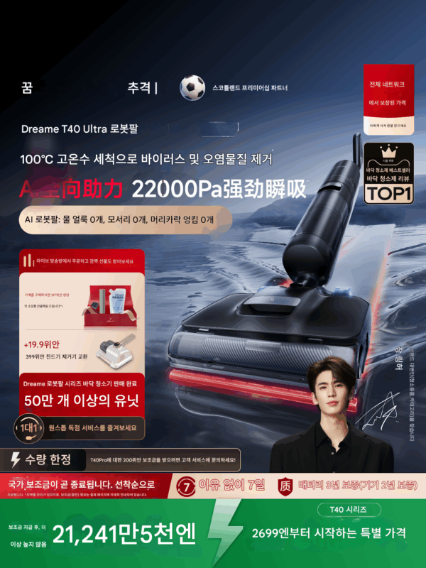 [전국 15% 할인] Dreame T40Ultra 로봇팔 바닥 청소기, 물때 제로, 평평한 표면, 보풀 제로, 양방향 파워 어시스트
