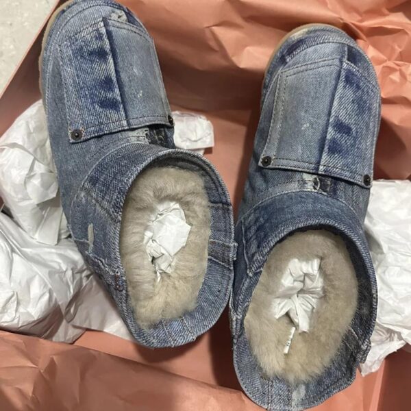 2024 짧은 배럴 코튼 부츠, 모피 및 가죽 스노우 부츠, 벨벳 레트로 데님 스노우 부츠, 두꺼운 밑창 라운드 투 부츠