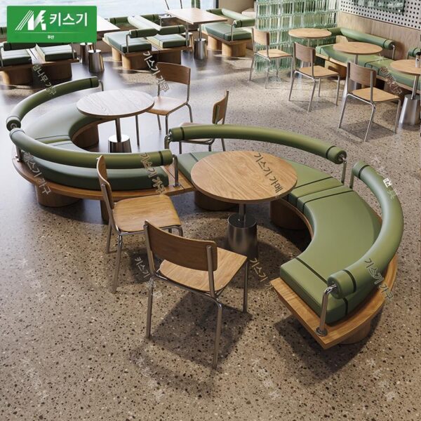 맞춤형 통나무 스타일 커피숍 견고한 목재 반원형 부스 소파 밀크티 스낵바 협상 여가 스테인리스 스틸 테이블과 의자