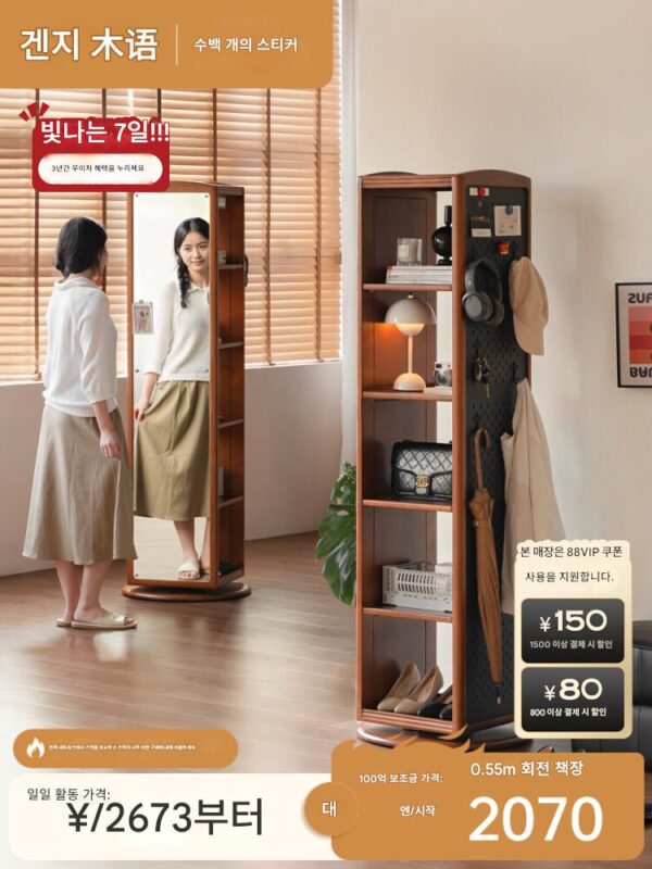 겐지우드 언어 원목 회전 책장 소형 아파트 중세 스타일 랙 홈 다기능 레트로 거울 캐비닛