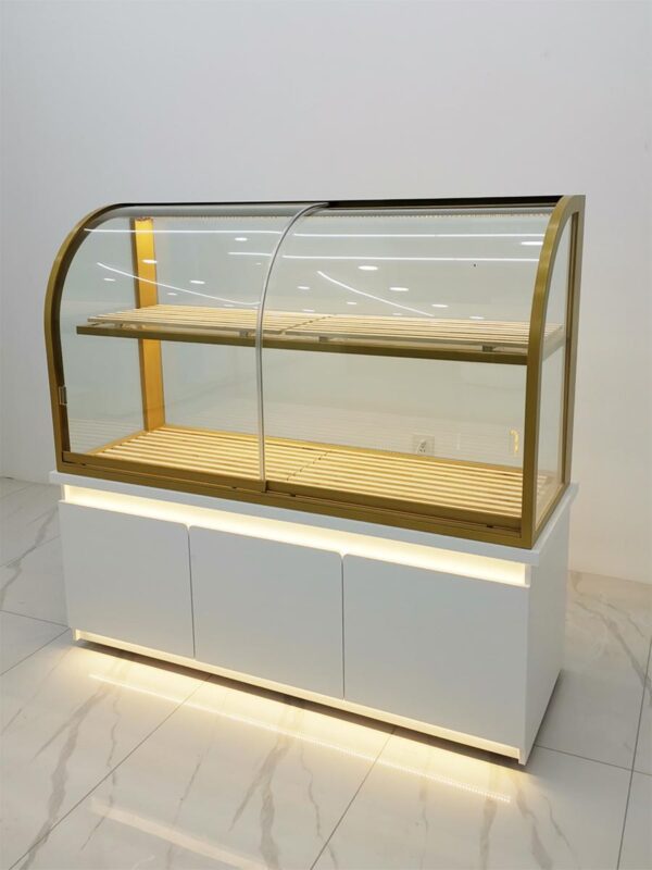 스팟 사이드 캐비닛 빵 캐비닛 신규 고급 티타늄 도금 스테인리스 스틸 아크형 아일랜드 케이크 모델 캐비닛 유리 디스플레이