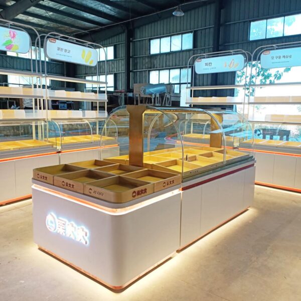 구운 음식 저장 선반 섬 캐비닛 견고한 나무 페인트 곡선형 새 말린 과일 디스플레이 캐비닛 대량 사탕 시식 디스플레이 랙