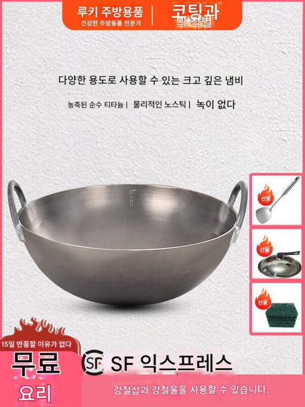 루지 더블 이어 두껍게 한 둥근 바닥 순수 티타늄 무코팅 가정용 및 상업용 중국식 요리 냄비 레스토랑 깊어지고 확대된 티타늄 냄비