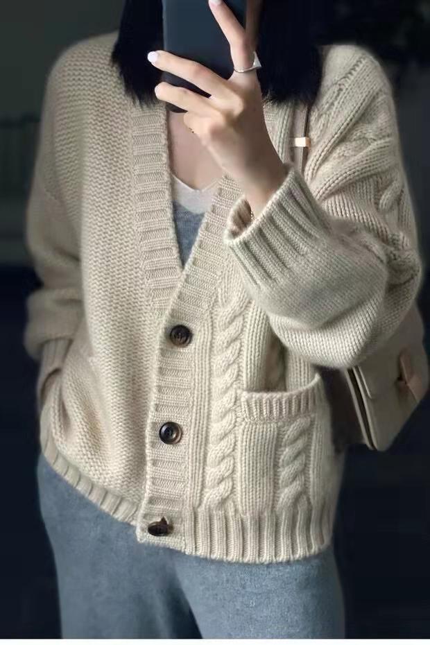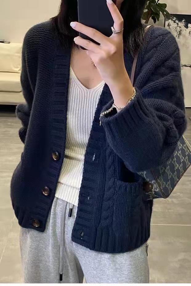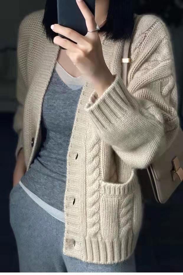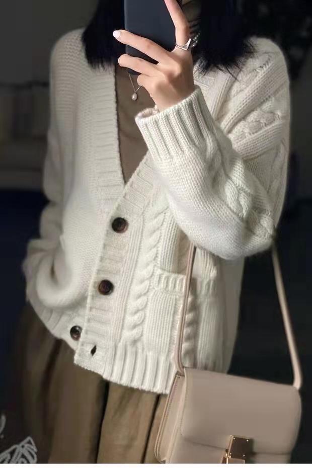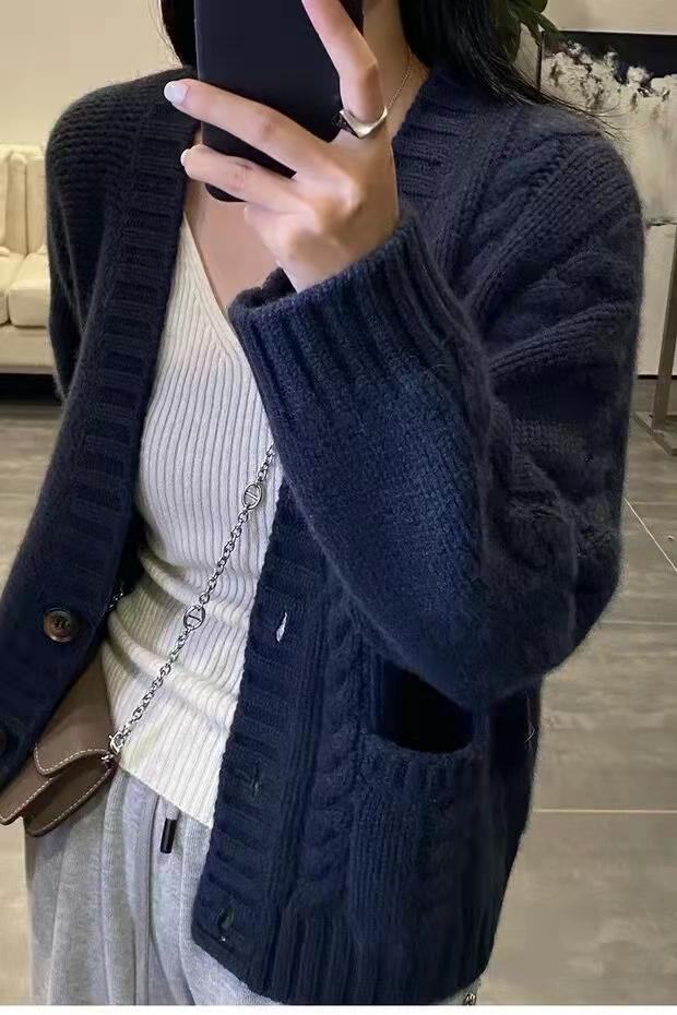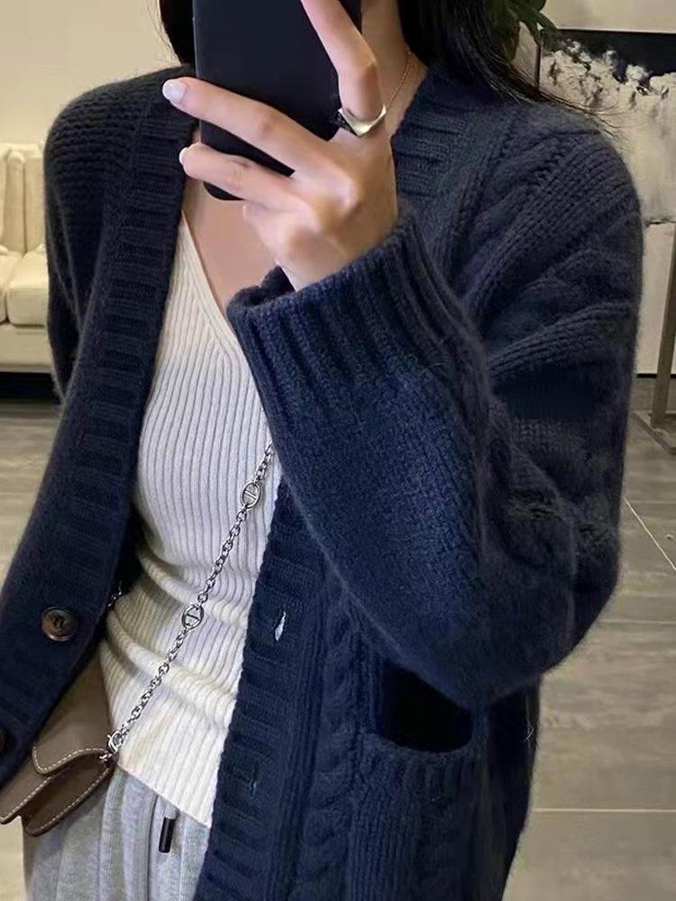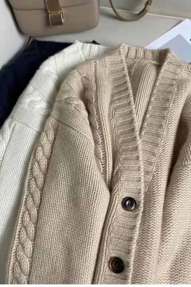 가을 겨울용 100% 순모 카디건 여성용 V넥 케이블 니트 두꺼운 스웨터 루즈한 레이지 니트 코트 맞춤 제작 가능