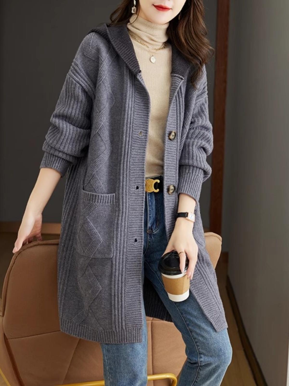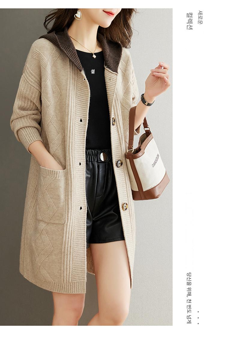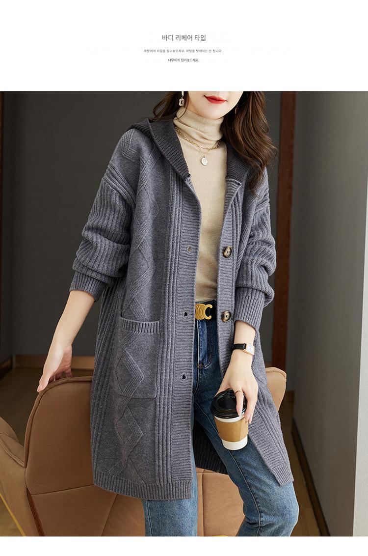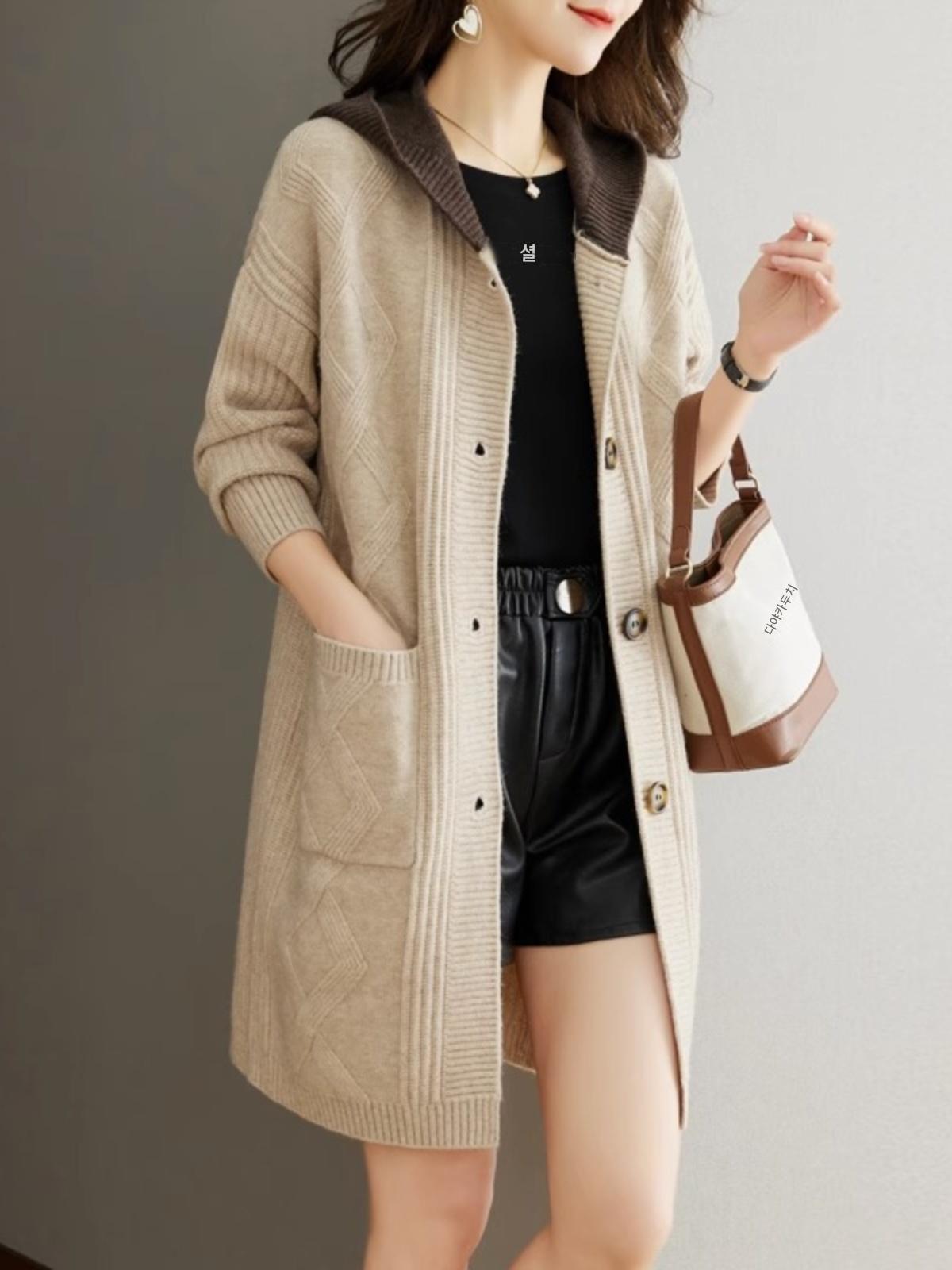 가을 후드 니트 가디건 여성 중간 길이 2024년 신상품 가을 겨울 루즈 아우터웨어 울 스웨터 코트