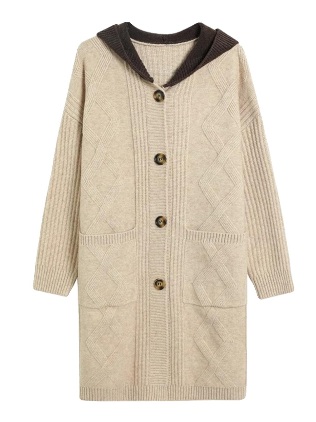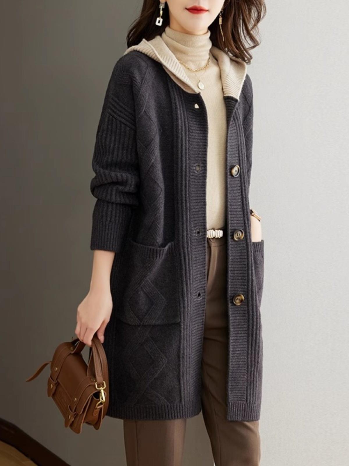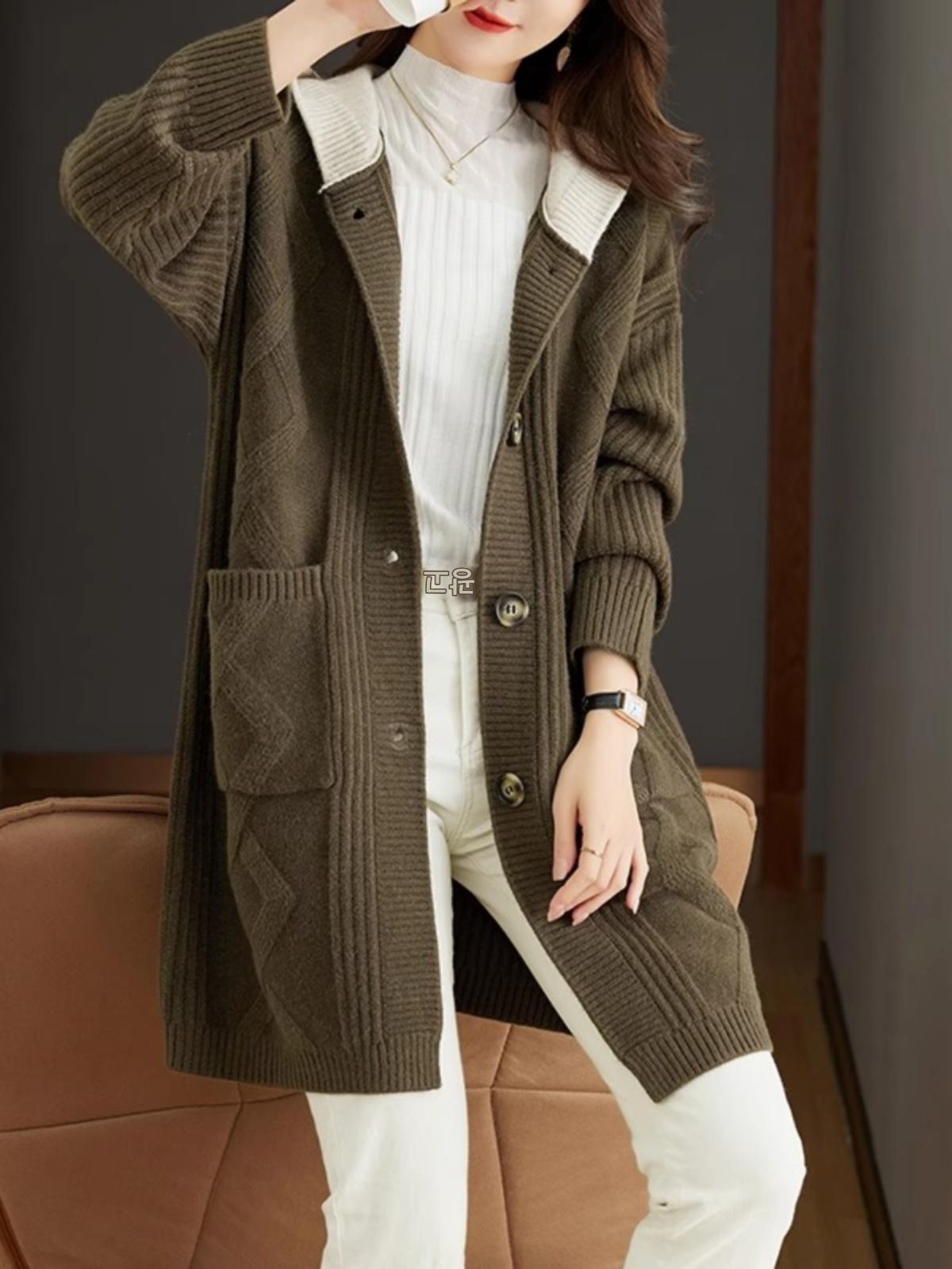 가을 후드 니트 가디건 여성 중간 길이 2024년 신상품 가을 겨울 루즈 아우터웨어 울 스웨터 코트
