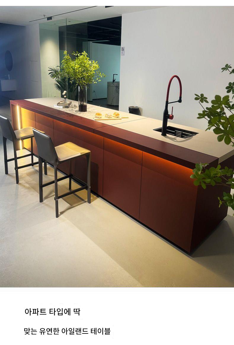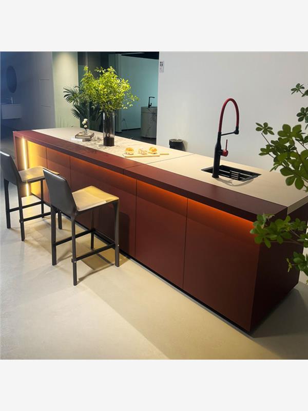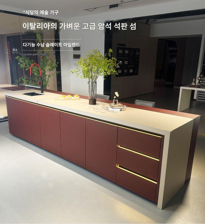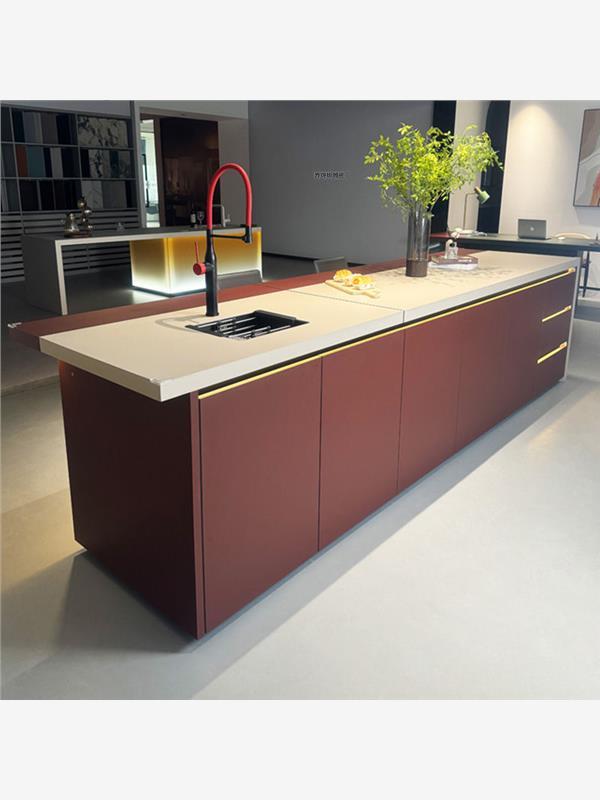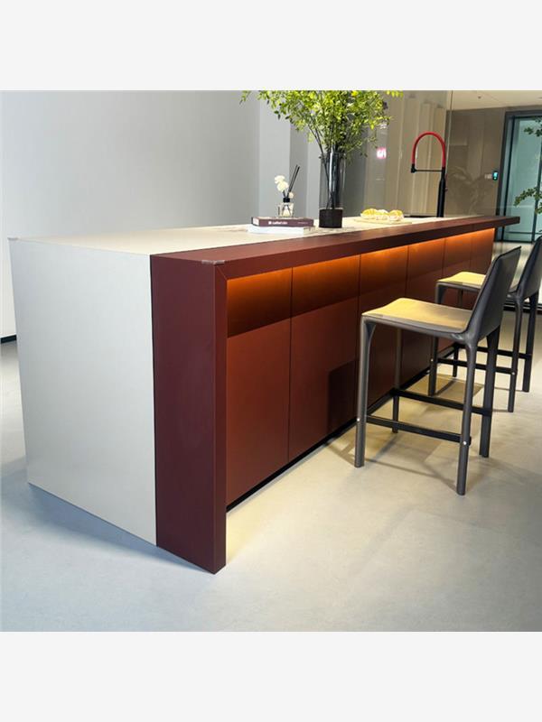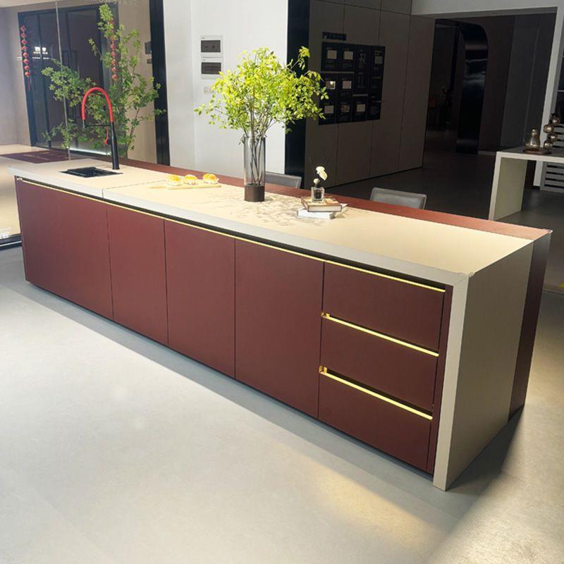 고급 맞춤형 록 슬래브 고급 센터 아일랜드 다이닝 테이블 통합 산호 레드 플러시 다기능 풀 아일랜드 레스토랑 바