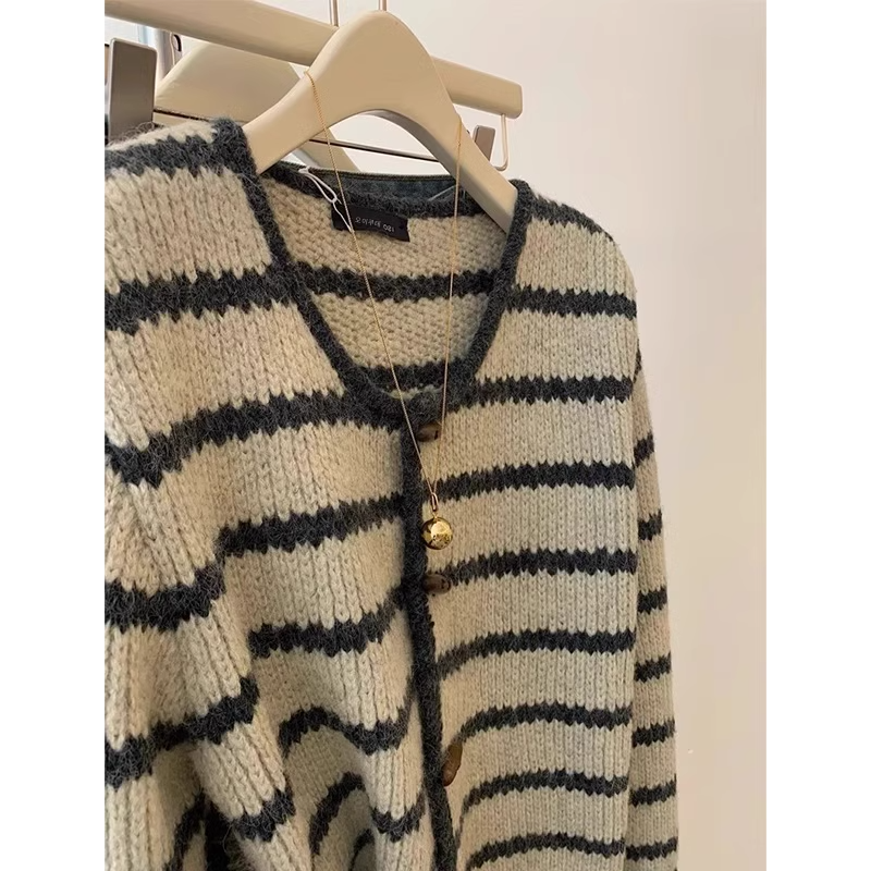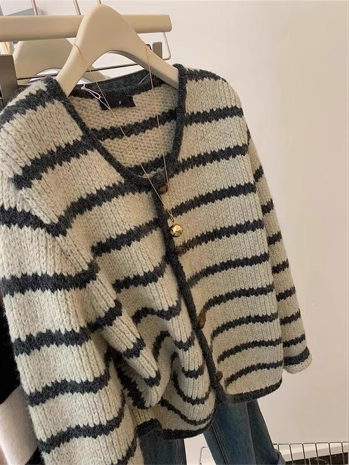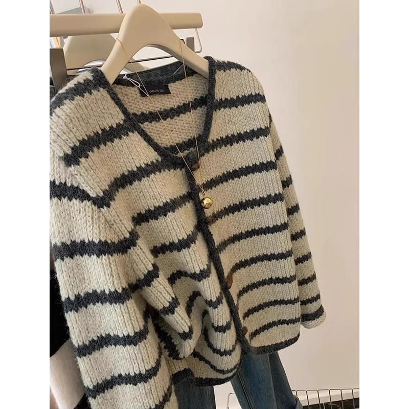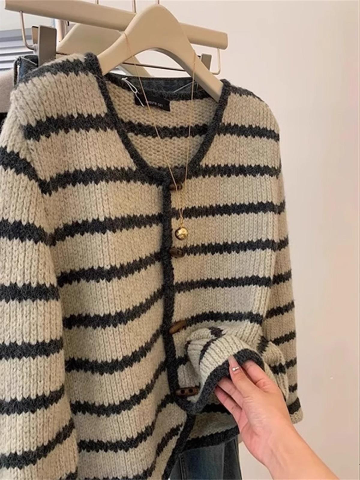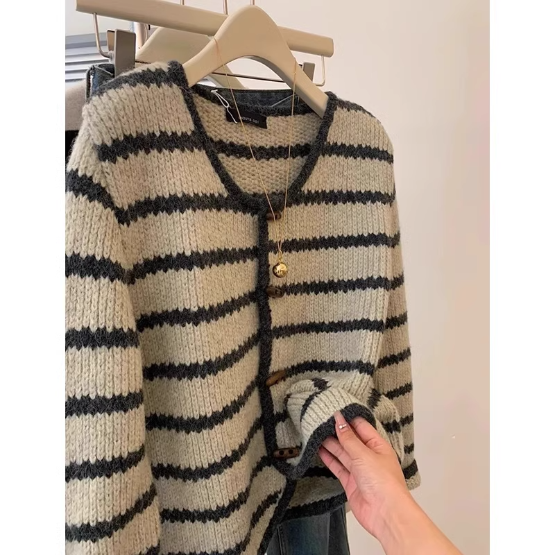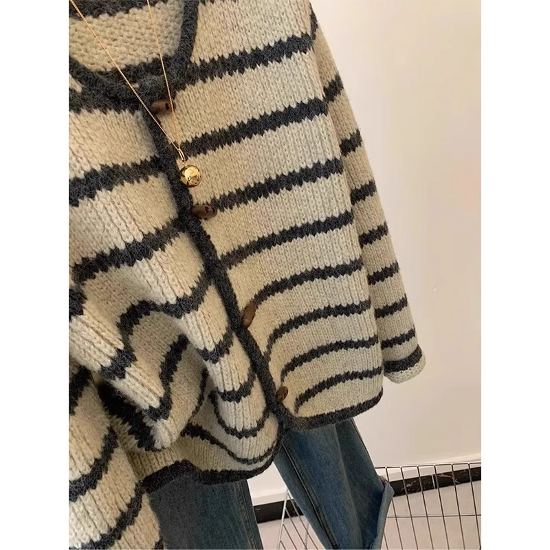 광저우 13홍 유럽 상품 레트로 스트라이프 스웨터 재킷 여성 가을 ​​겨울 레이지 스타일 뿔 단추 V넥 니트 카디건
