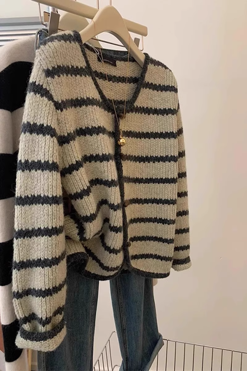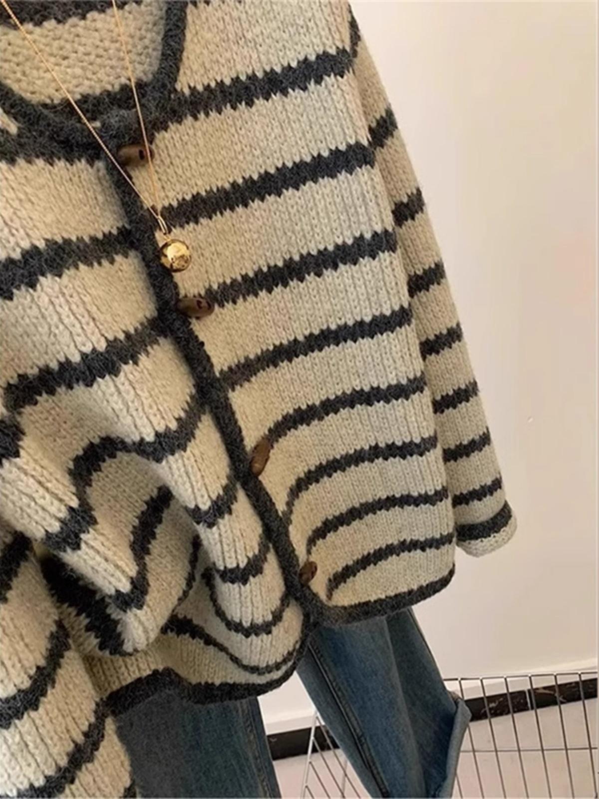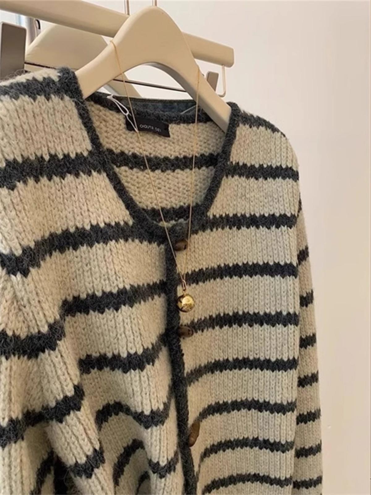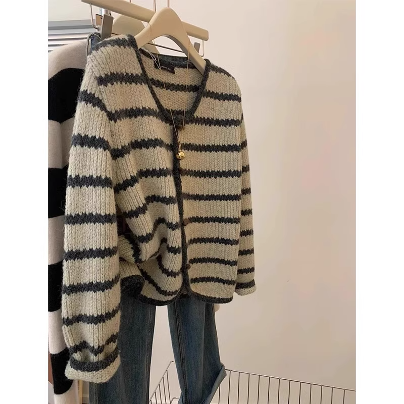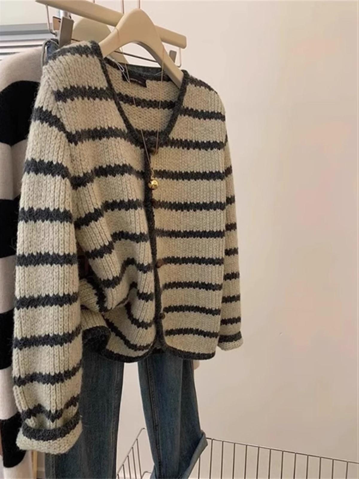 광저우 13홍 유럽 상품 레트로 스트라이프 스웨터 재킷 여성 가을 ​​겨울 레이지 스타일 뿔 단추 V넥 니트 카디건