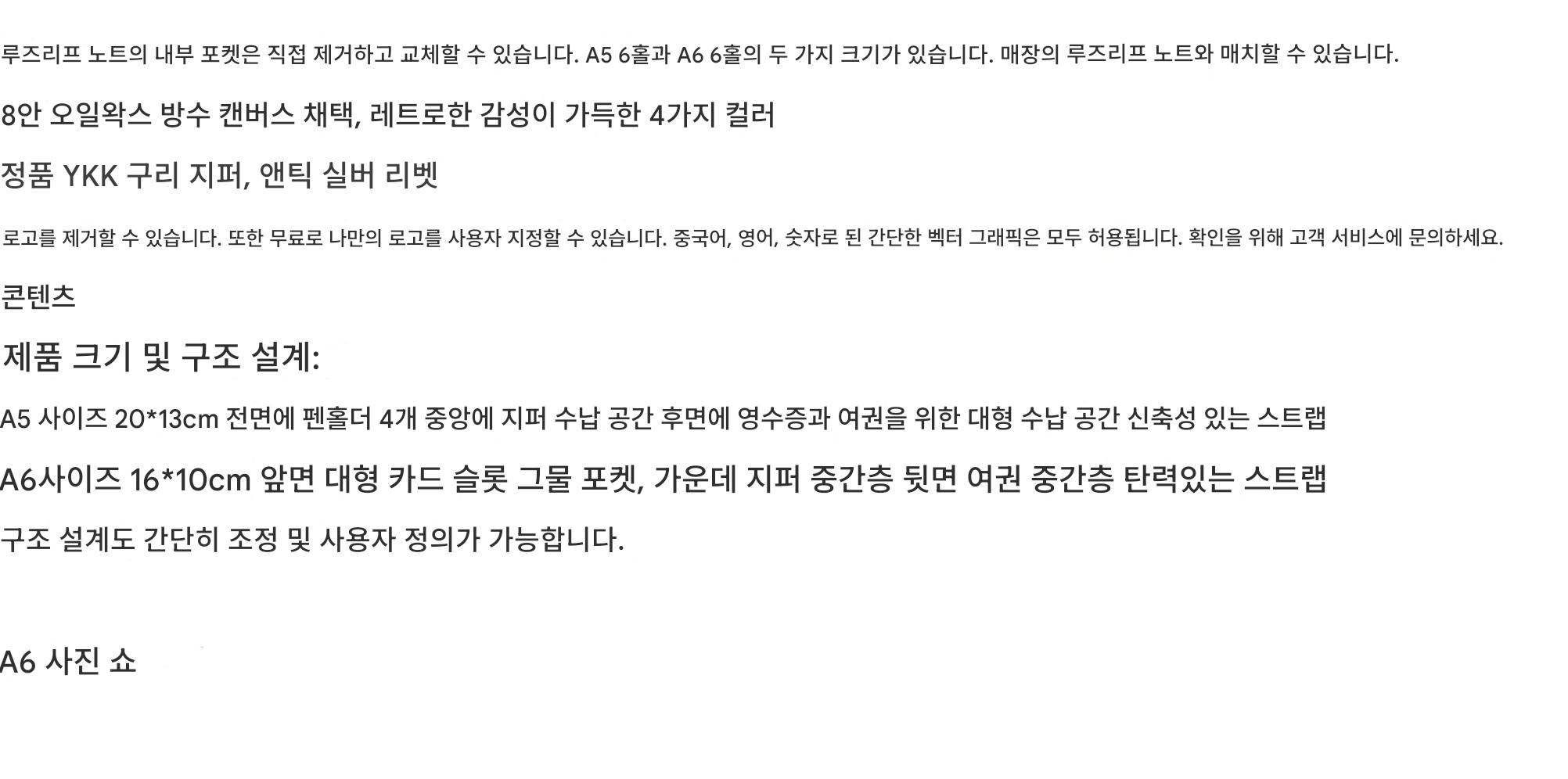 교체 가능한 캔버스 내부 포켓, 내부 코어, 보관장, 여권 가방, 카드북, 펜 가방, 다기능 A5 A6 노트북