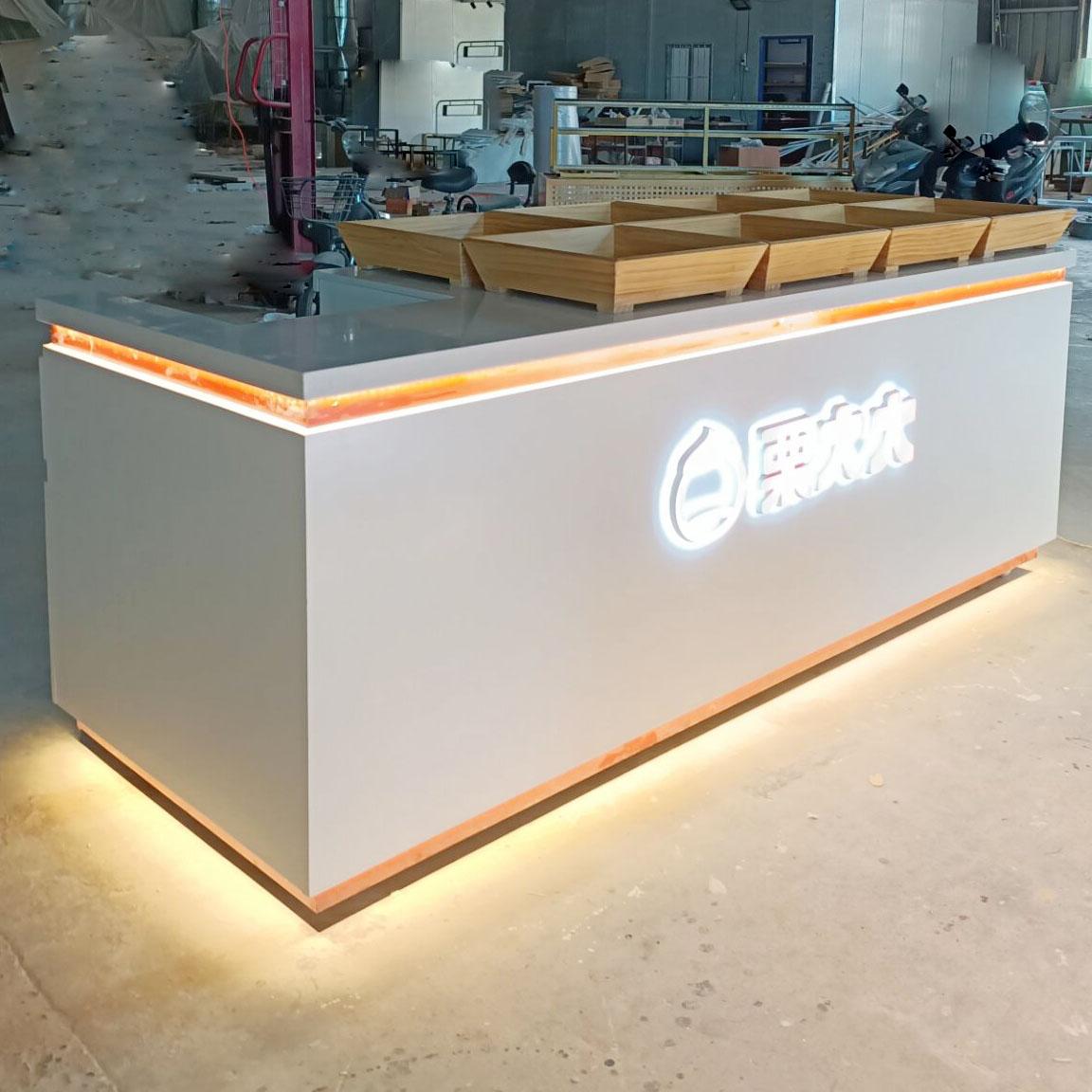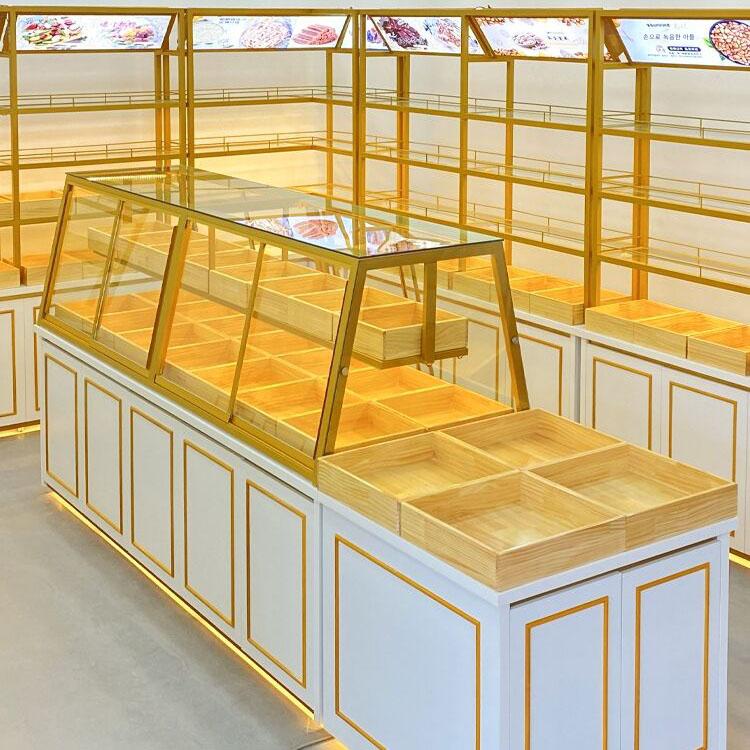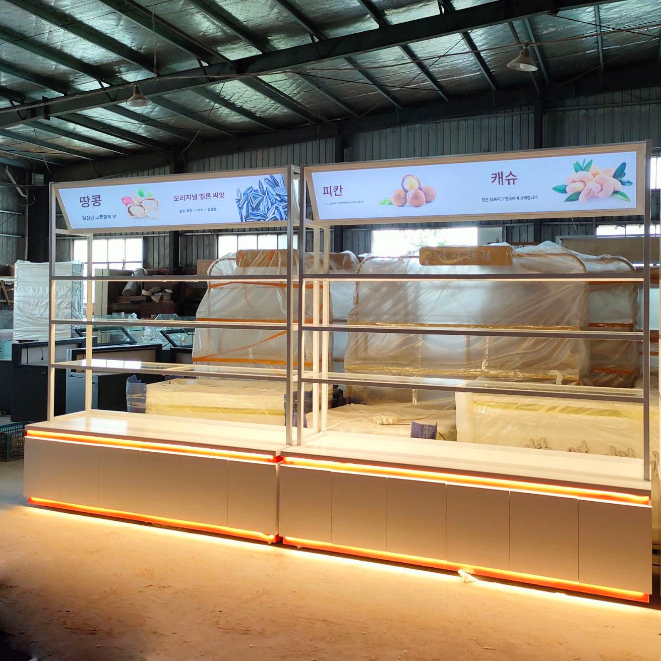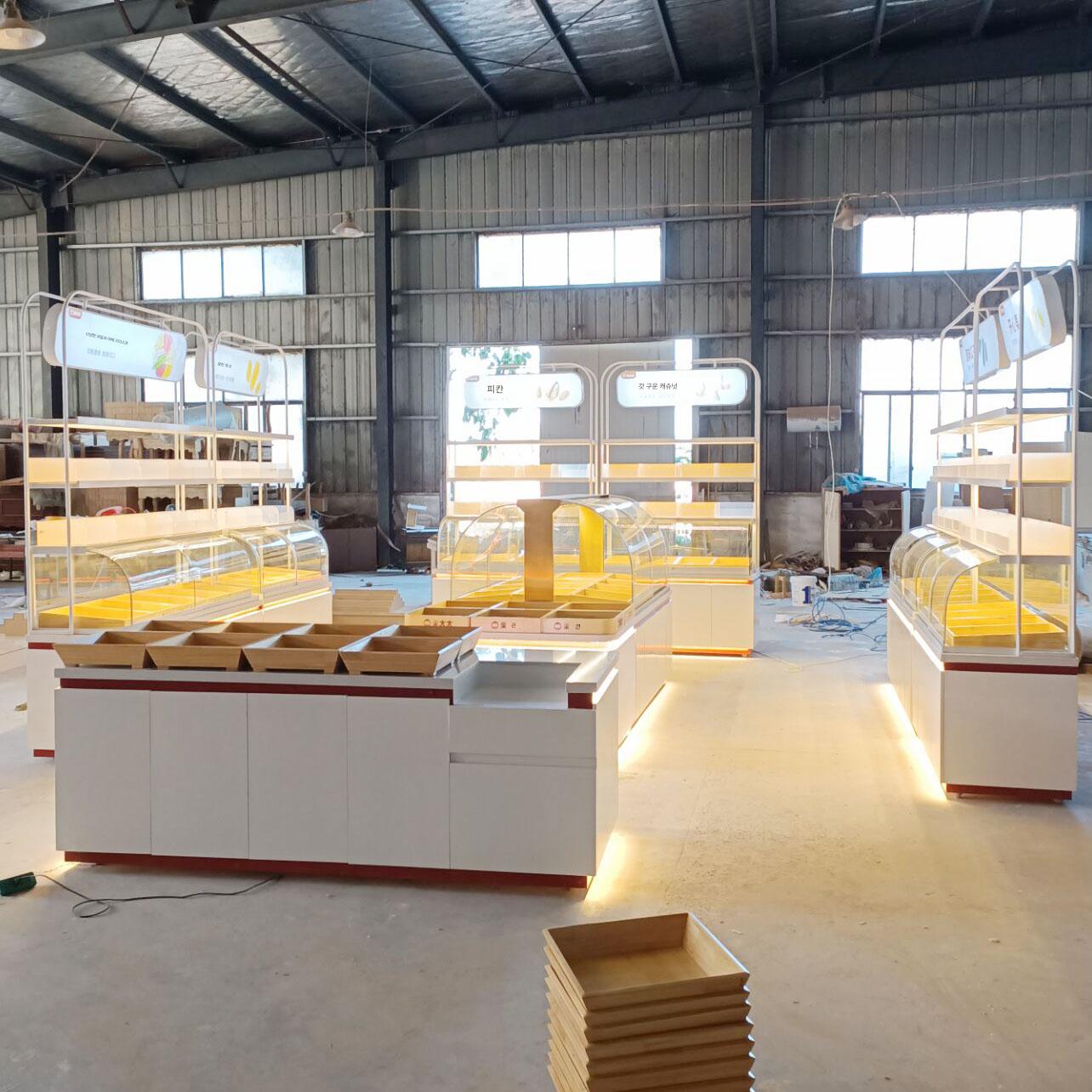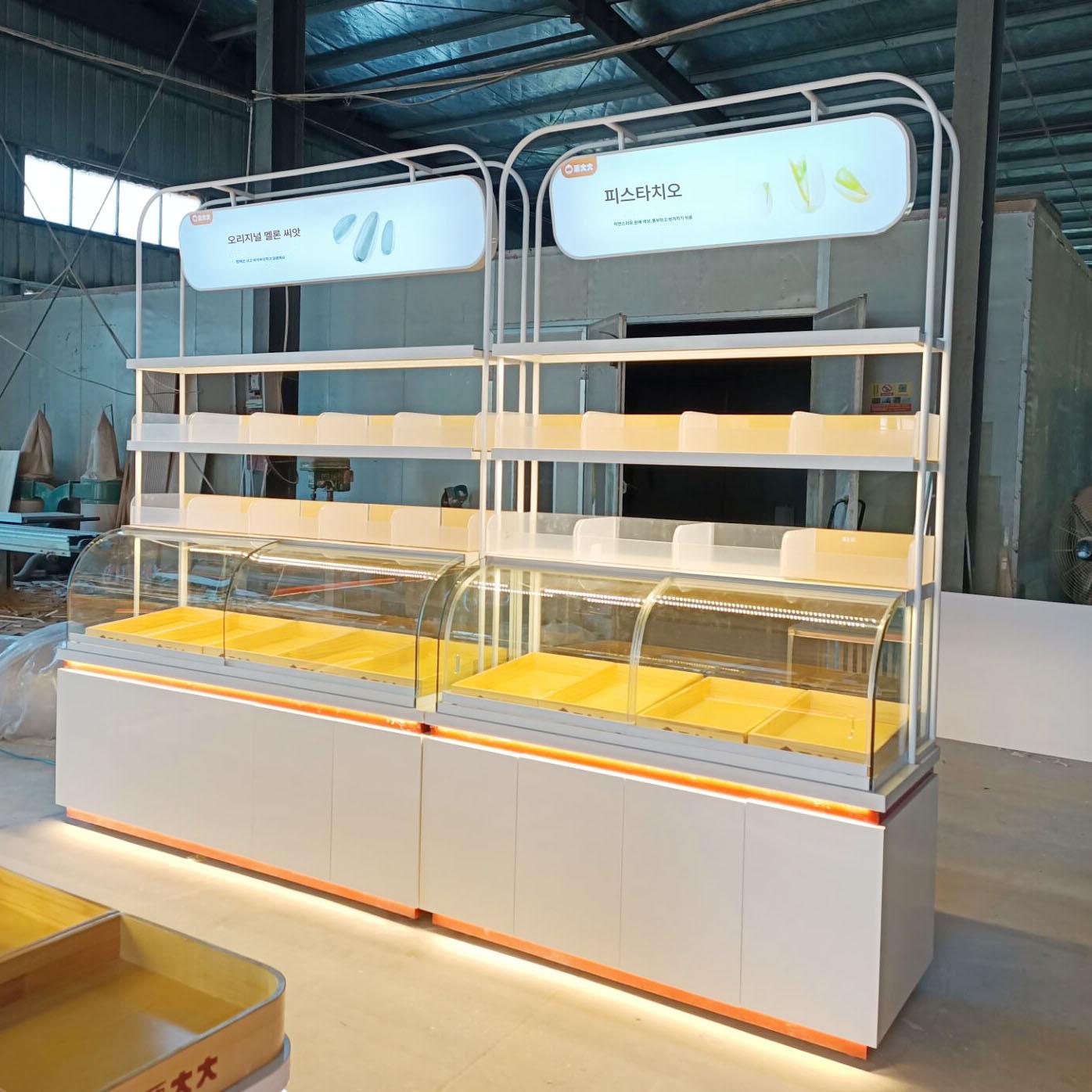 구운 음식 저장 선반 섬 캐비닛 견고한 나무 페인트 곡선형 새 말린 과일 디스플레이 캐비닛 대량 사탕 시식 디스플레이 랙