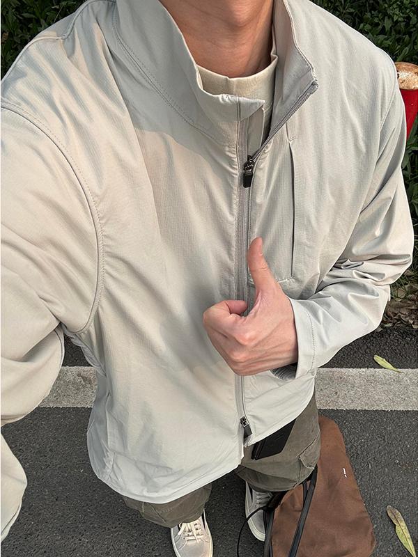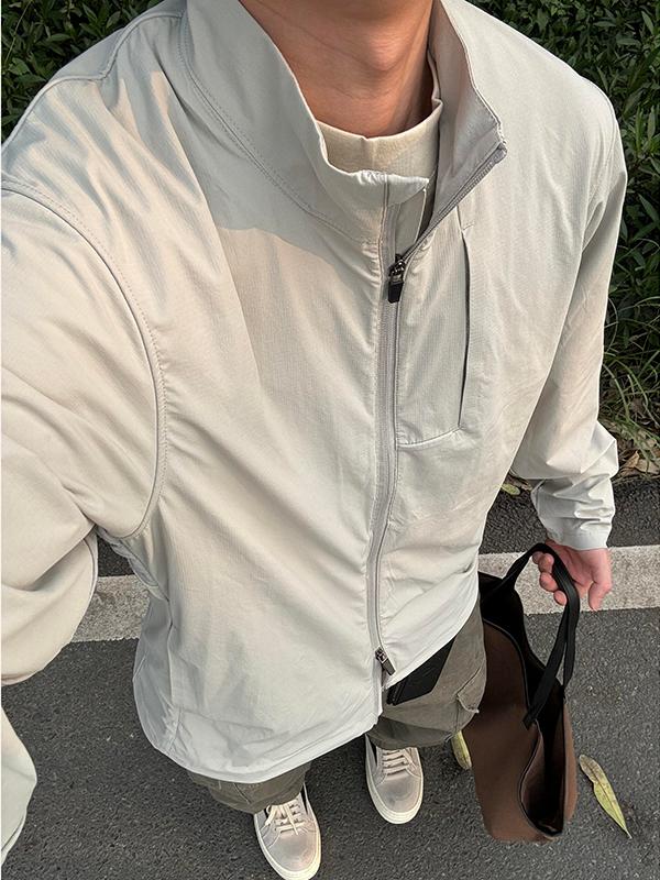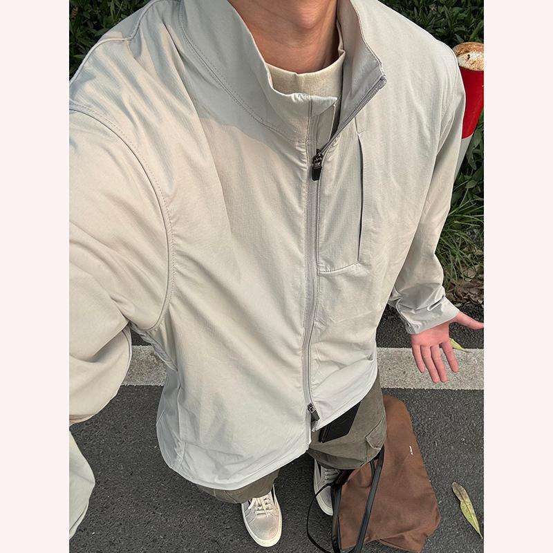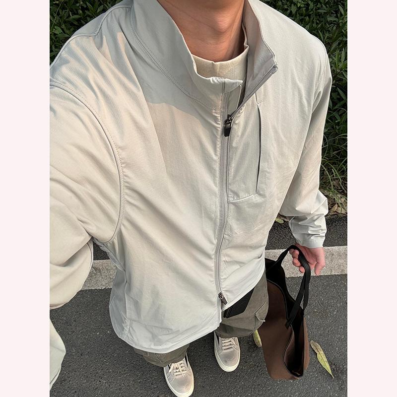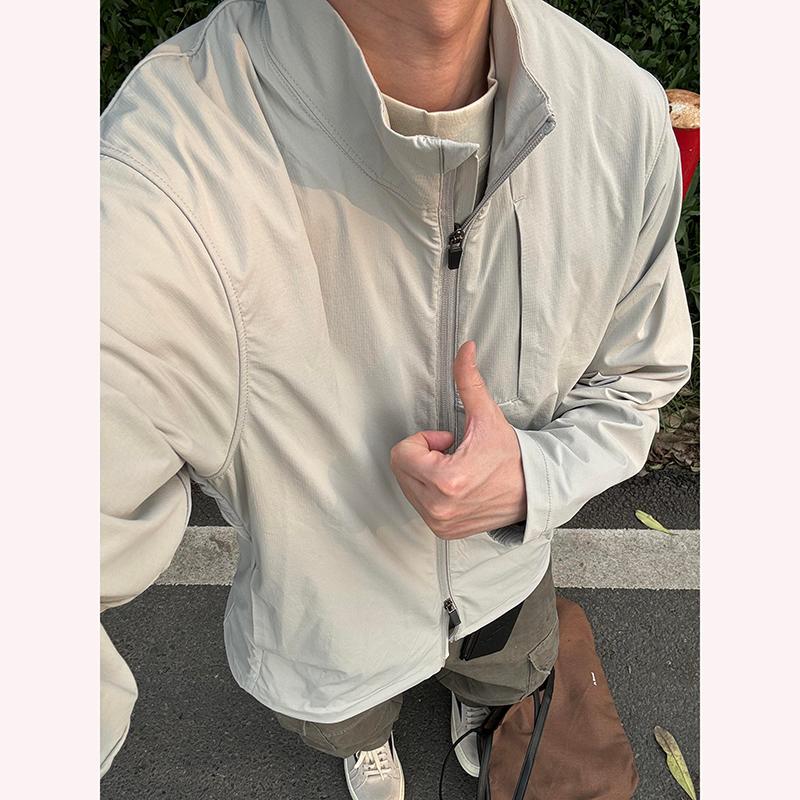 그레이 스탠드 칼라 숏 재킷 남성 가을 아웃도어 스트리트 소프트 쉘 재킷 고급 미국산 속건 재킷