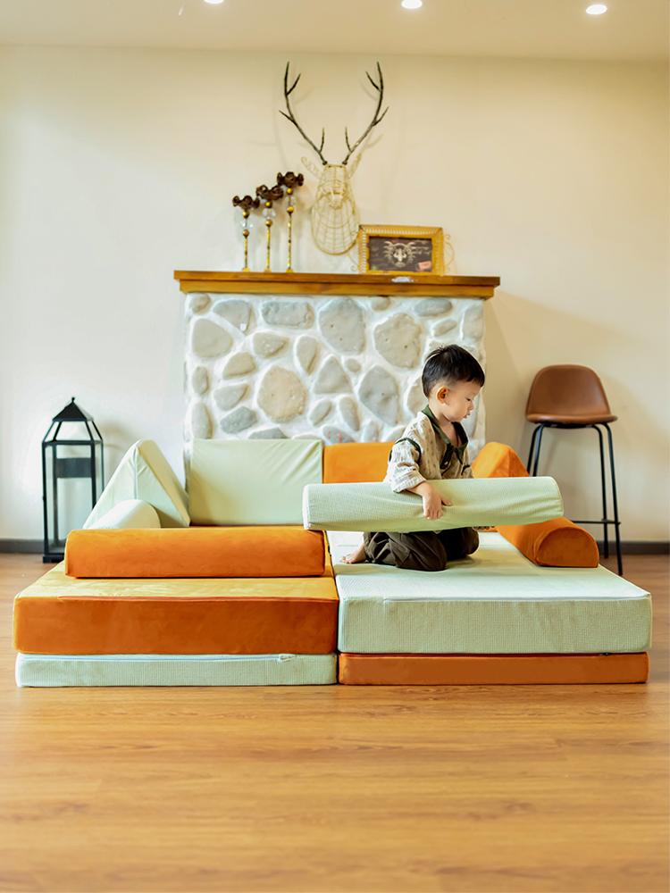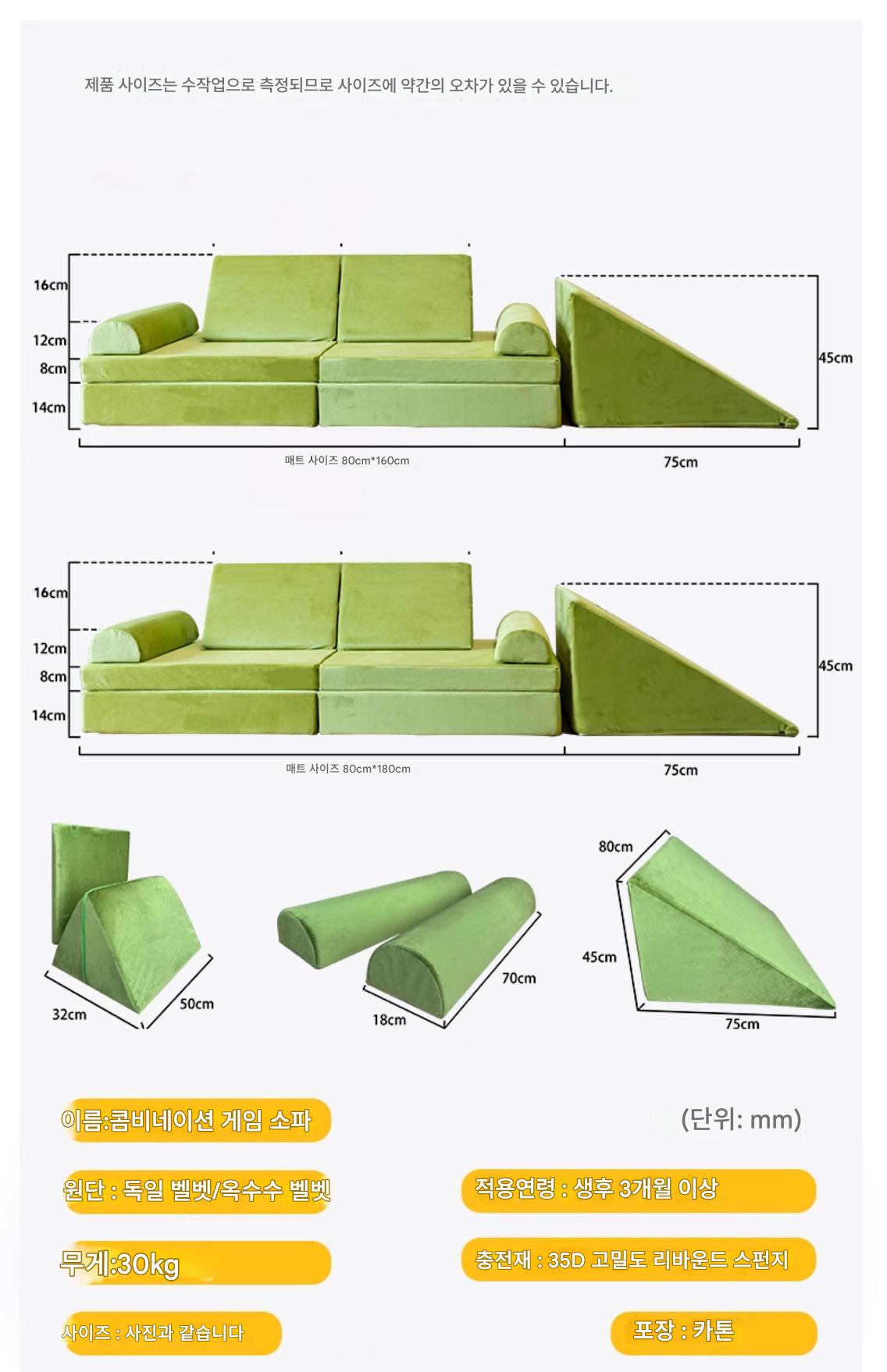草绿色-晨雾之森 德国绒 > 厚垫1个+薄垫1个+三角枕2个+扶手2个+滑梯一个(80cm*180cm)