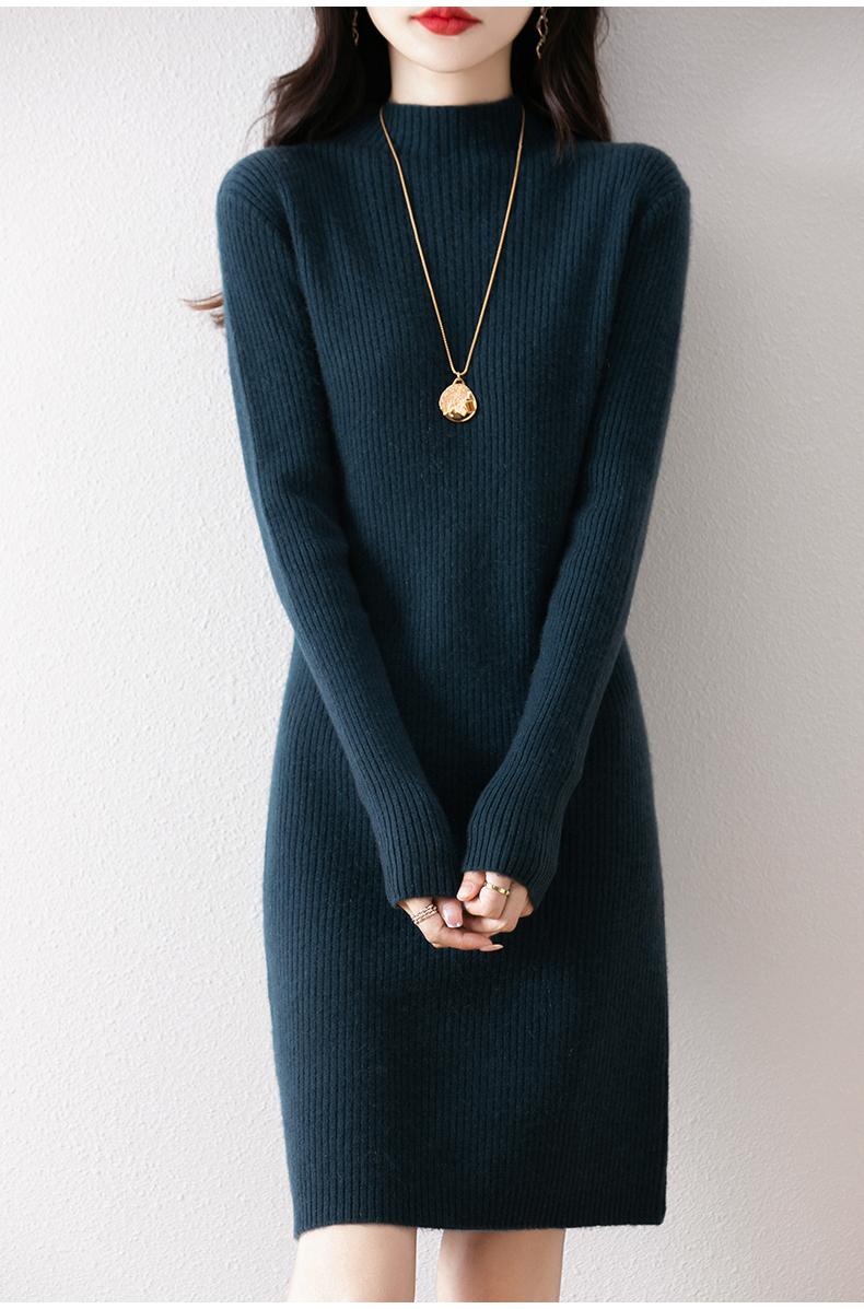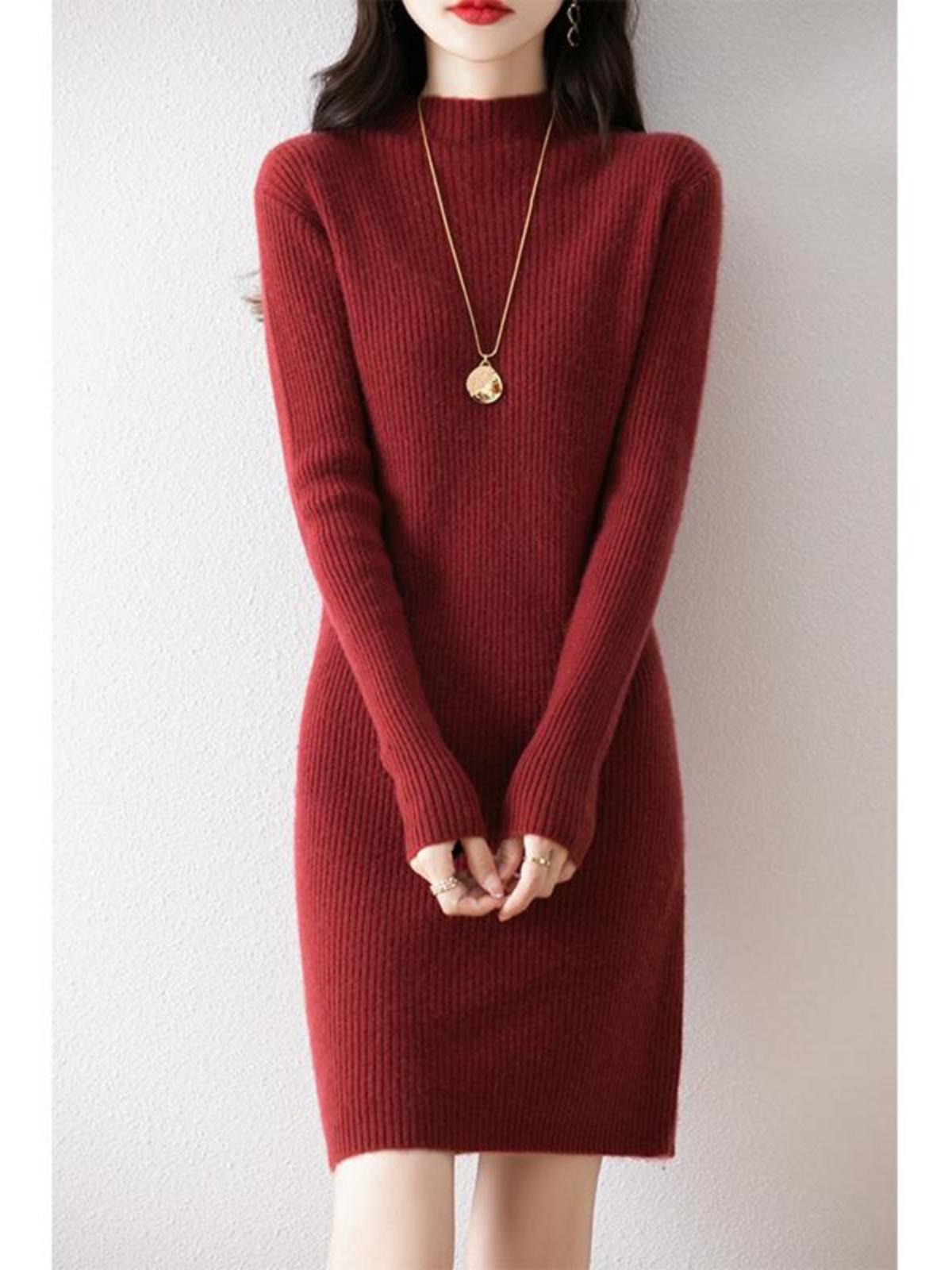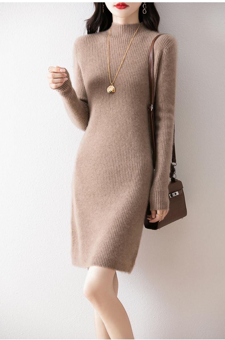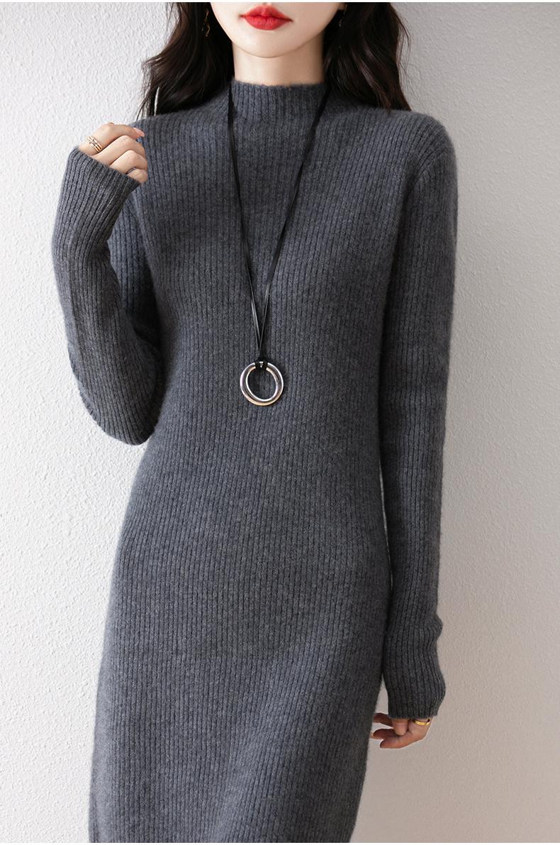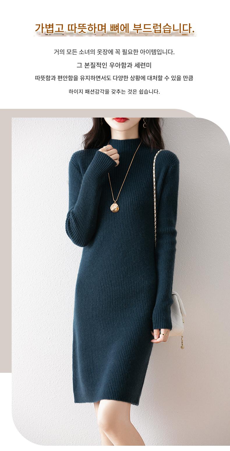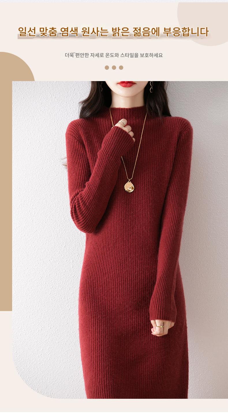 니트 원피스, 부드럽고 몸에 꼭 맞는 스웨터, 중간 길이, 반 높이 칼라, 여성용 100% 순수 울 힙 스커트