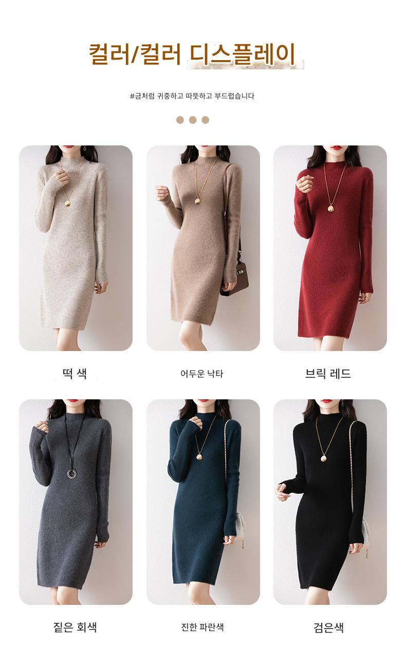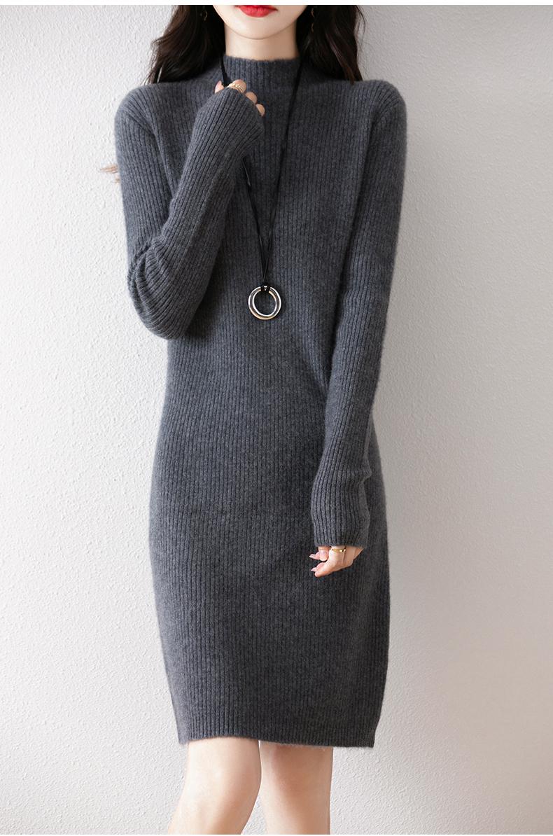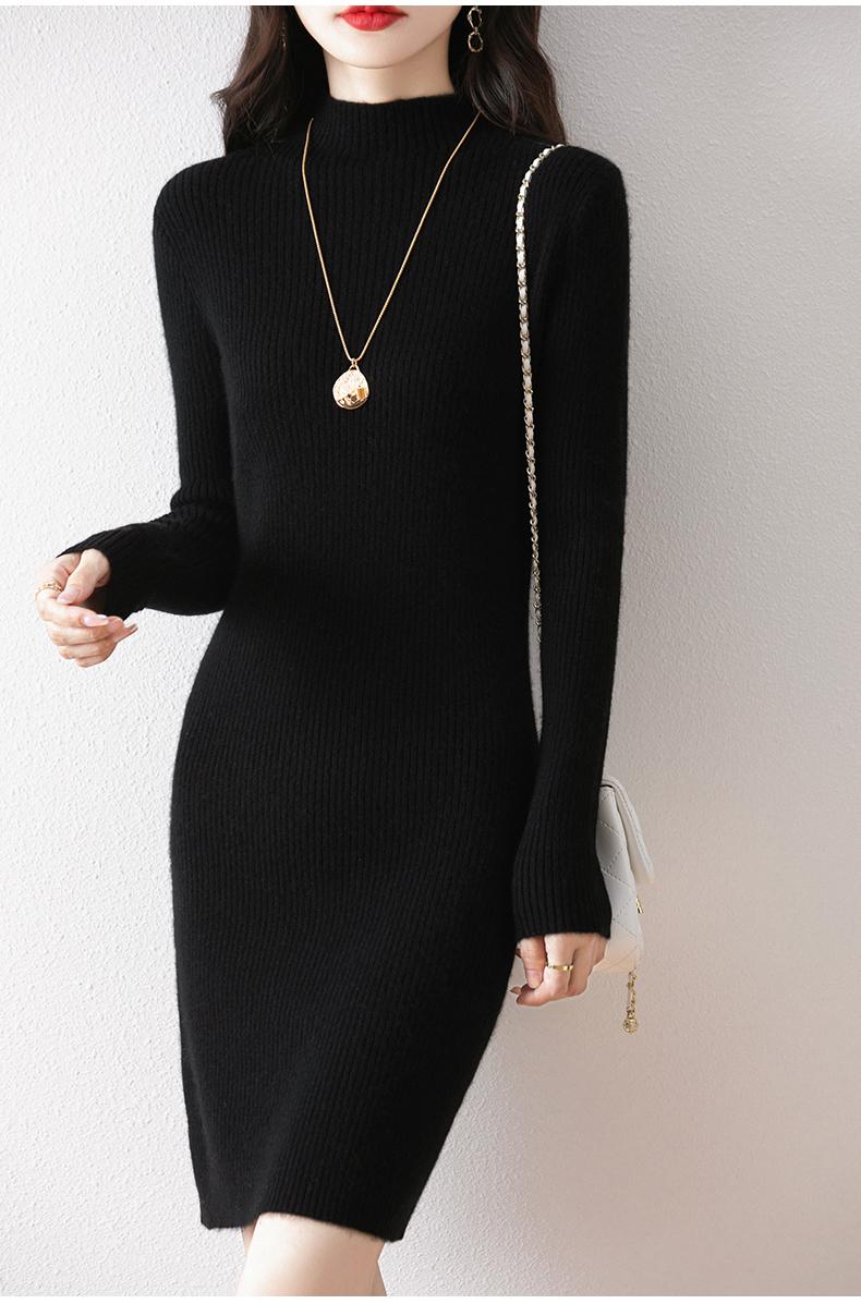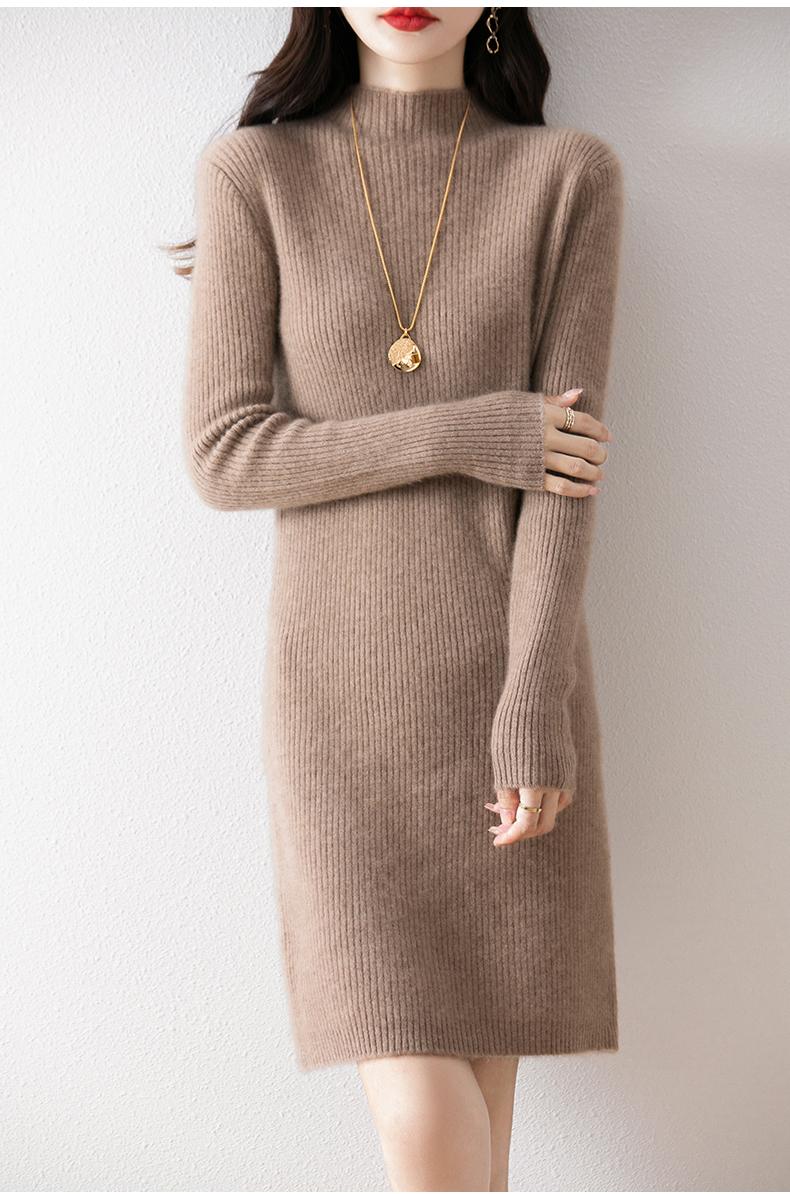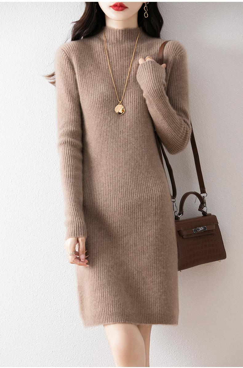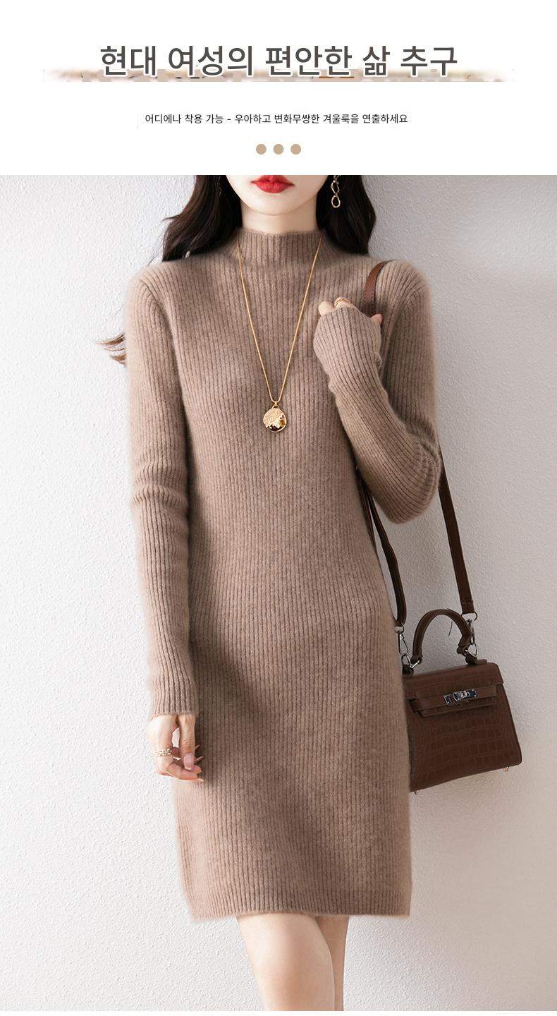 니트 원피스, 부드럽고 몸에 꼭 맞는 스웨터, 중간 길이, 반 높이 칼라, 여성용 100% 순수 울 힙 스커트