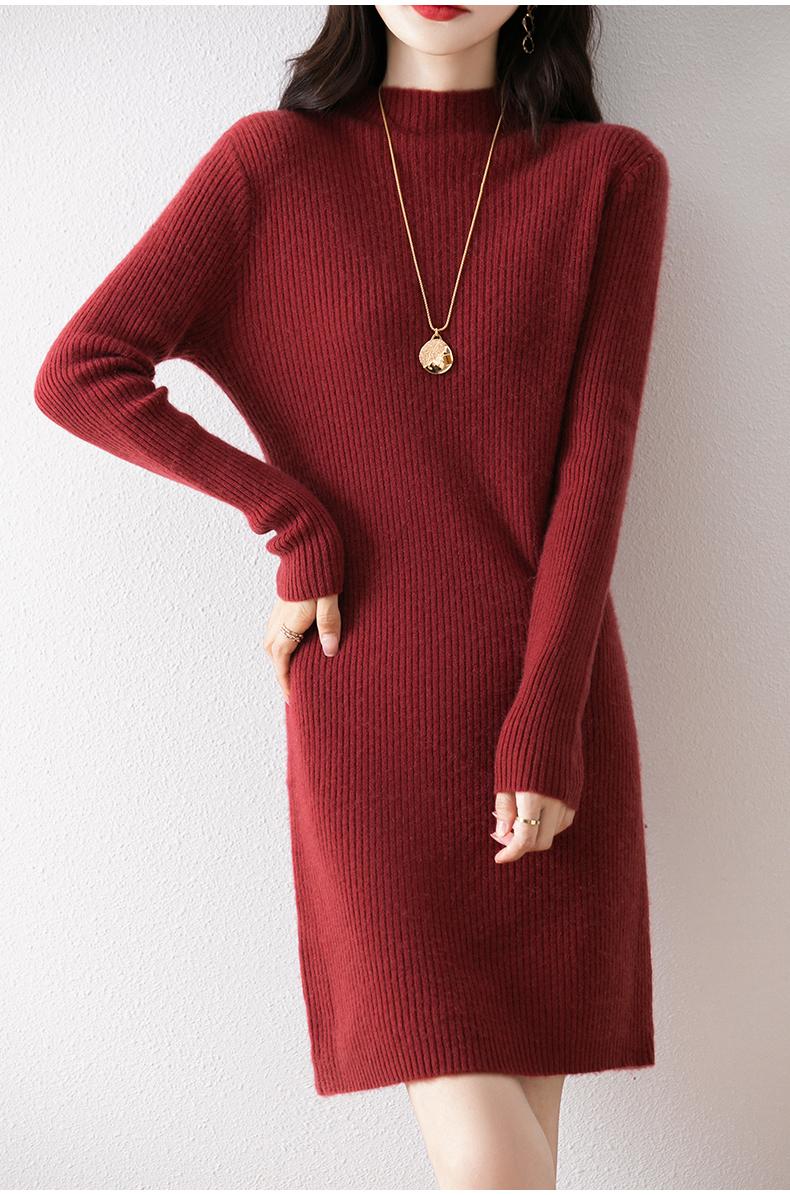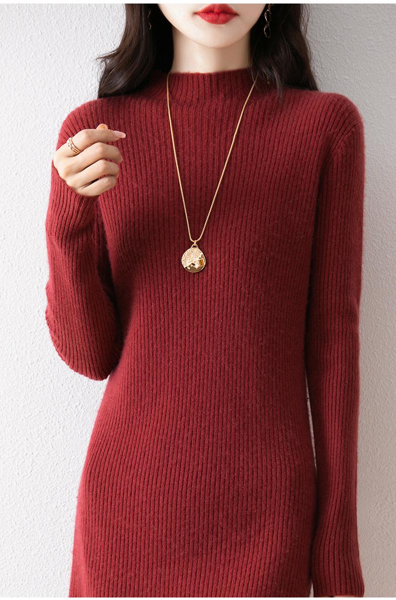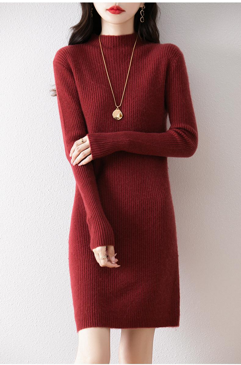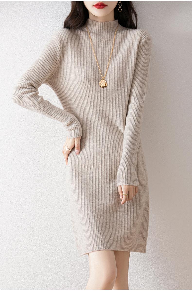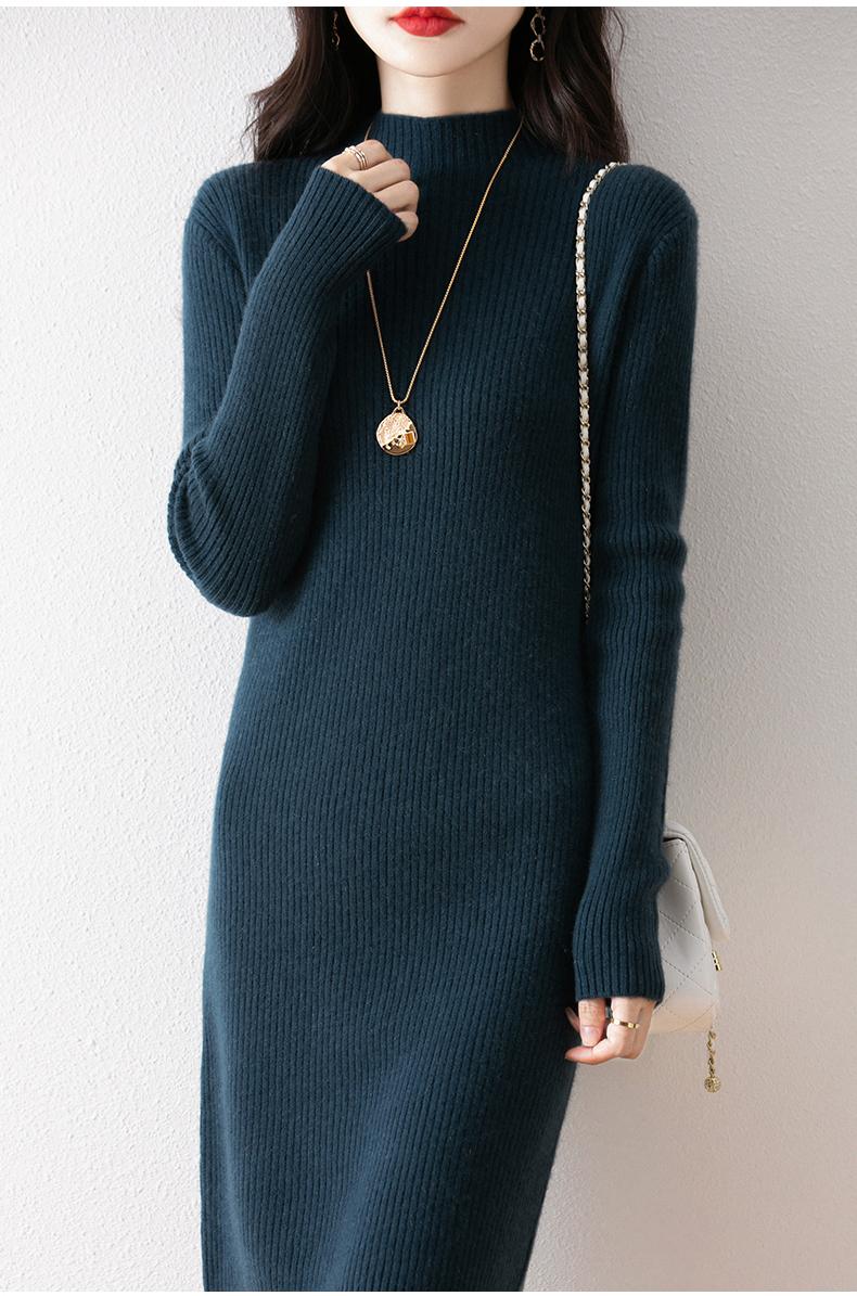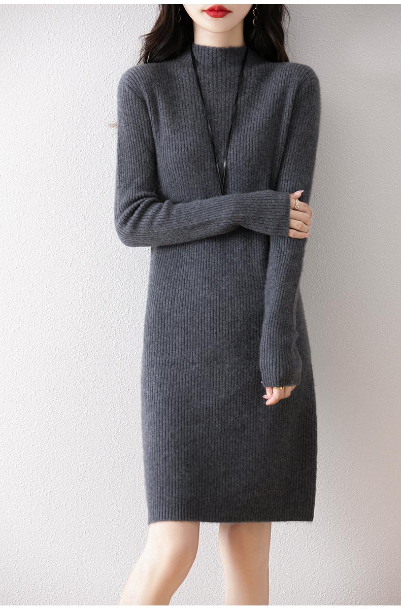 니트 원피스, 부드럽고 몸에 꼭 맞는 스웨터, 중간 길이, 반 높이 칼라, 여성용 100% 순수 울 힙 스커트