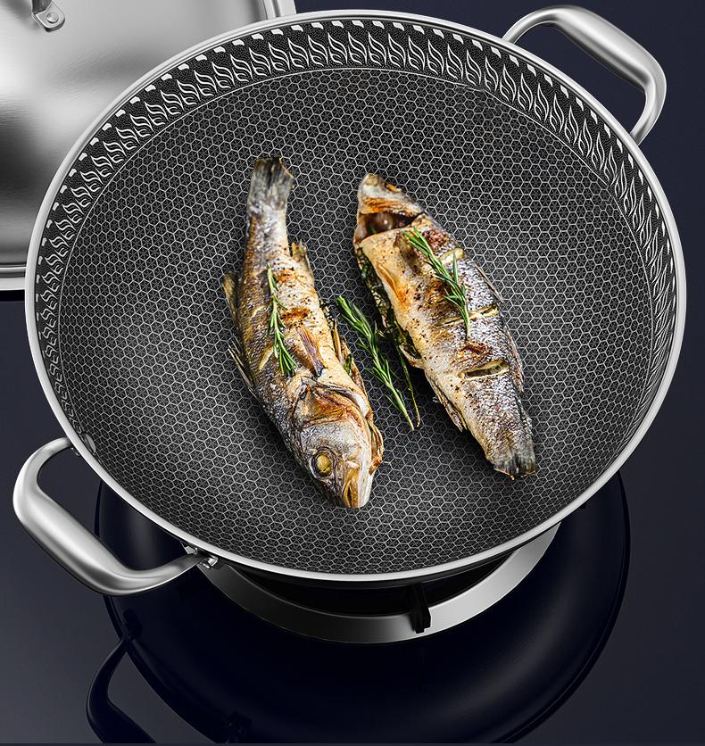 독일 수출 316 스테인레스 스틸 더블 이어 대형 프라이팬 노스틱 팬 둥근 바닥 팬 핫팟 가스 오목 전자기파