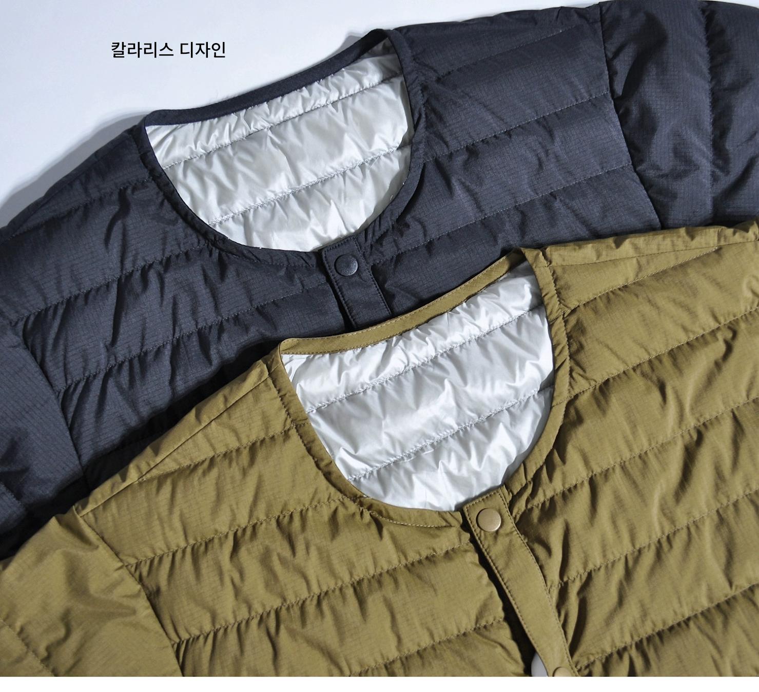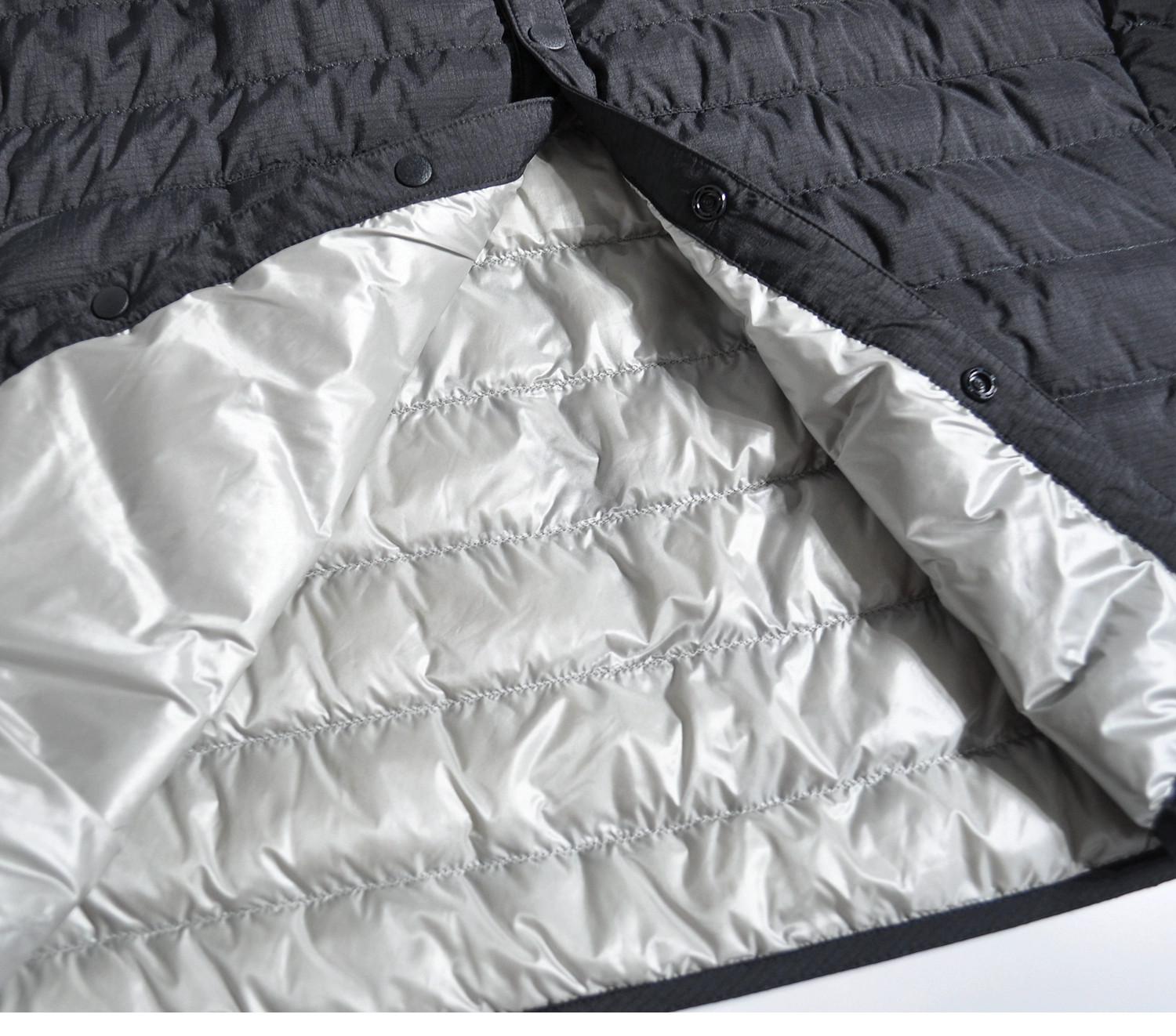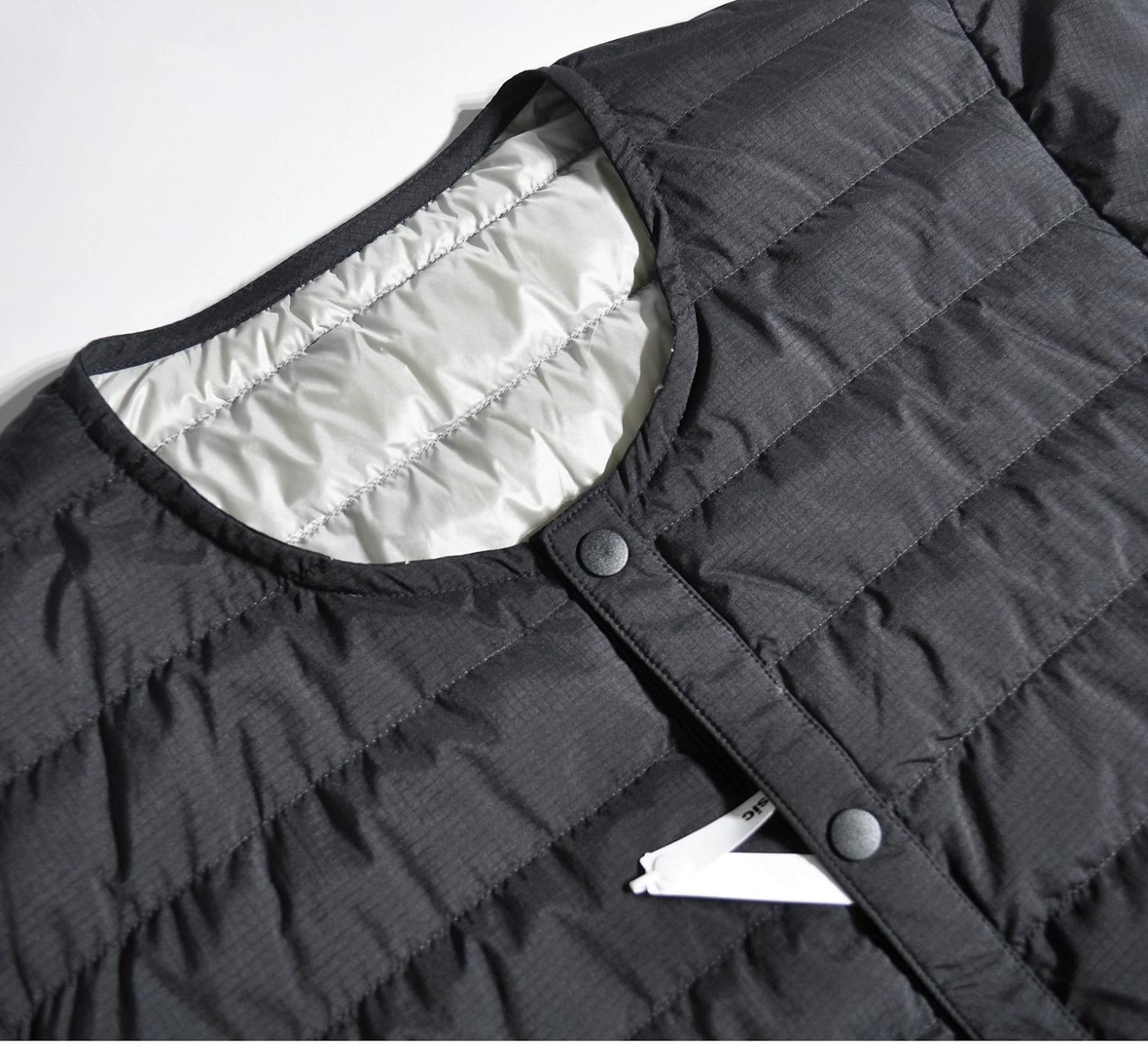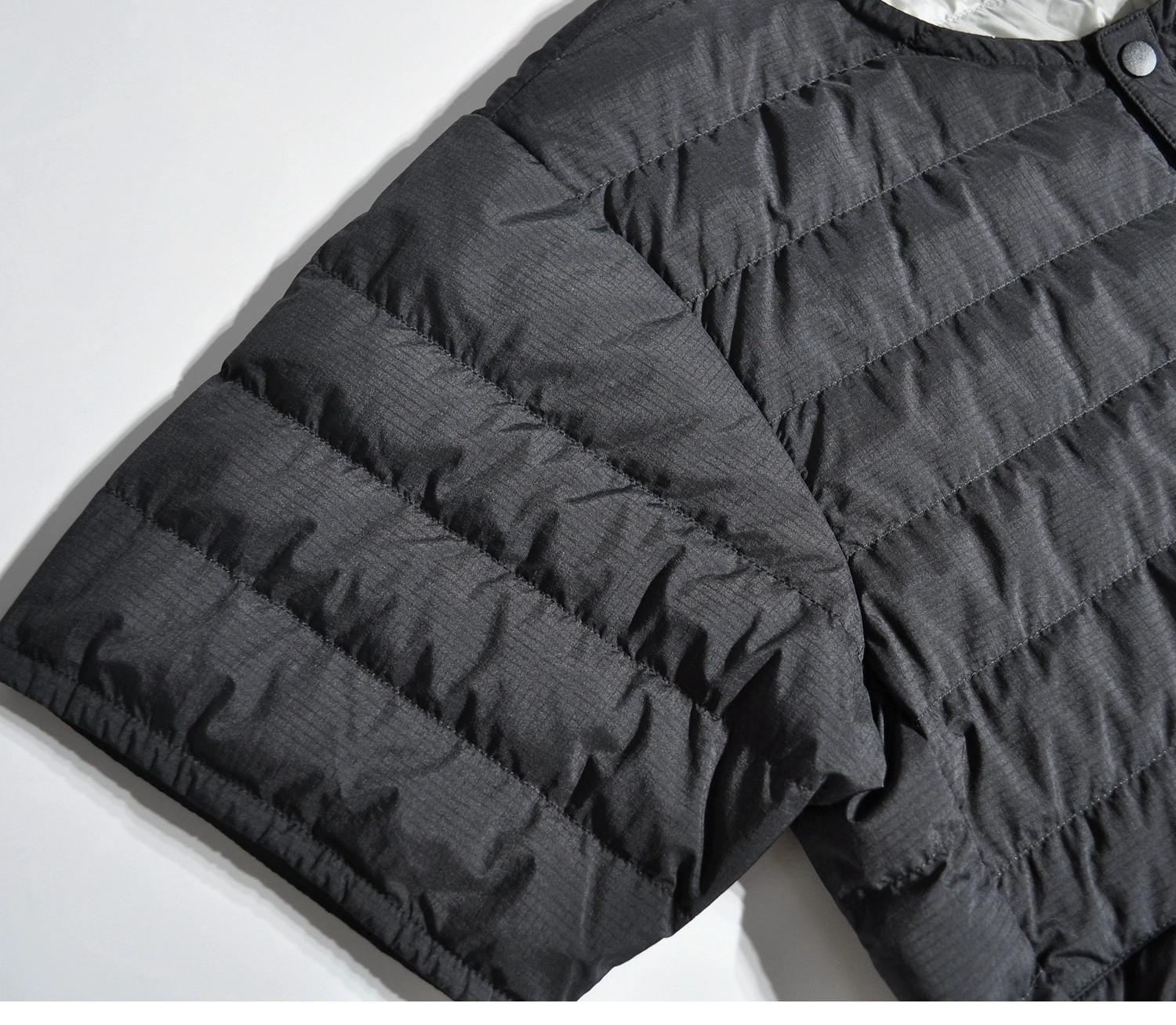 따뜻한 안감이 들어간 일본식 복고풍 산악 스타일 야외용 경량 흰색 덕다운 재킷, 짧은 소매의 겹쳐진 칼라 없는 짧은 소매 겉옷.