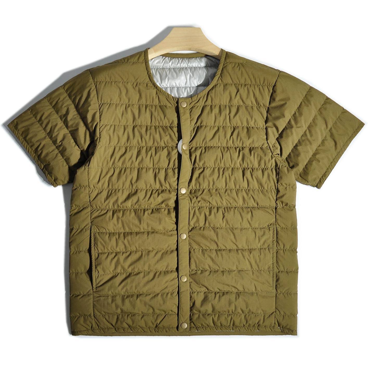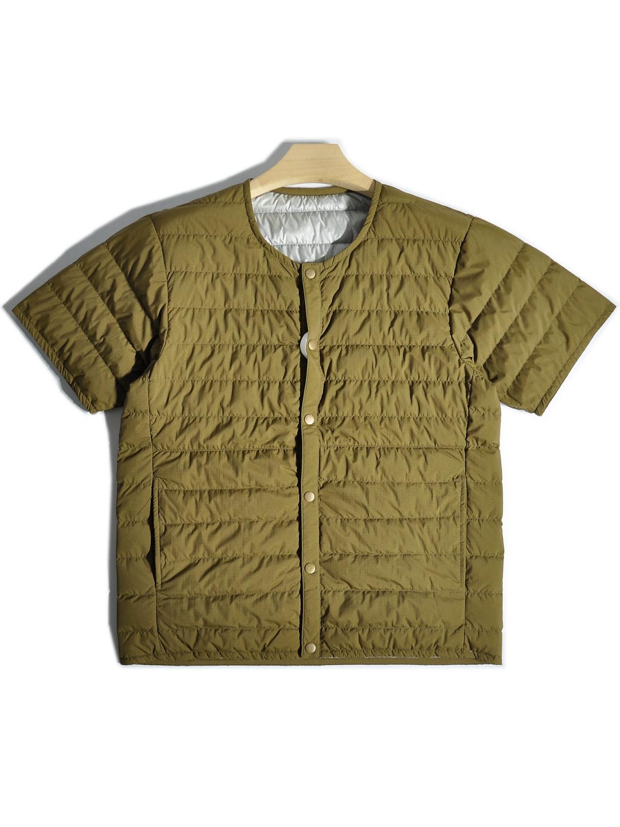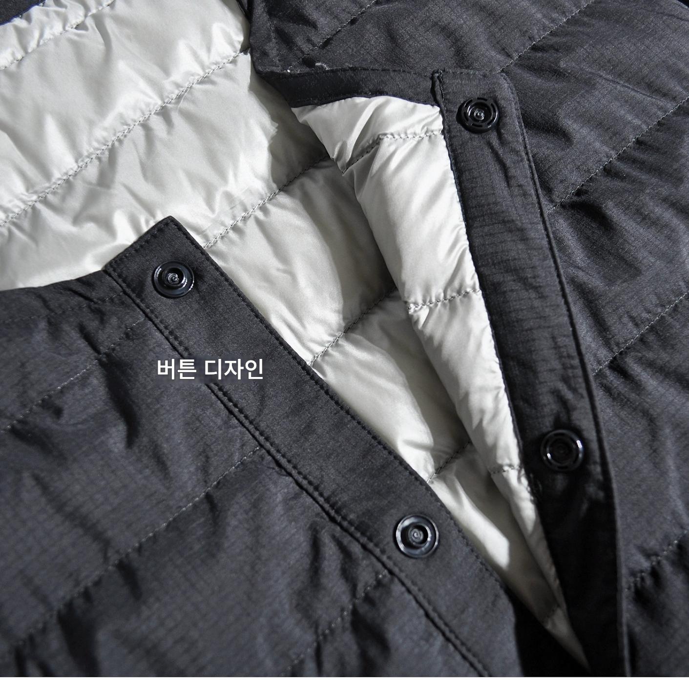 따뜻한 안감이 들어간 일본식 복고풍 산악 스타일 야외용 경량 흰색 덕다운 재킷, 짧은 소매의 겹쳐진 칼라 없는 짧은 소매 겉옷.