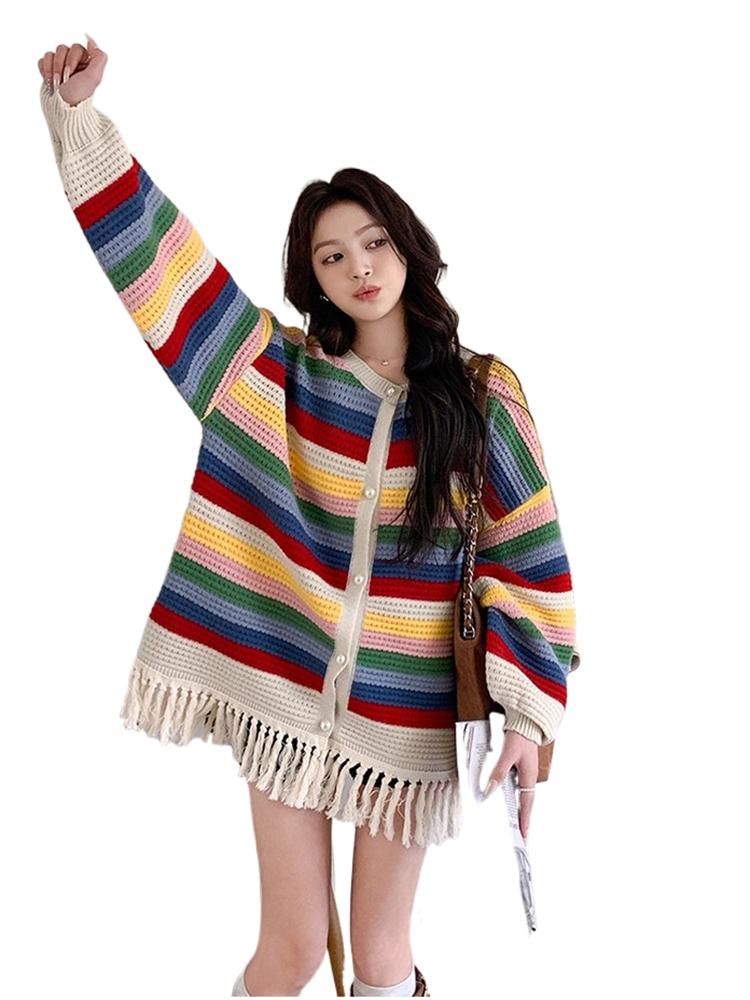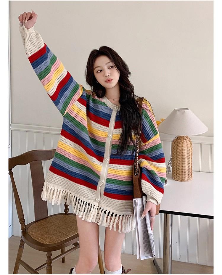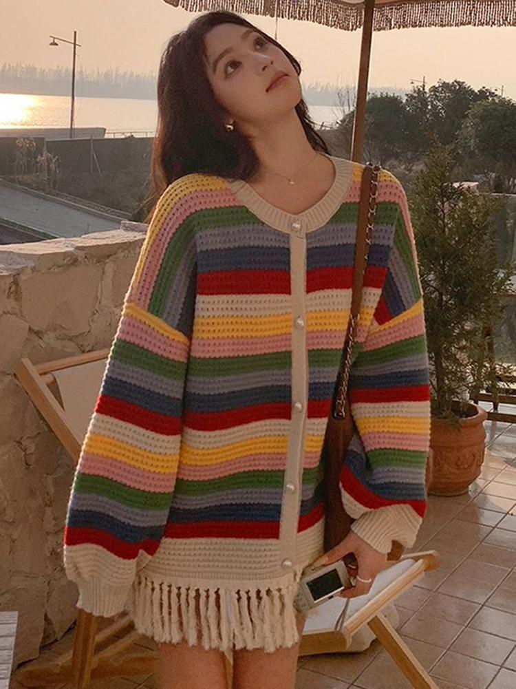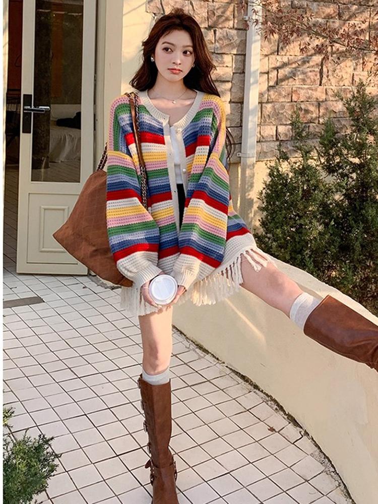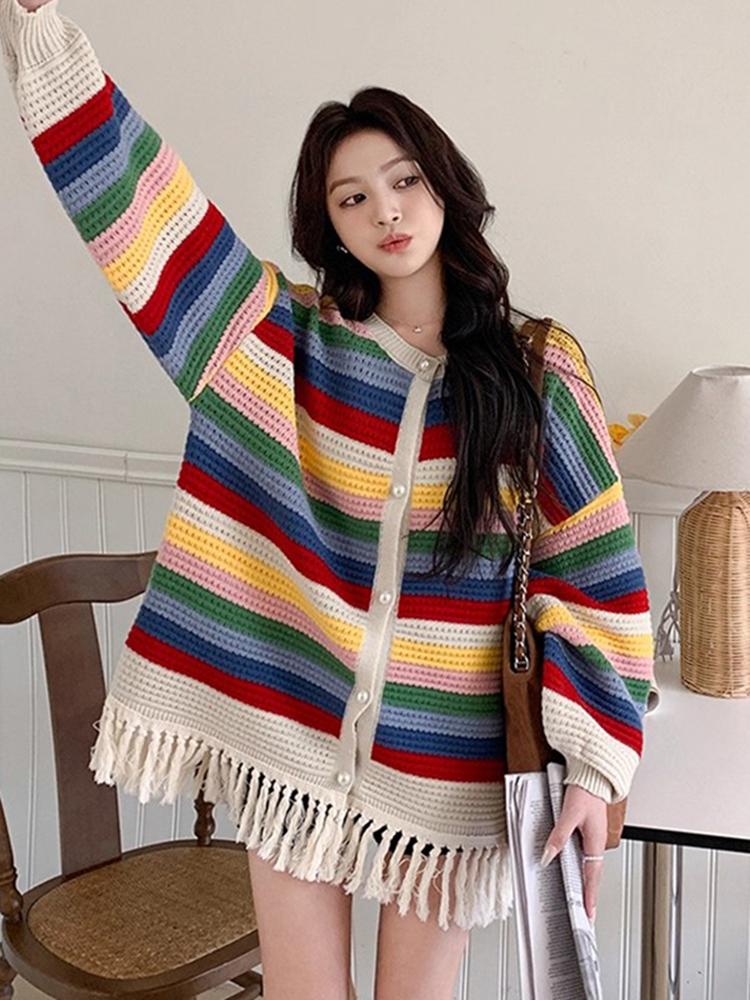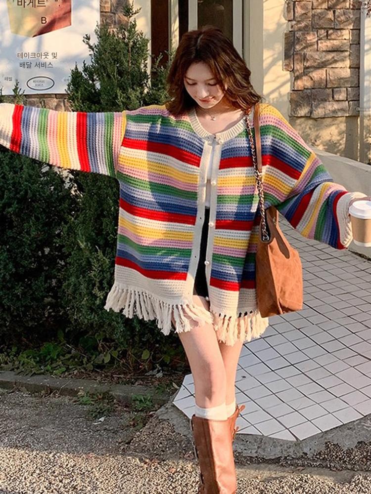 레인보우 스트라이프 태슬 긴팔 니트 가디건 여성용 중간 길이 스웨터 코트 가을 겨울 신상품 루즈 니치 시크