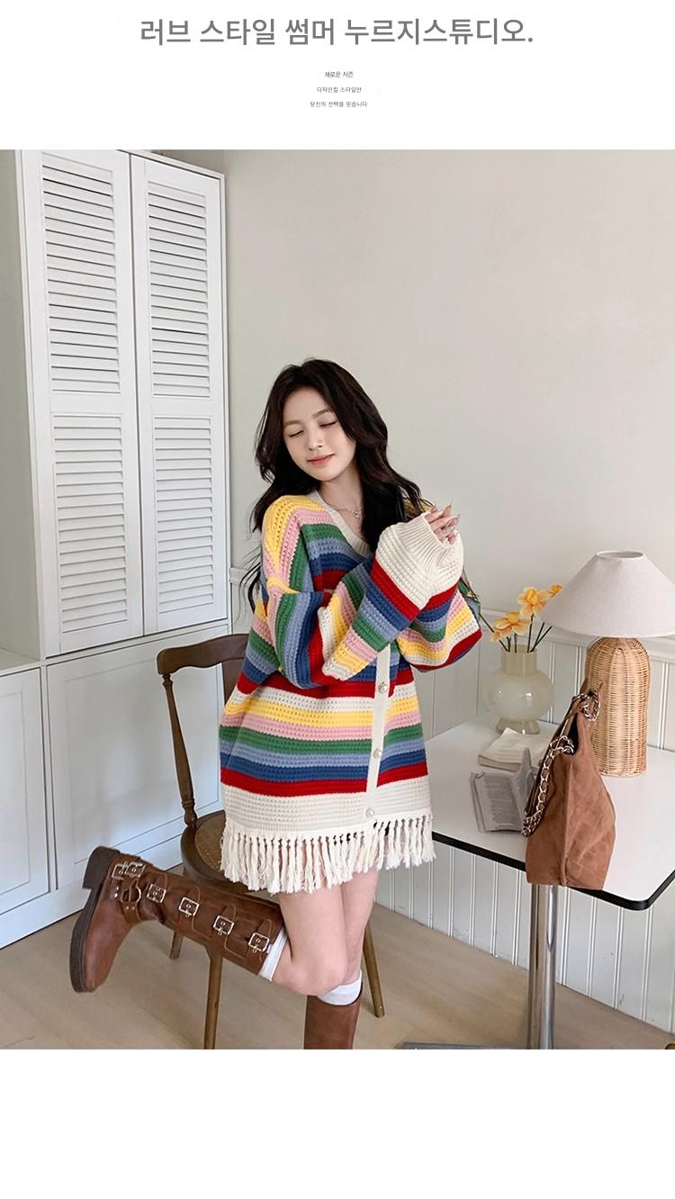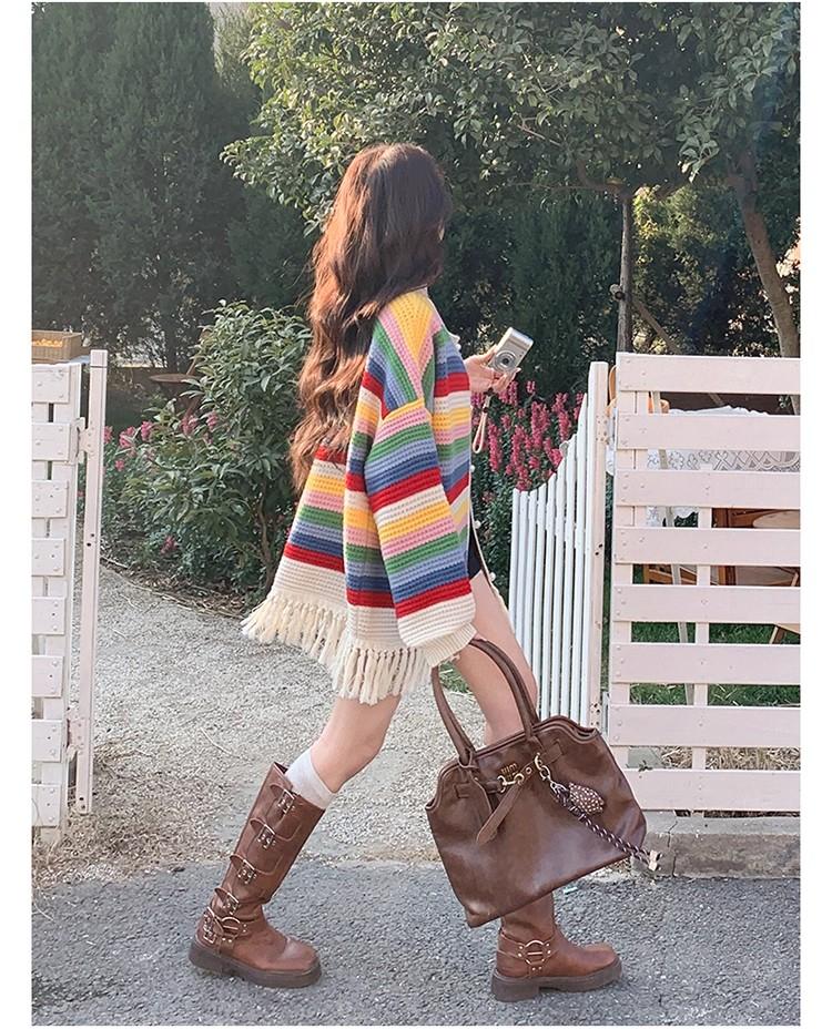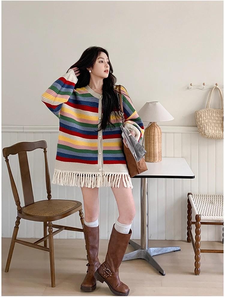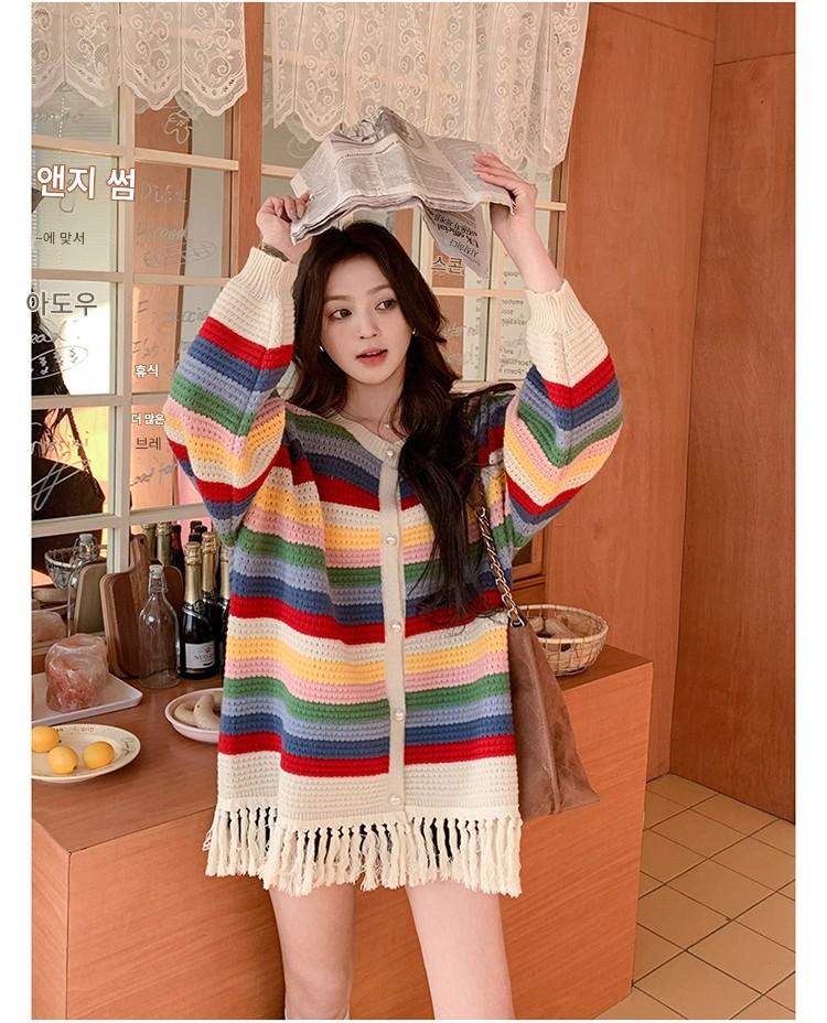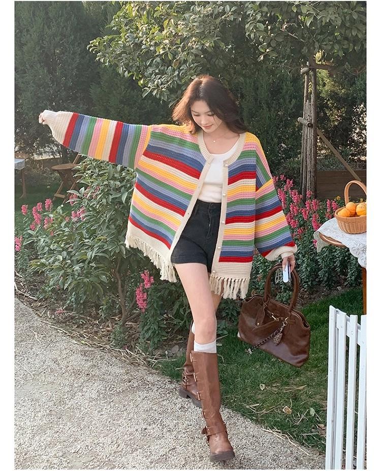 레인보우 스트라이프 태슬 긴팔 니트 가디건 여성용 중간 길이 스웨터 코트 가을 겨울 신상품 루즈 니치 시크