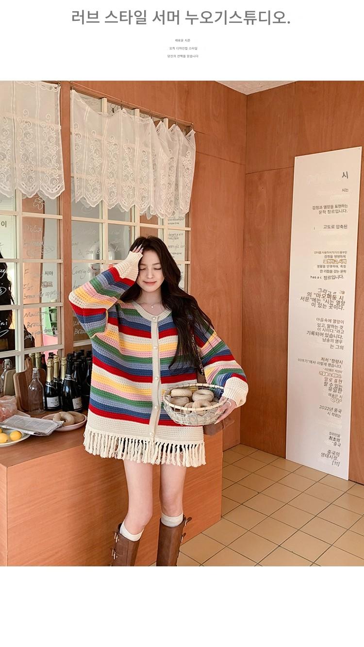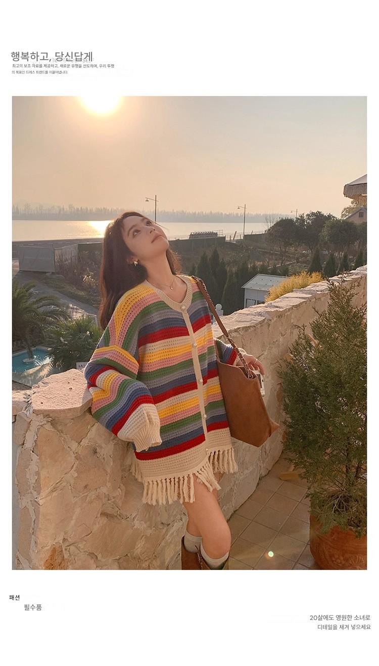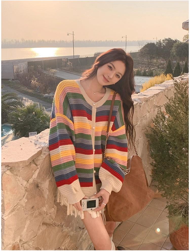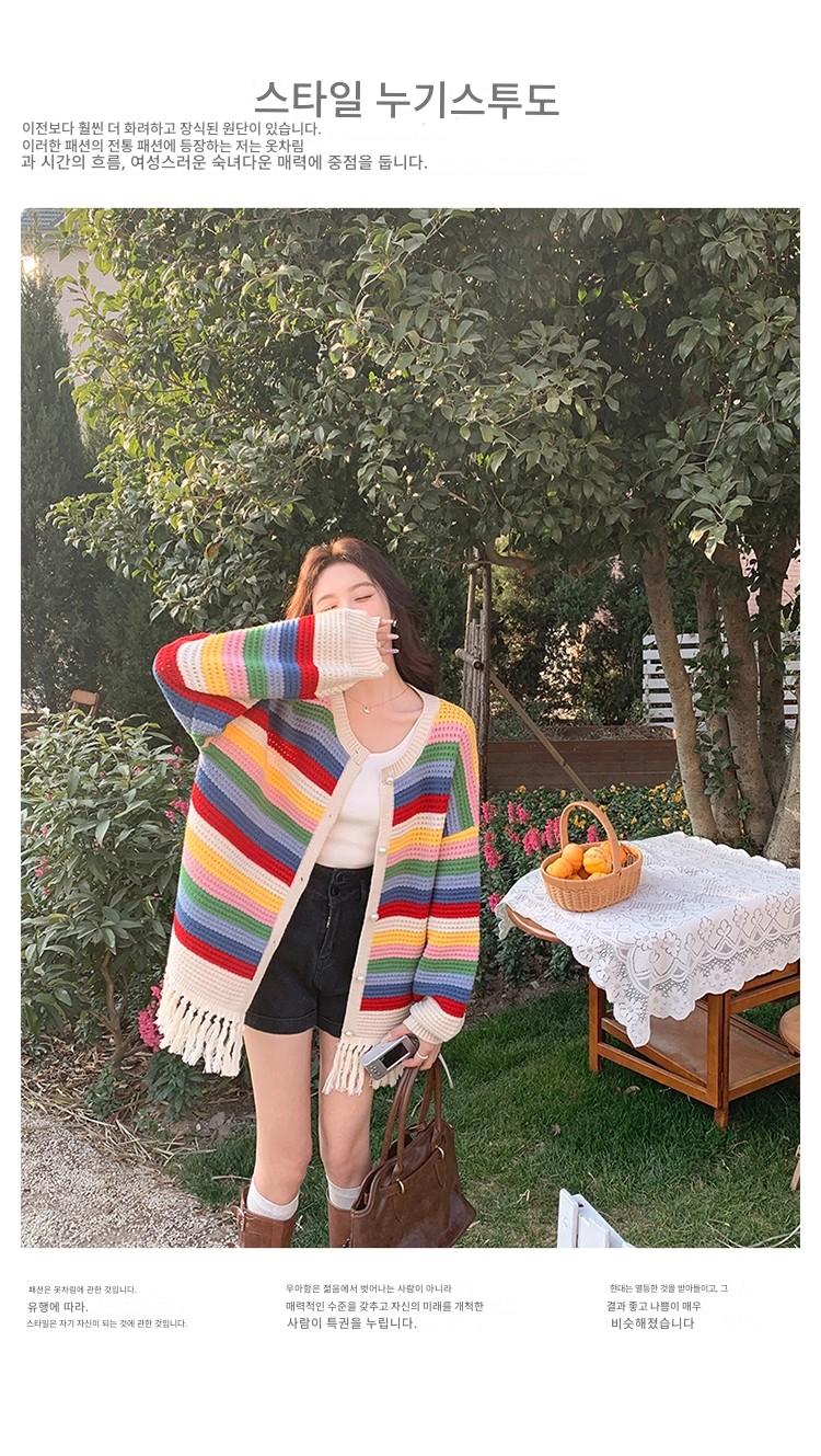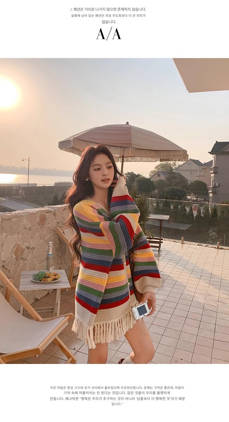 레인보우 스트라이프 태슬 긴팔 니트 가디건 여성용 중간 길이 스웨터 코트 가을 겨울 신상품 루즈 니치 시크