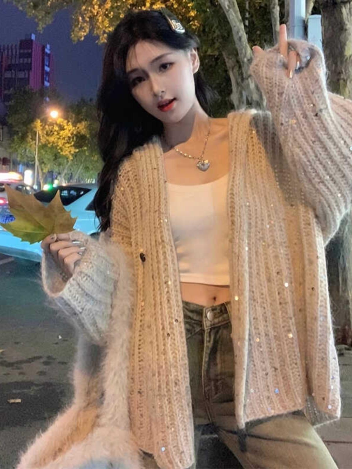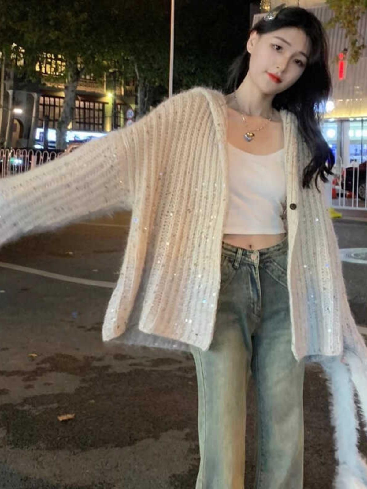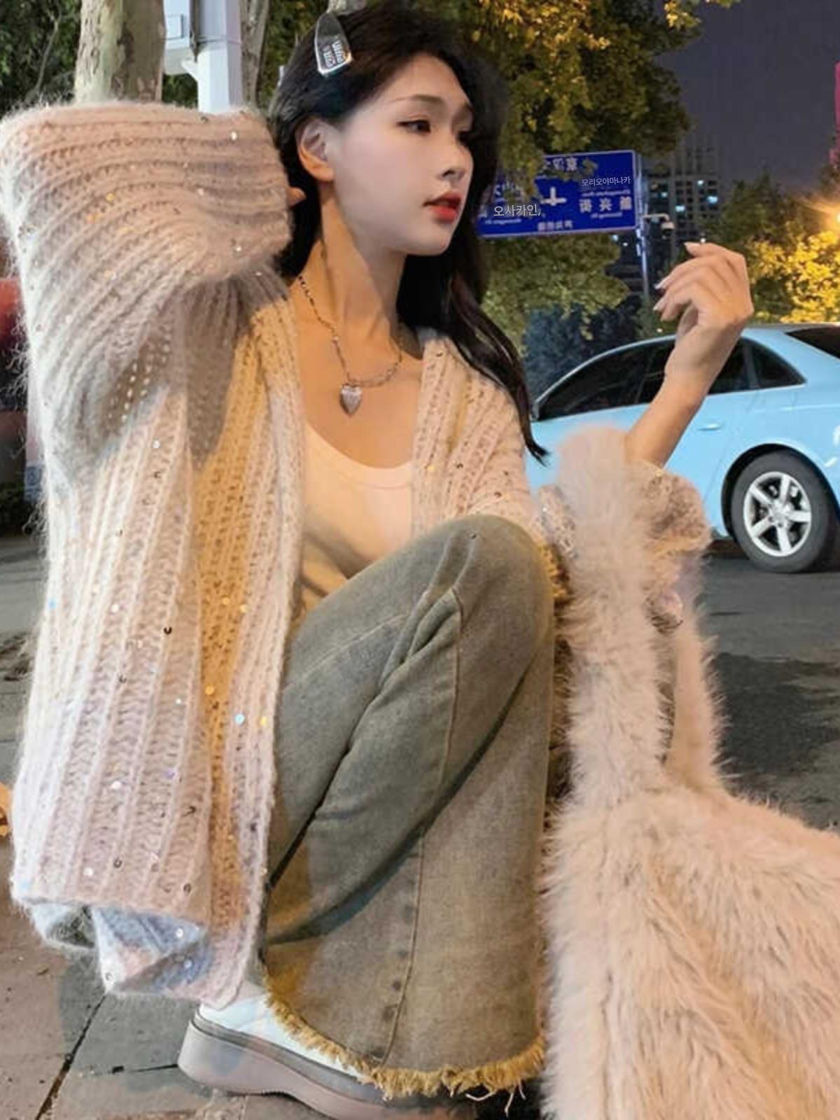 밀크푸푸 소프트 레이지 스웨터 카디건 여성 가을 겨울 신상 디자인 루즈 미디 길이 후드 니트 탑