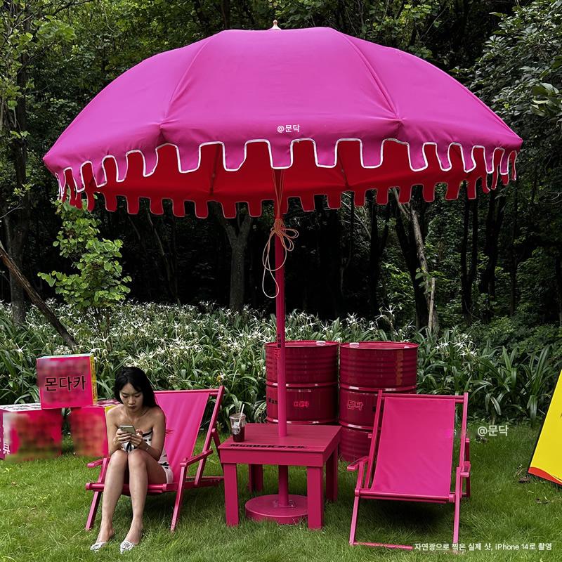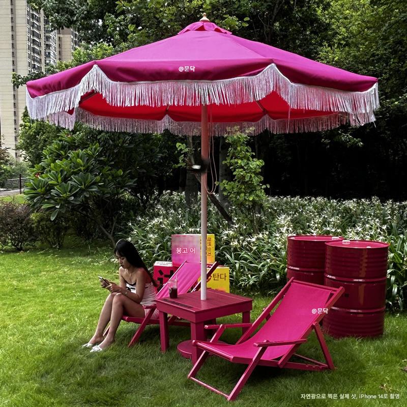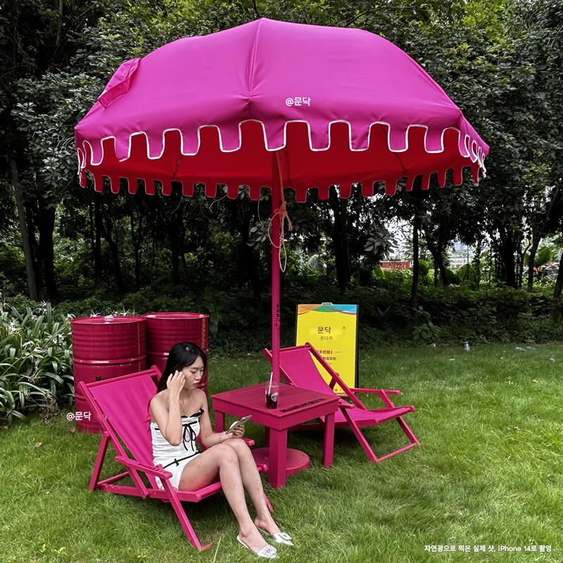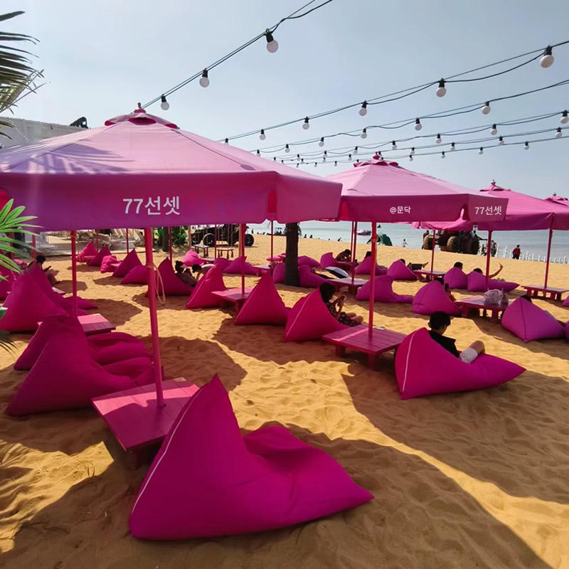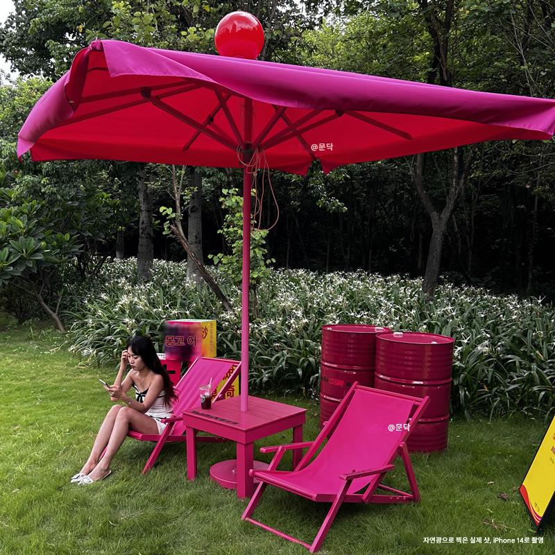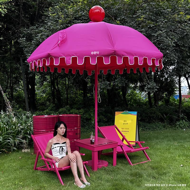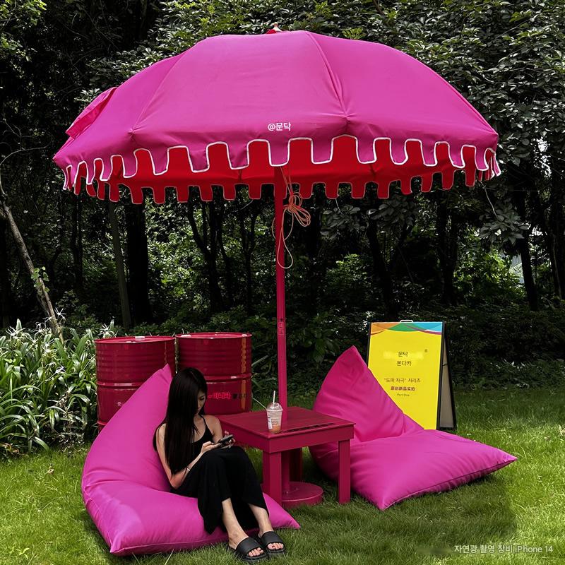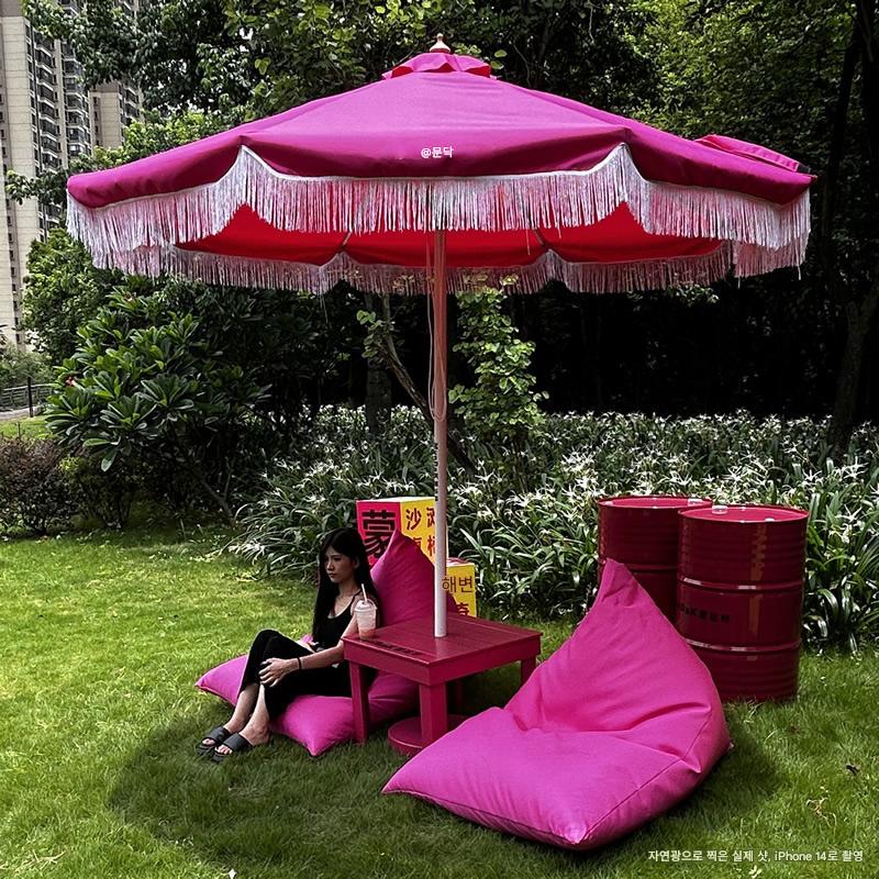 바비 핑크 네트 레드 파라솔 비치 라운지 의자 비치 캠프 테이블 의자 우산을 만들기 위해 맞춤형 로즈 레드 비치 캠프