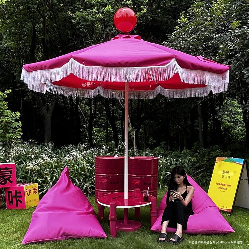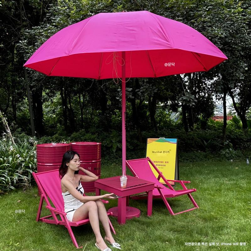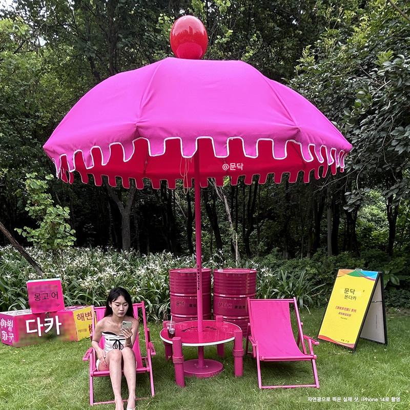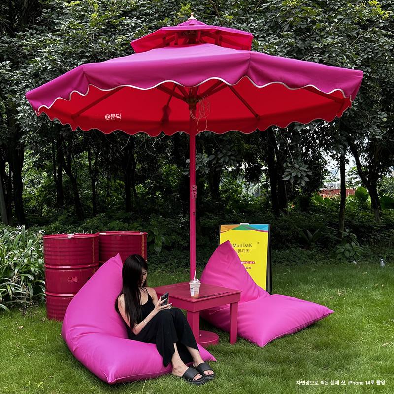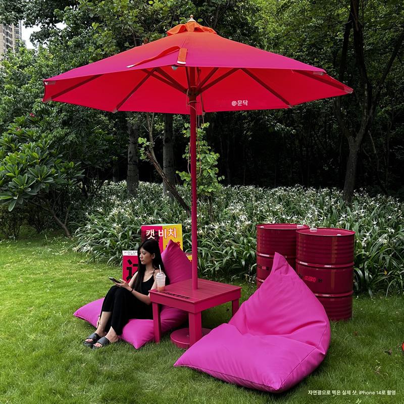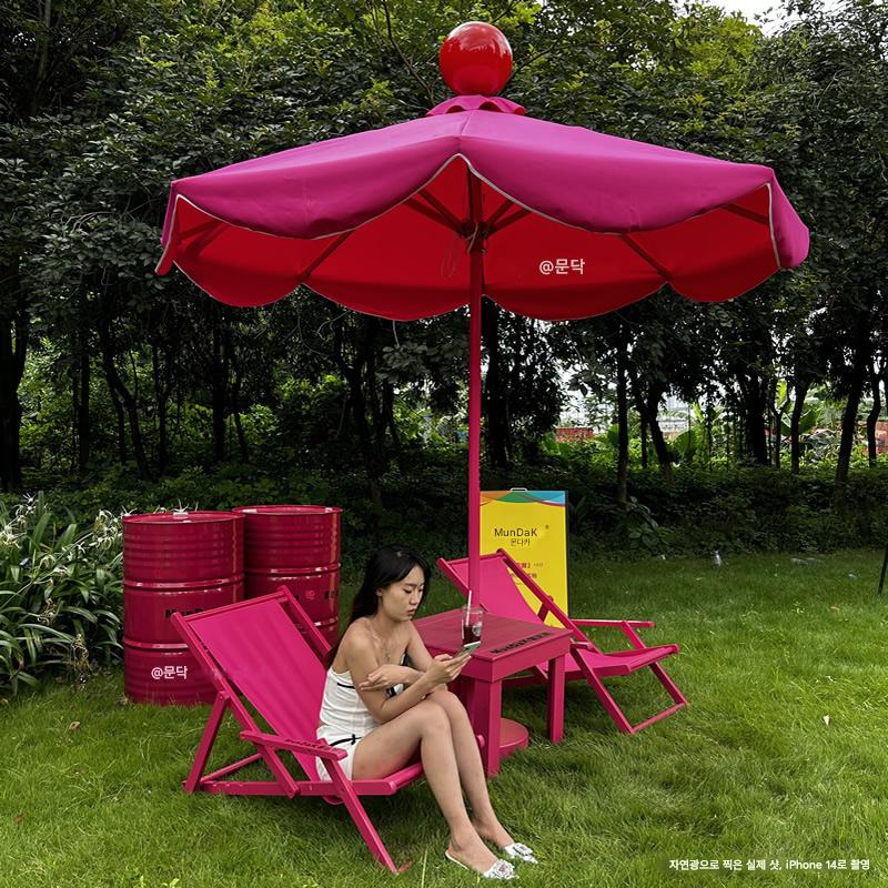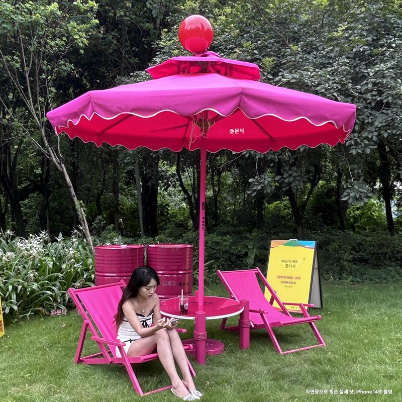 바비 핑크 네트 레드 파라솔 비치 라운지 의자 비치 캠프 테이블 의자 우산을 만들기 위해 맞춤형 로즈 레드 비치 캠프