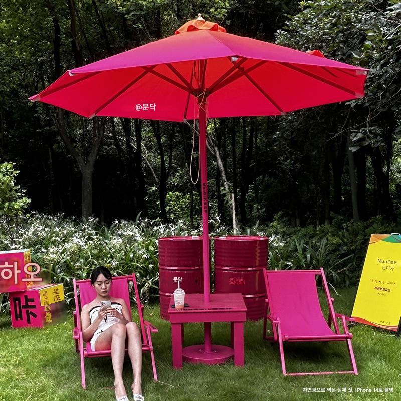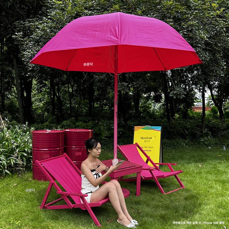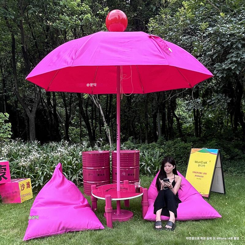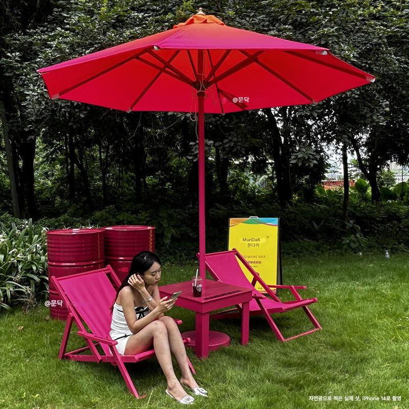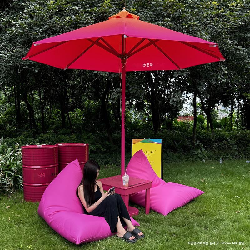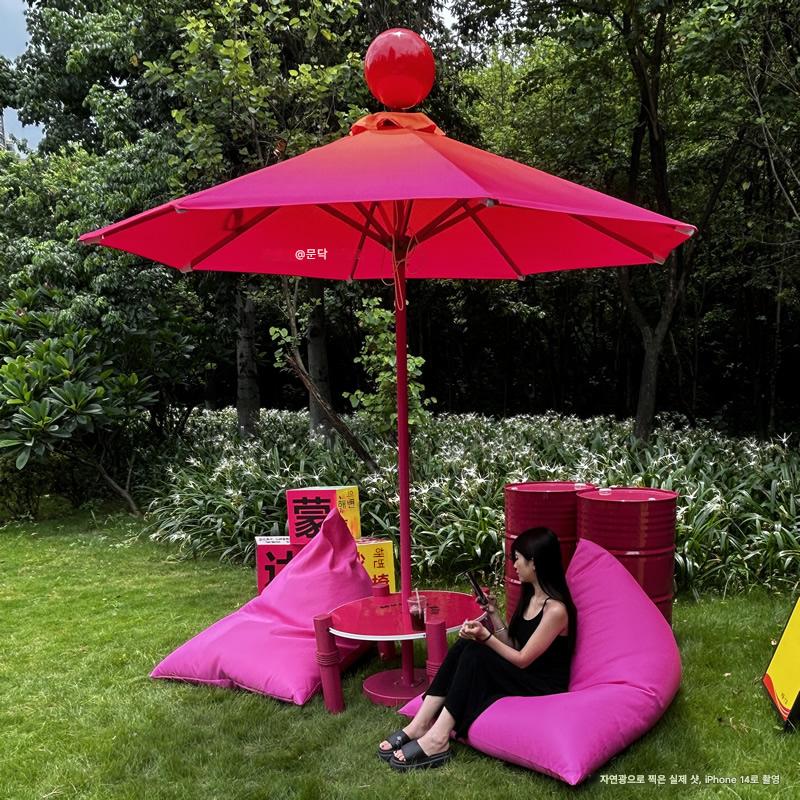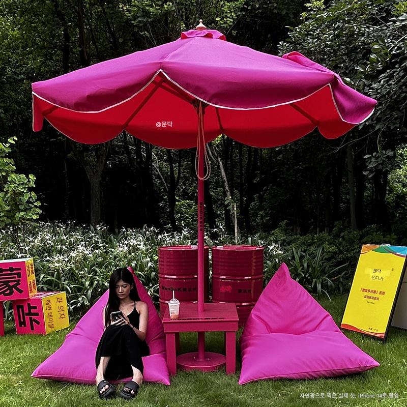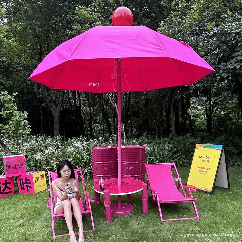 바비 핑크 네트 레드 파라솔 비치 라운지 의자 비치 캠프 테이블 의자 우산을 만들기 위해 맞춤형 로즈 레드 비치 캠프