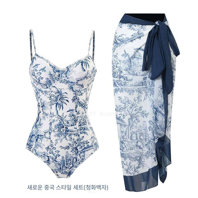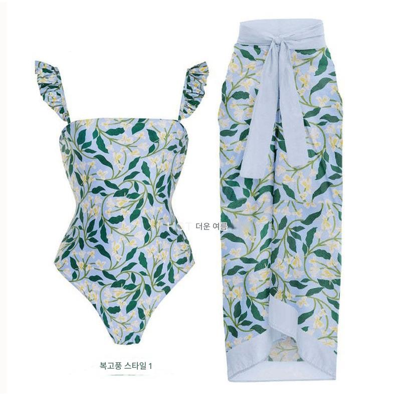 새로운 중국 스타일 휴가 스타일 여성 수영복 스커트 슈트 V넥 보수적 슬림 원피스 양면 수영복 온천 해변