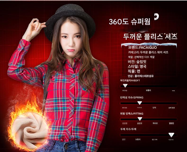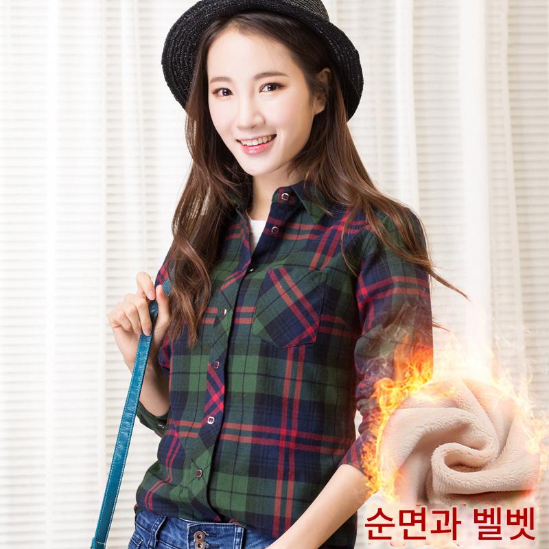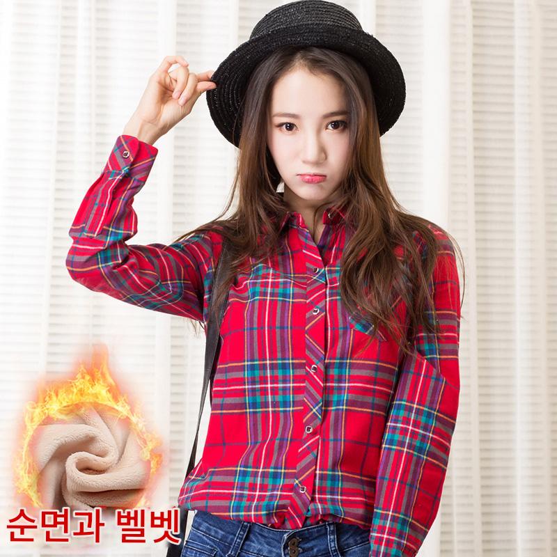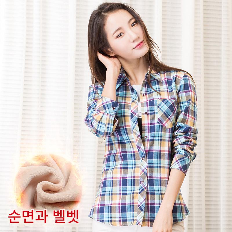 순면 플레드 따뜻한 셔츠 여성 긴팔 인치 가을 겨울 새로운 베이스 플러스 벨벳 두꺼운 슬림핏 대형 사이즈 여성 셔츠