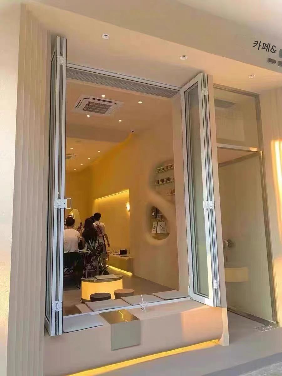 알루미늄 합금 좌우 접이식 창호 하부 트랙이 없는 오픈 바 매우 좁은 슬라이딩 창호 발코니 밀폐형 파노라마 유리창