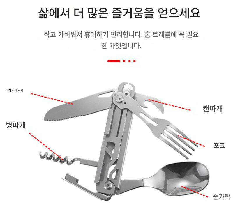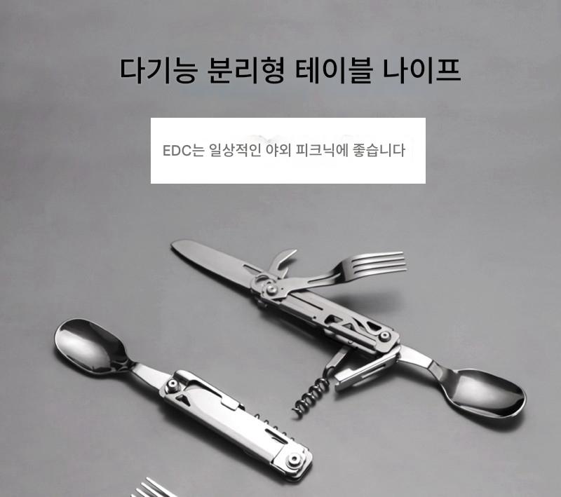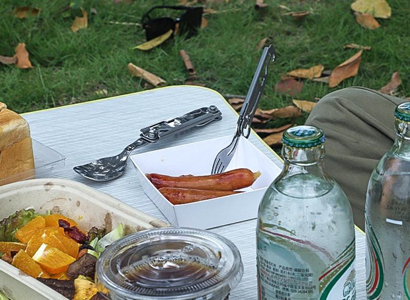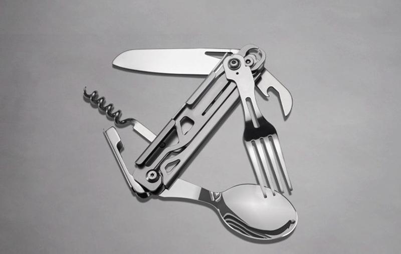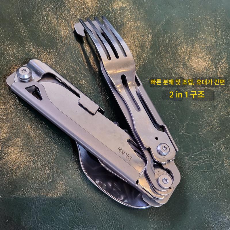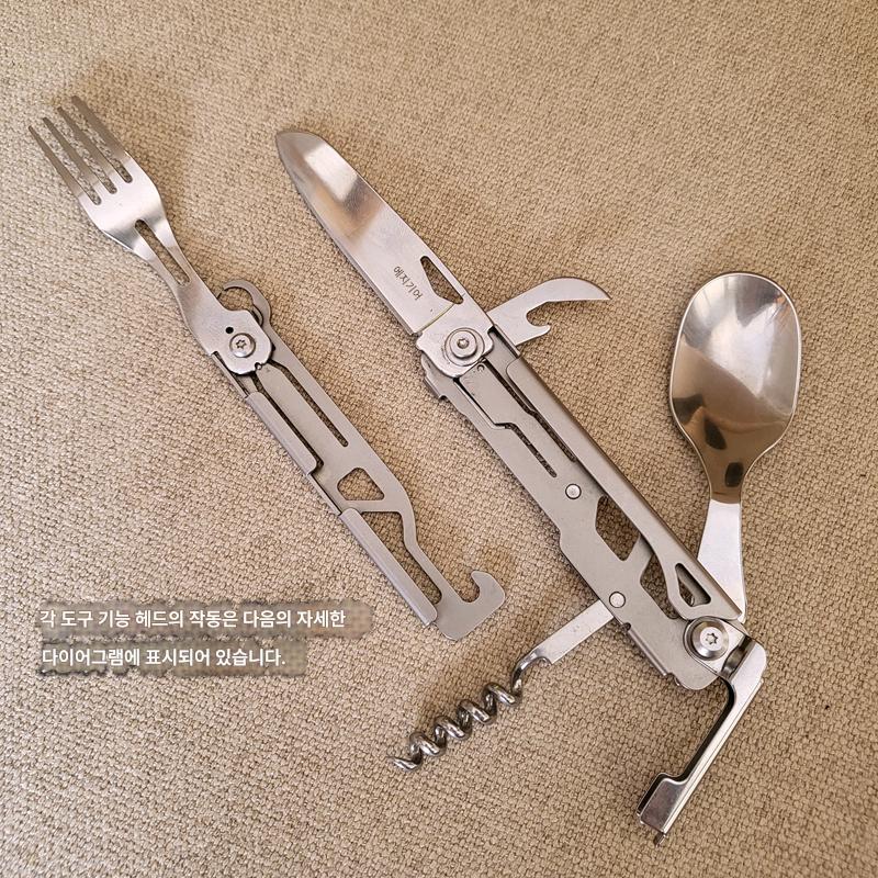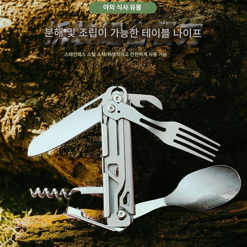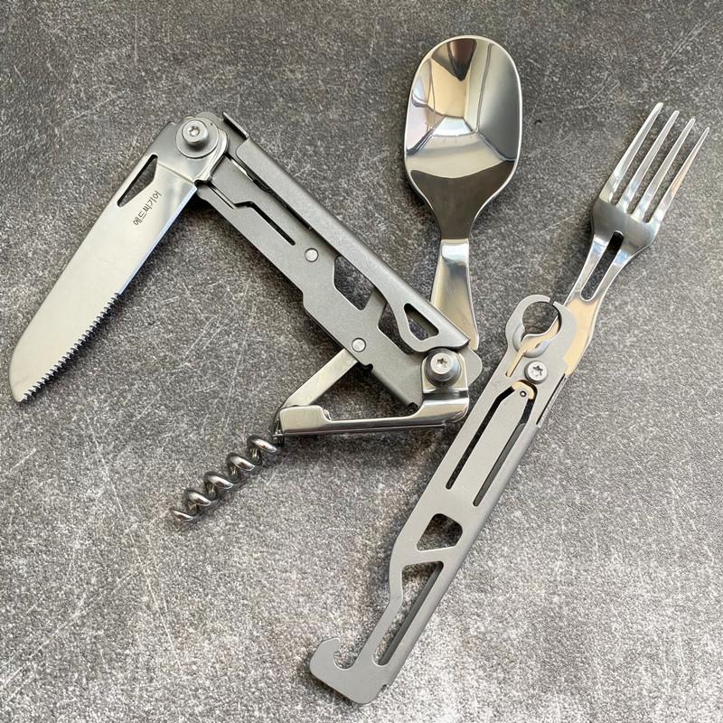 야외 캠핑용 식기 EDC 스테인리스 스틸 다기능 접이식 포크 스푼 콤비네이션 병따개 분해 칼과 포크 세트