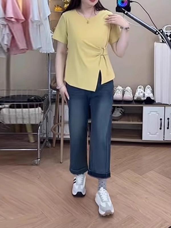 여성용 여름용 대형 라운드넥 불규칙 트위스트 숄더 반팔 티셔츠 뚱뚱한 mm 슬림 시크 패션 허리 탑
