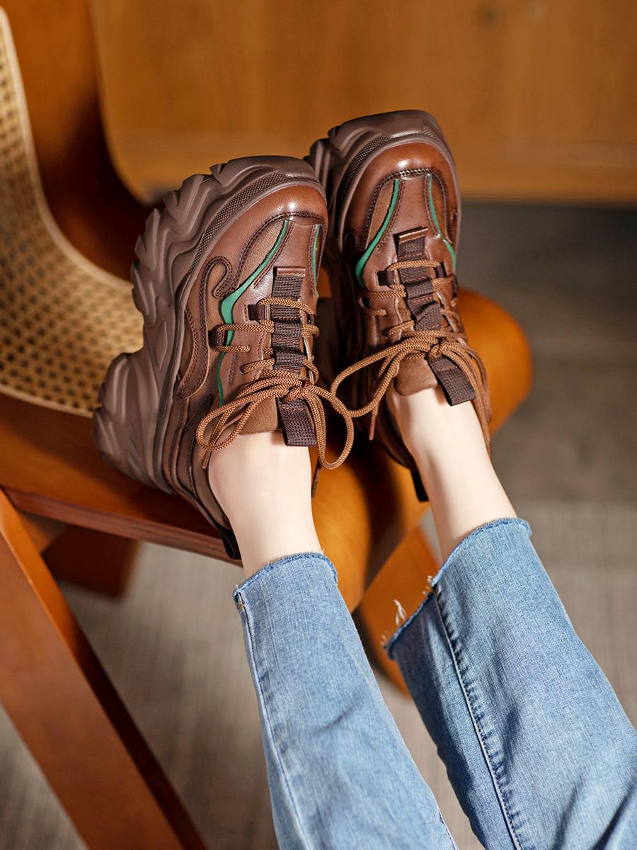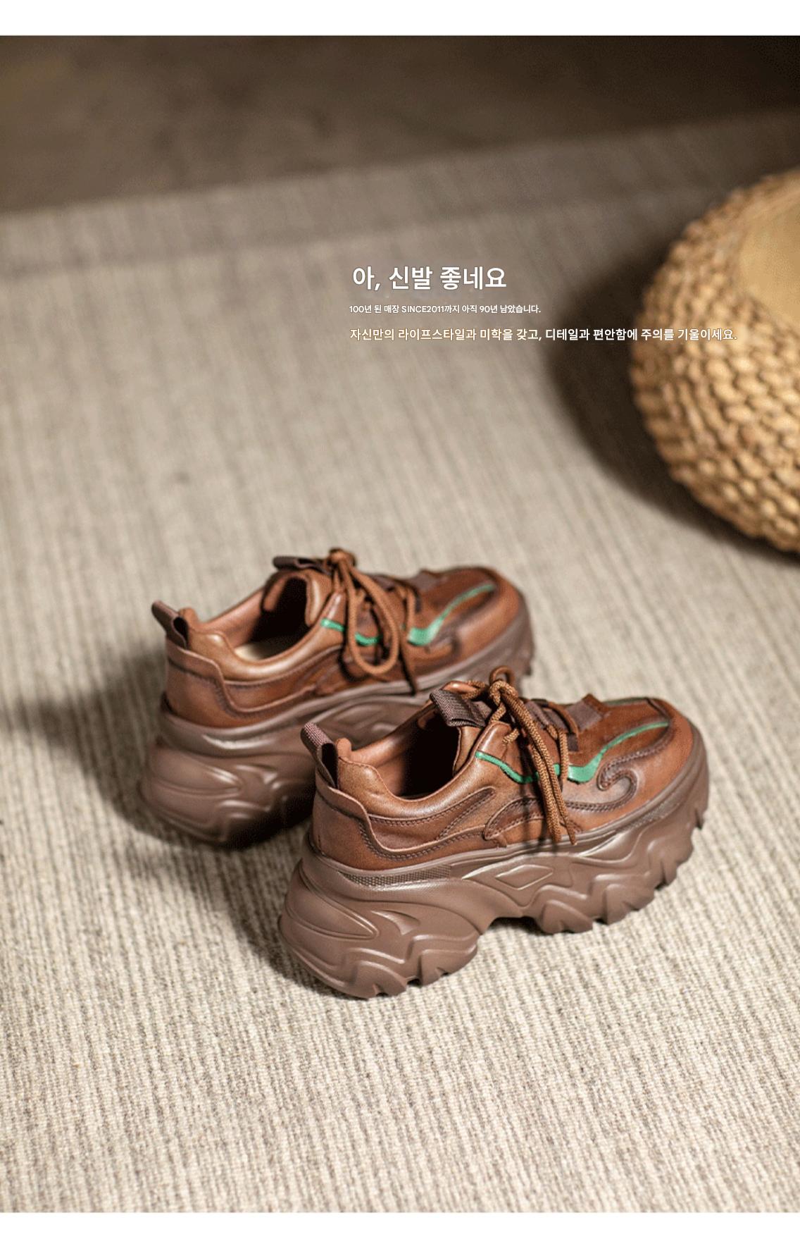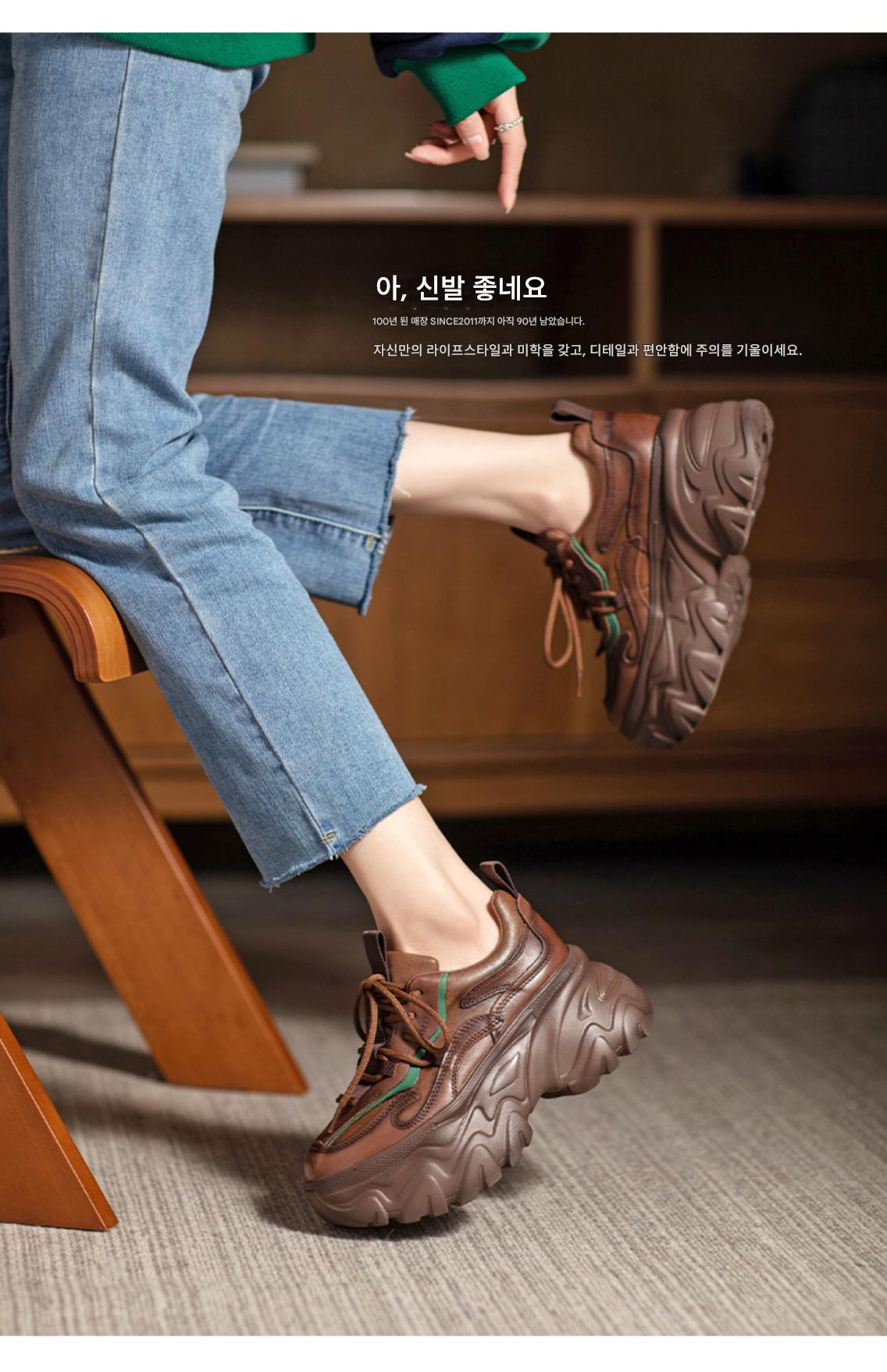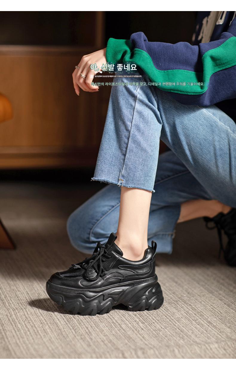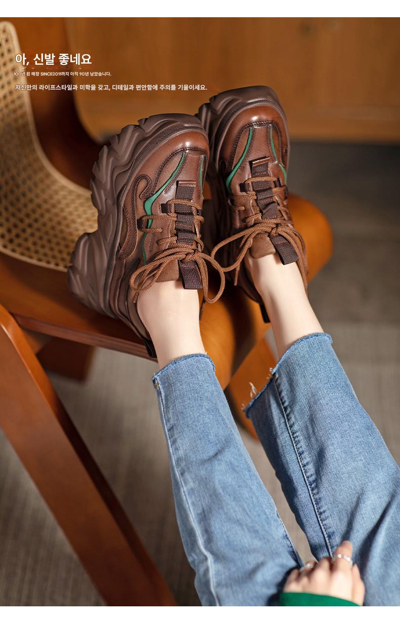 여성용 정품 가죽 레트로 두꺼운 밑창 아빠화, 키 키우기 작은 캐주얼 스포츠화, 여성용 하이힐 레이스업 소가죽 플랫폼화