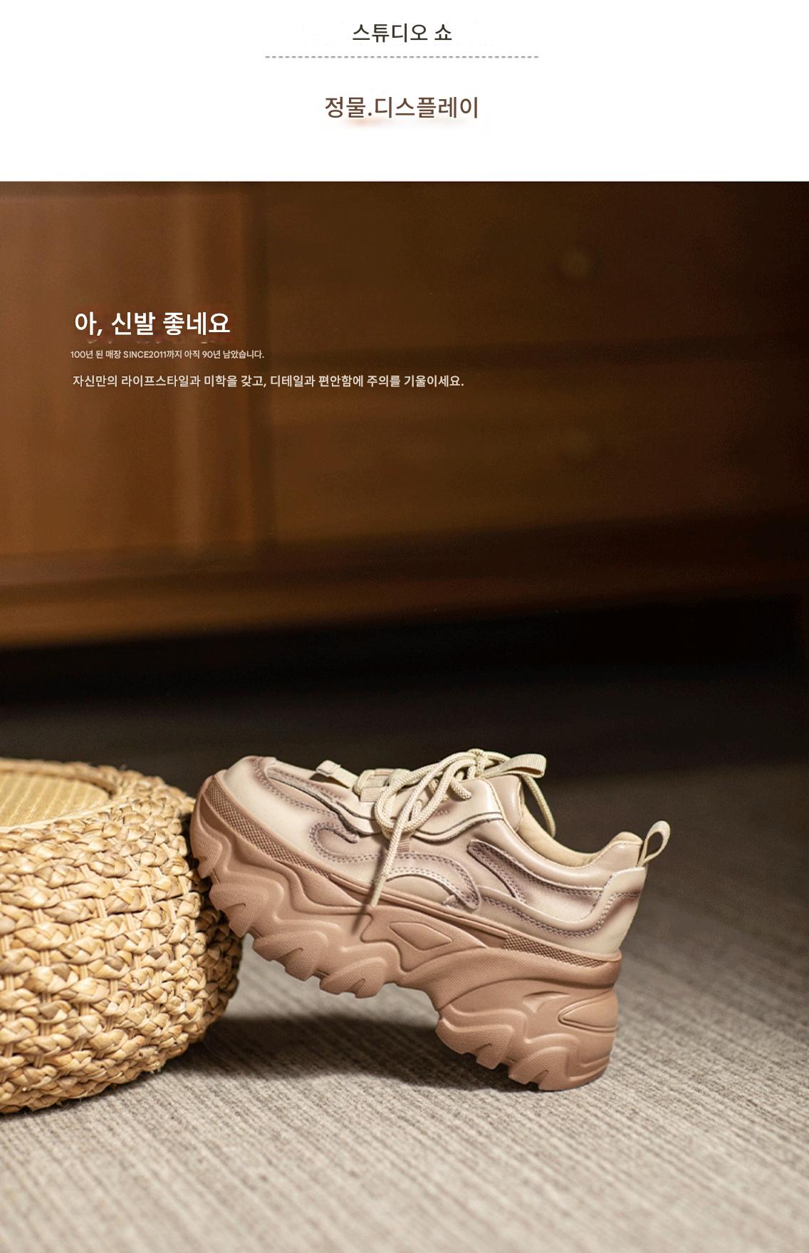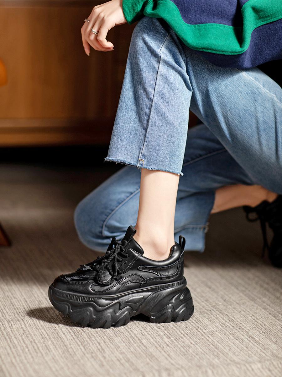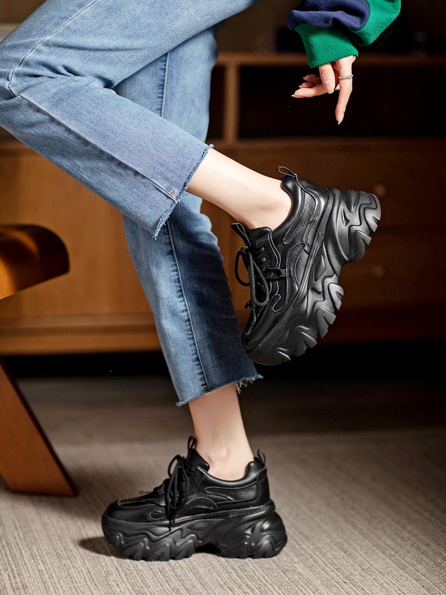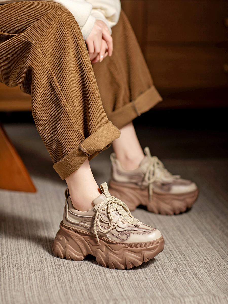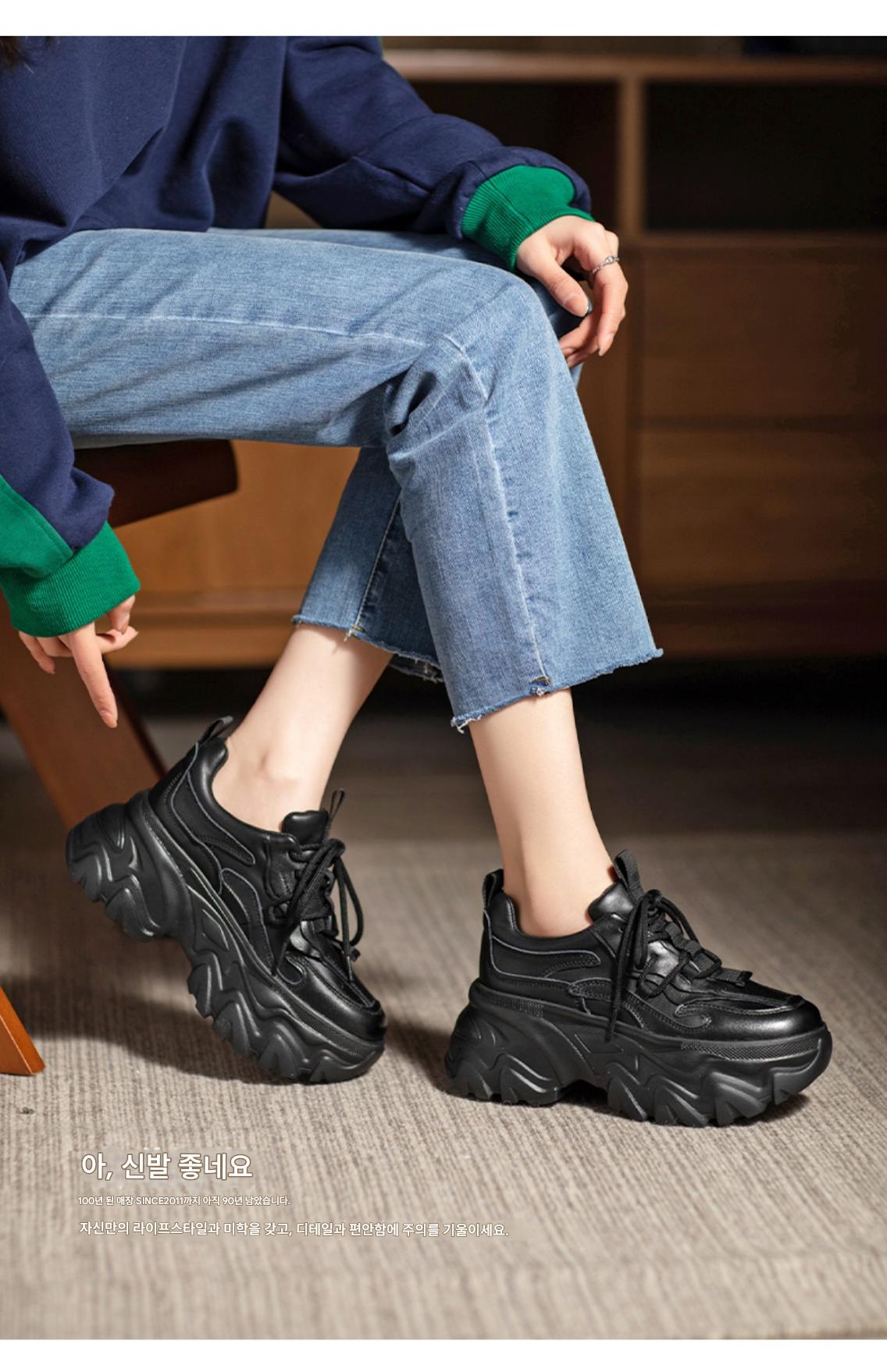 여성용 정품 가죽 레트로 두꺼운 밑창 아빠화, 키 키우기 작은 캐주얼 스포츠화, 여성용 하이힐 레이스업 소가죽 플랫폼화