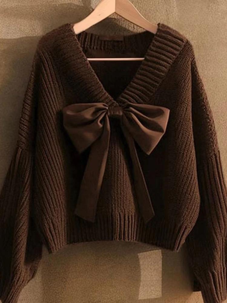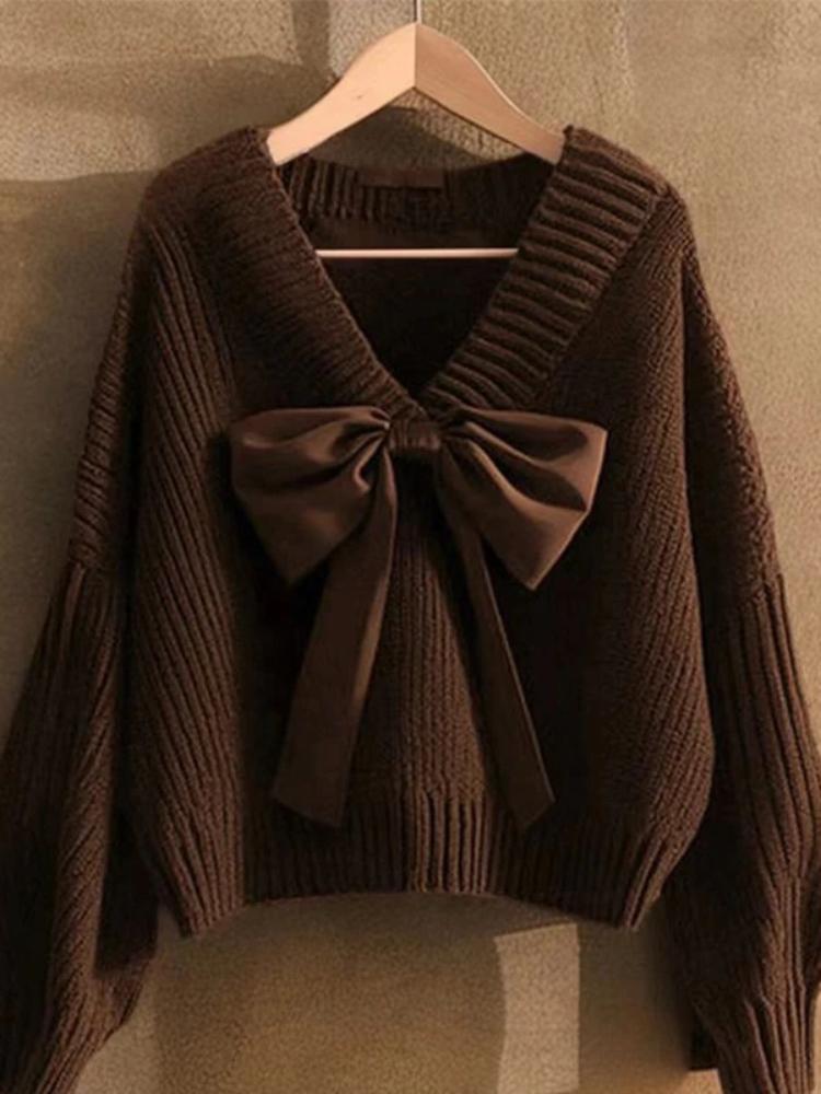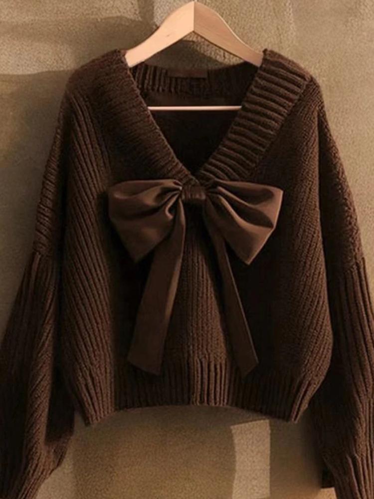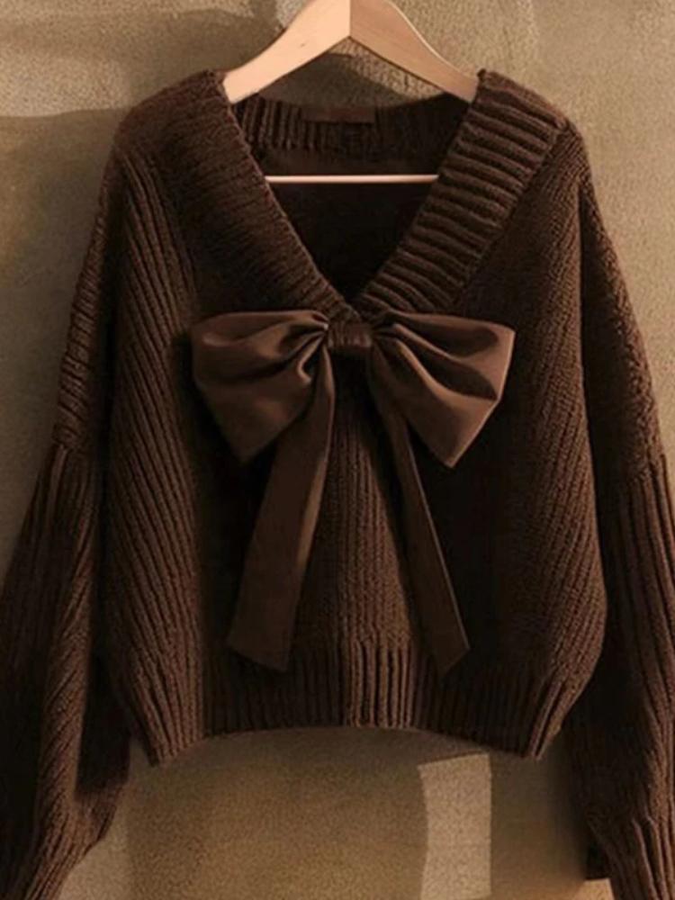 여성 가을 커피 컬러 V넥 나비넥 풀오버 스웨터 유럽산 고급 루즈 레이지 니트 스웨터 탑