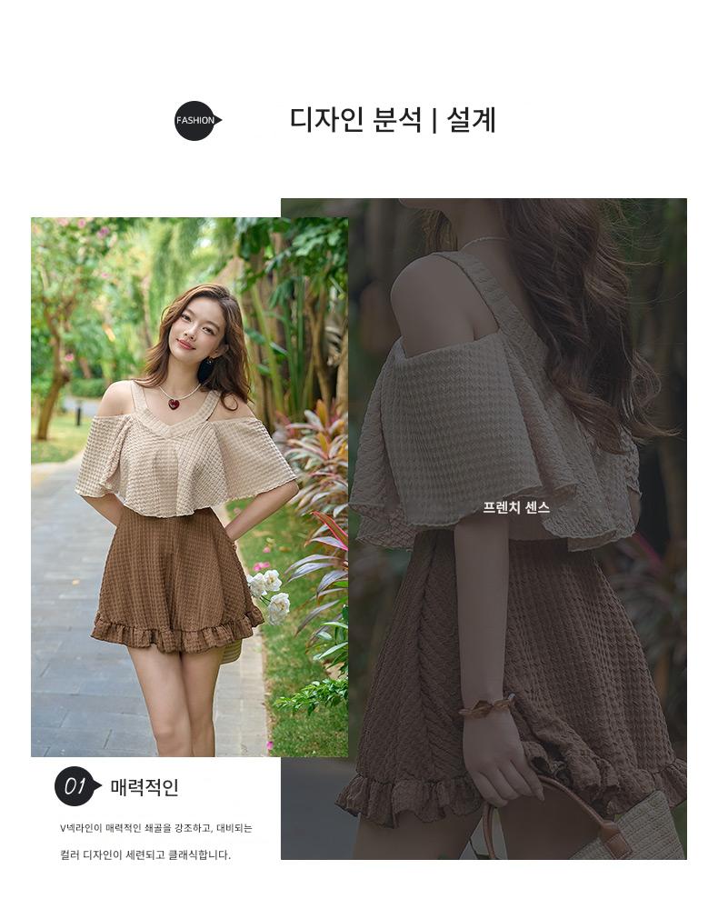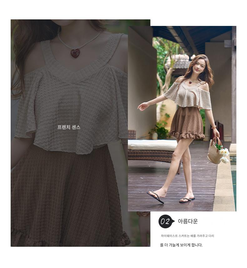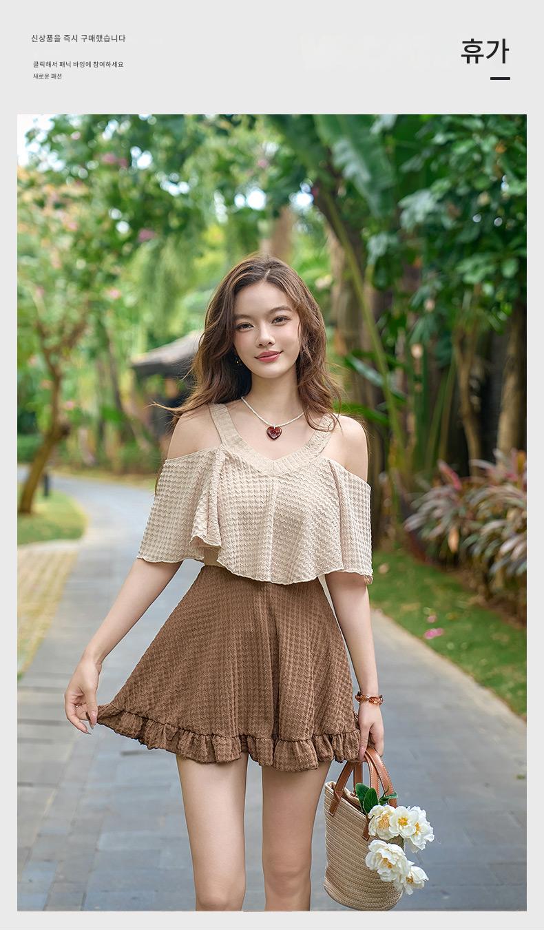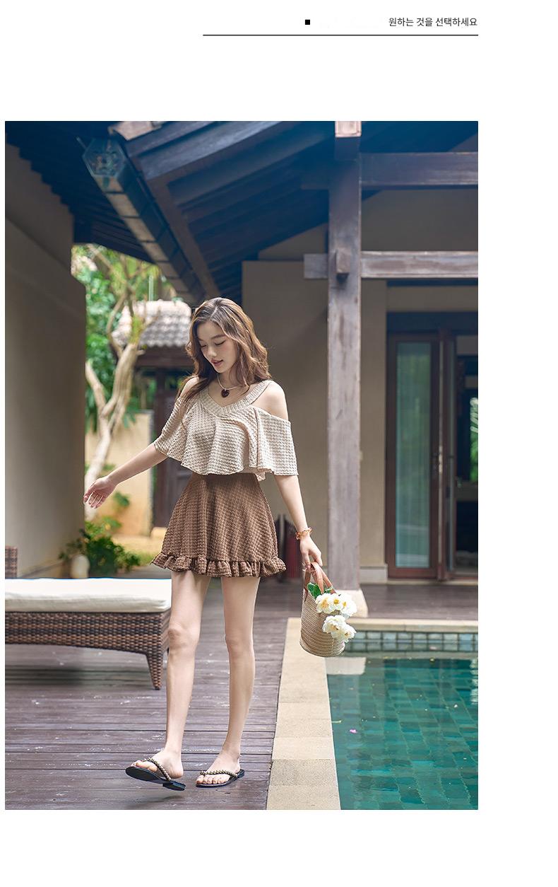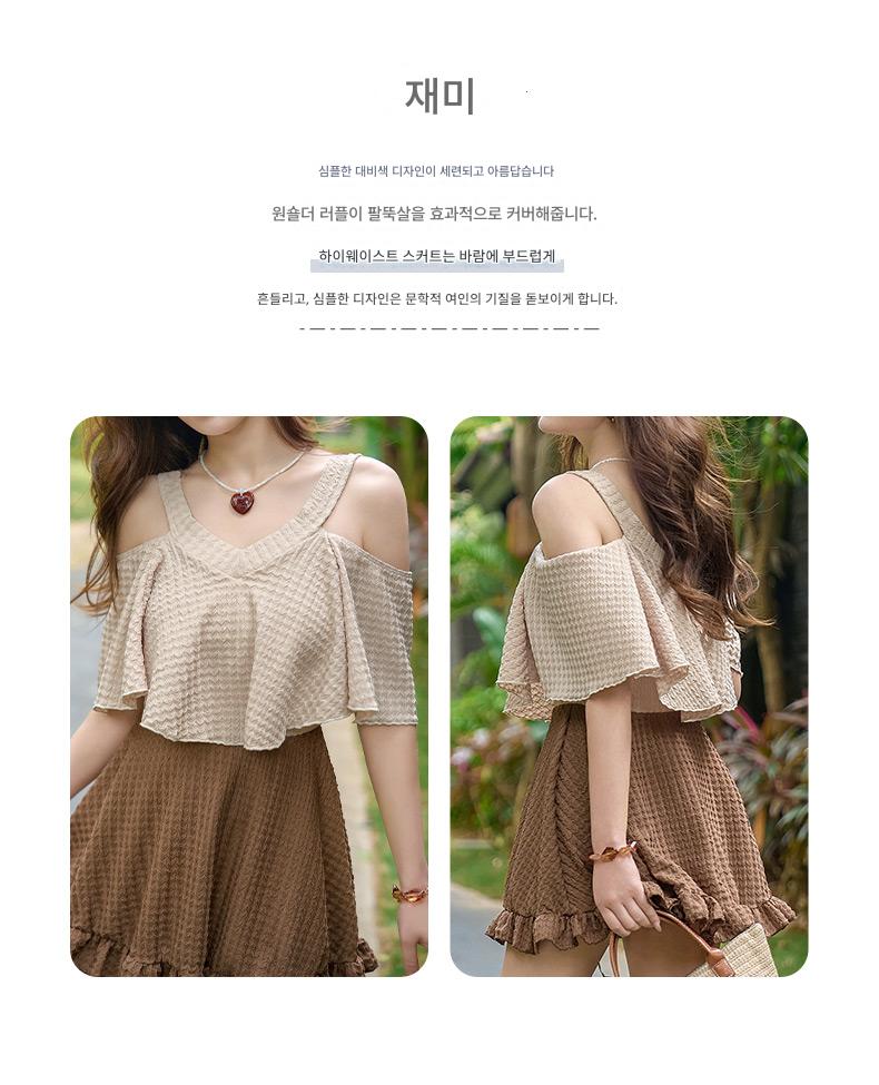 원피스 드레스 스타일의 플랫 앵글 러플 오프숄더 컬러블록 수영복은 배를 가려주어 여름철 온천 휴가 스타일에 여성을 날씬하고 보수적으로 보이게 해줍니다.