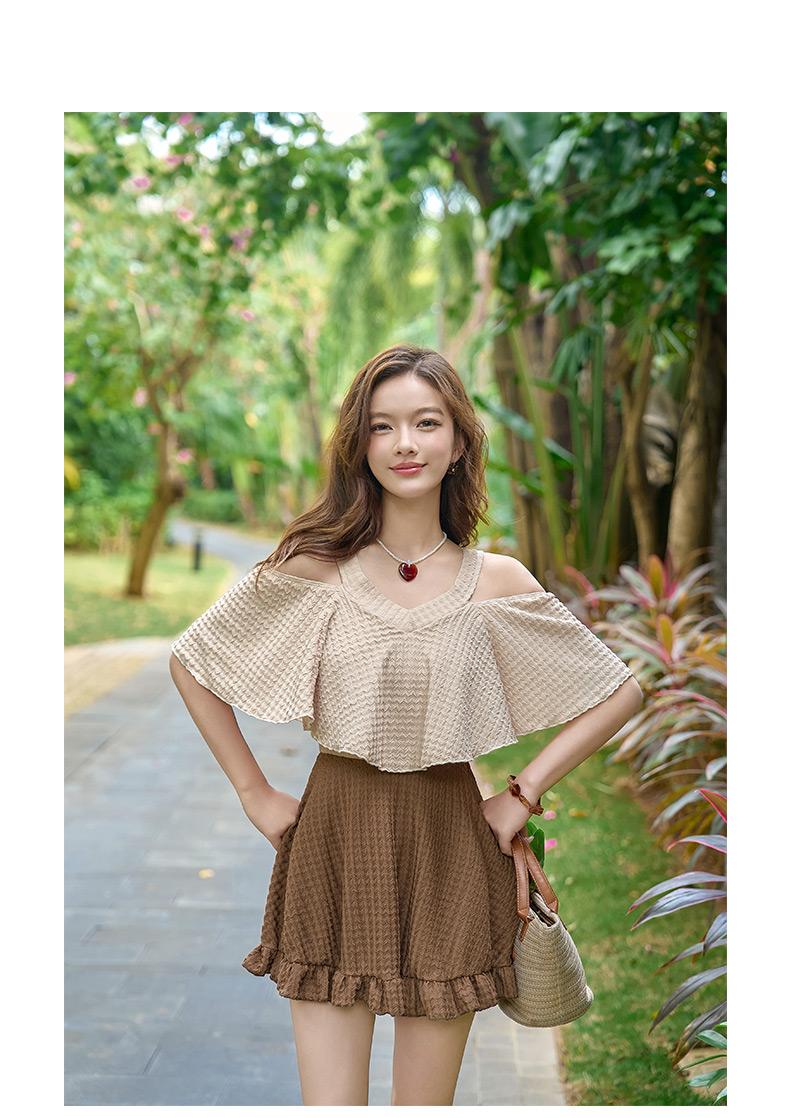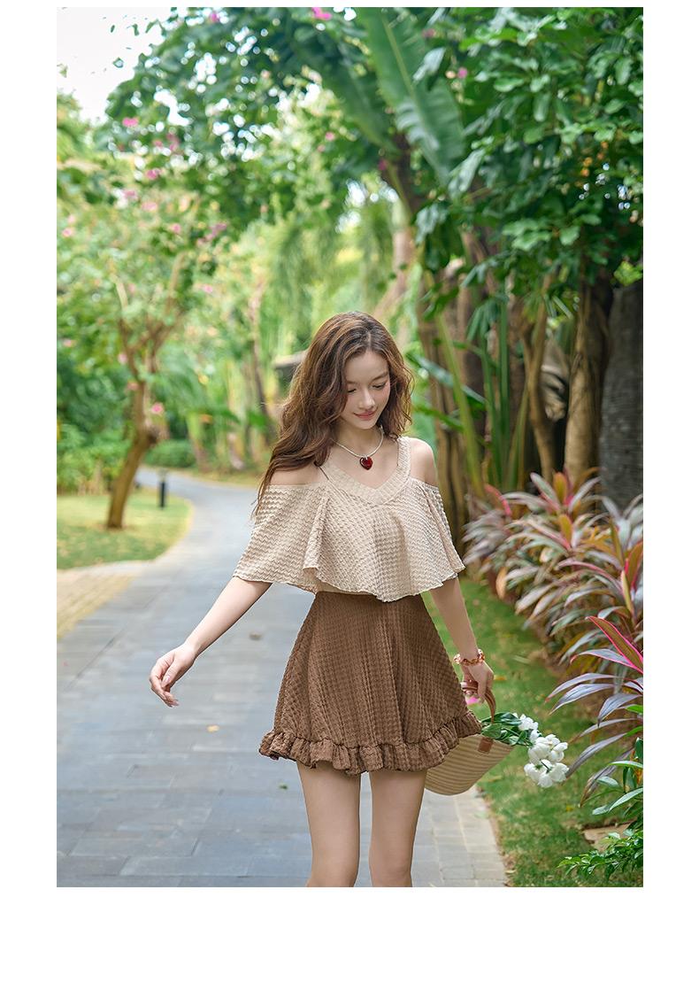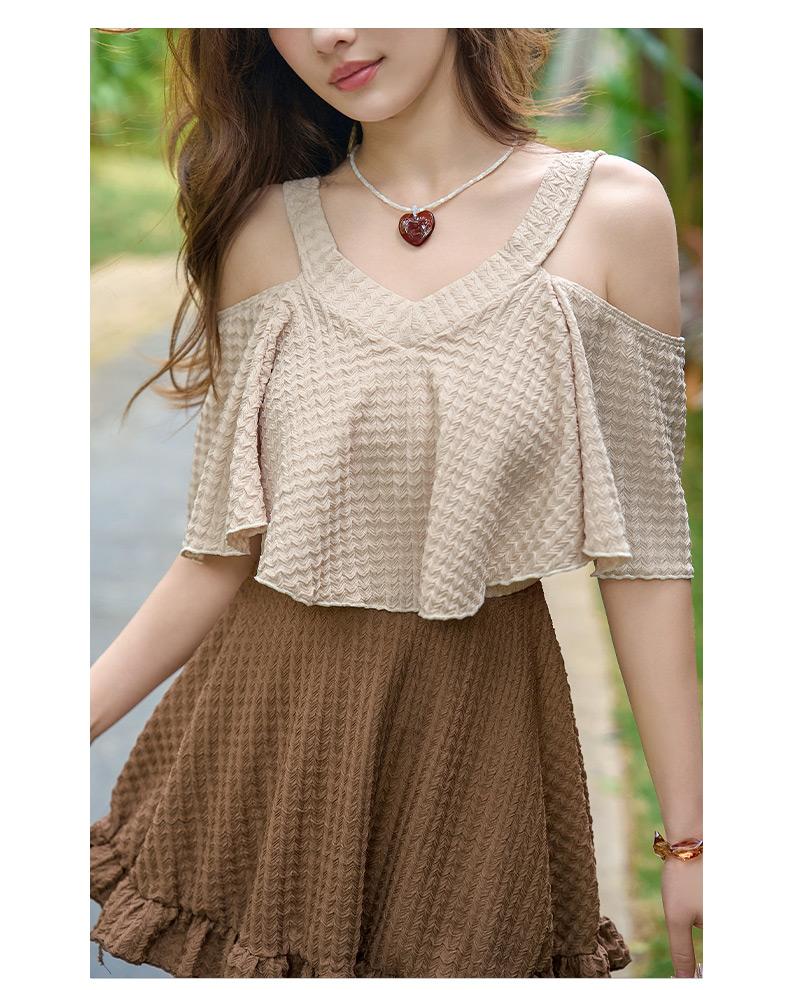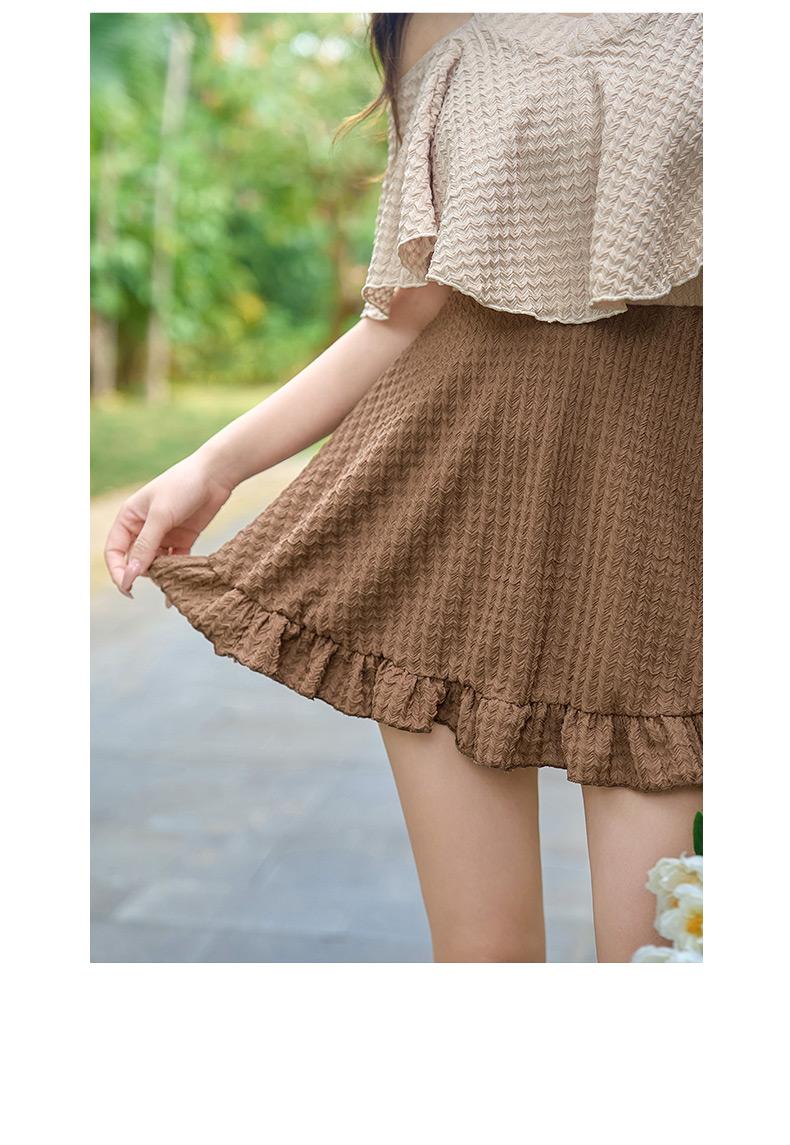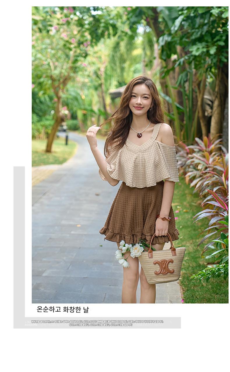 원피스 드레스 스타일의 플랫 앵글 러플 오프숄더 컬러블록 수영복은 배를 가려주어 여름철 온천 휴가 스타일에 여성을 날씬하고 보수적으로 보이게 해줍니다.