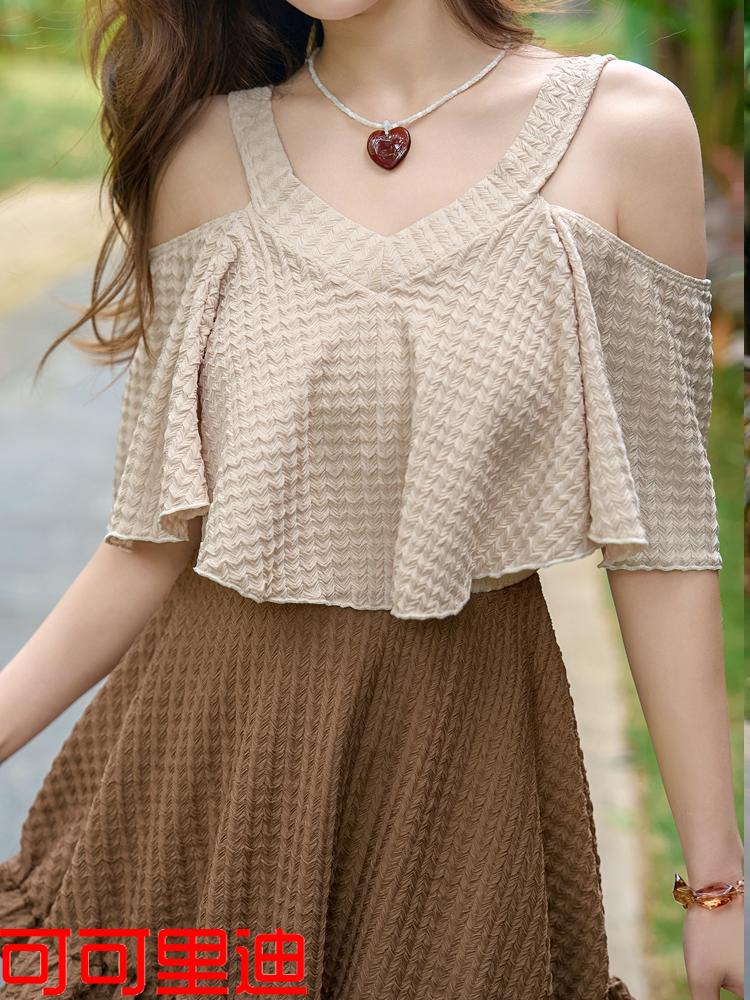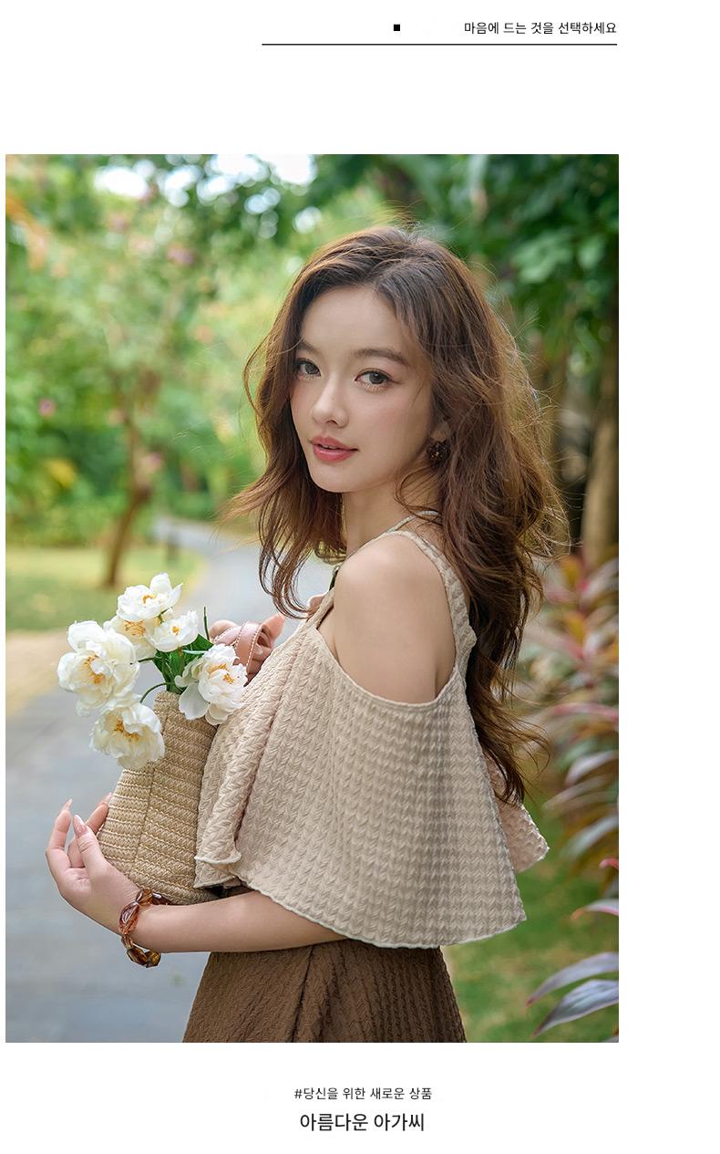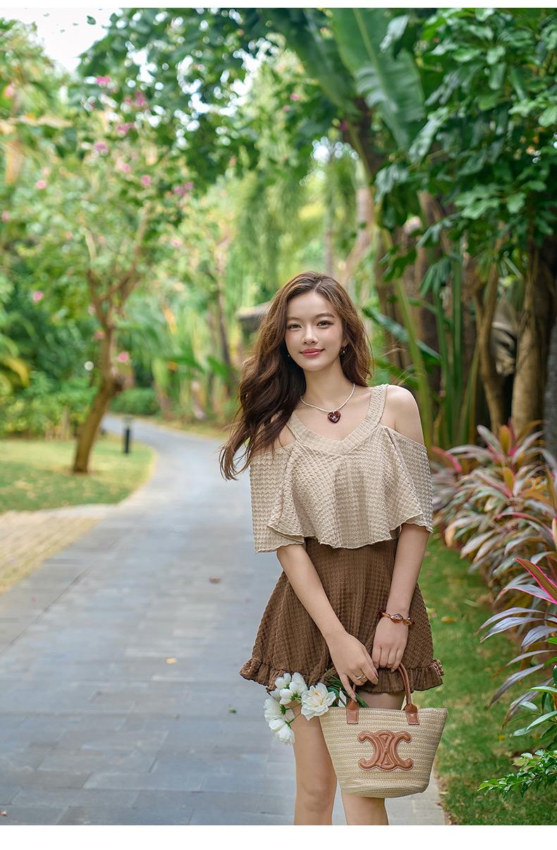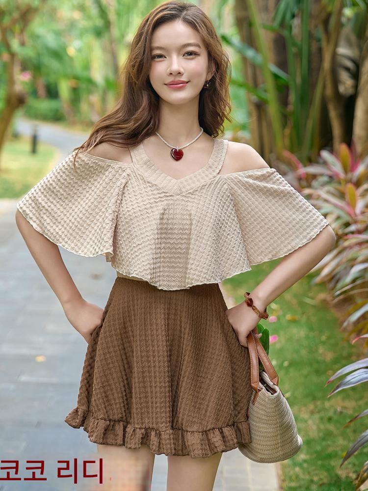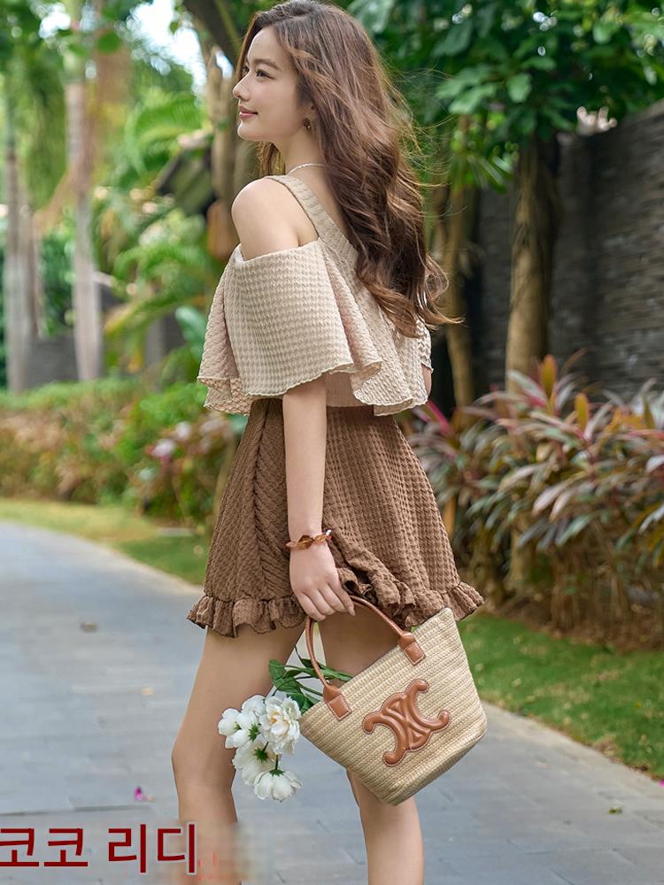 원피스 드레스 스타일의 플랫 앵글 러플 오프숄더 컬러블록 수영복은 배를 가려주어 여름철 온천 휴가 스타일에 여성을 날씬하고 보수적으로 보이게 해줍니다.