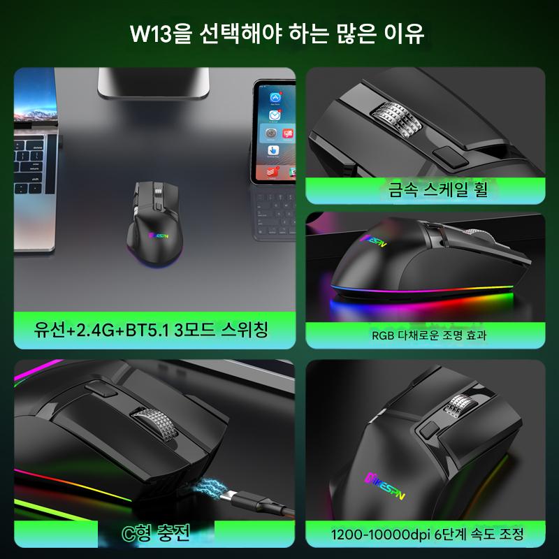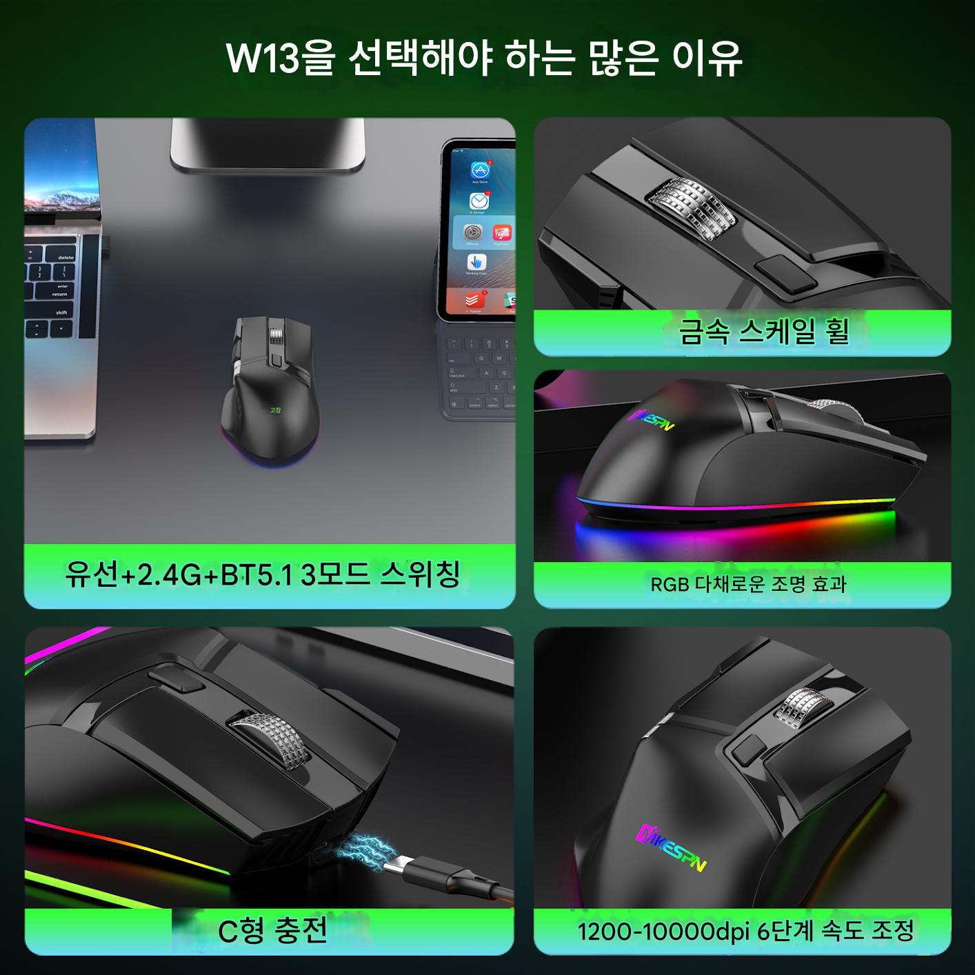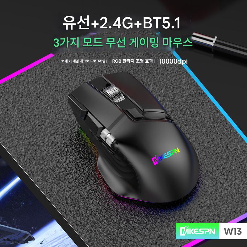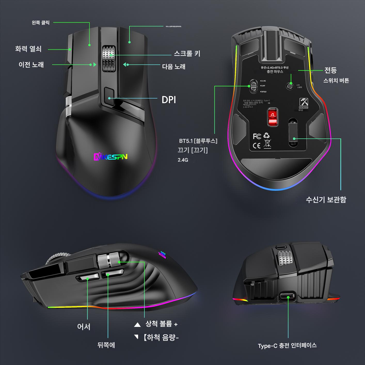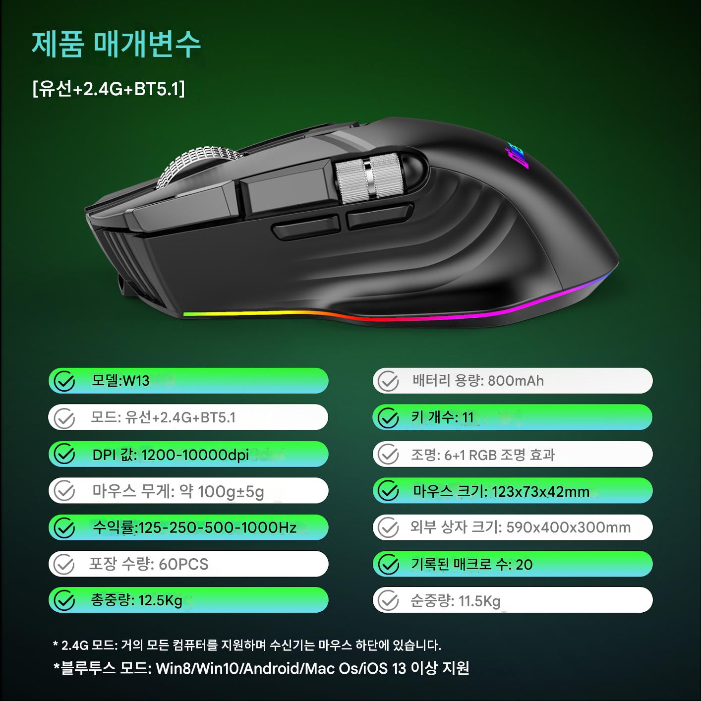 유선 및 무선 2.4G 블루투스 5.1 3모드 마우스 매크로 정의 10버튼 듀얼 휠 게임 RGB 컬러풀 충전