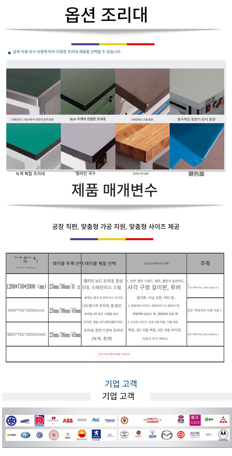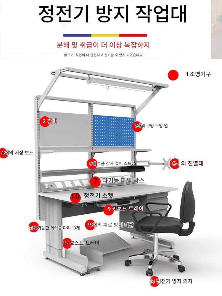 정전방지 작업대, 조립대, 포장대, 조명, 디스플레이 화면, 선반, 다기능 테이블 장착