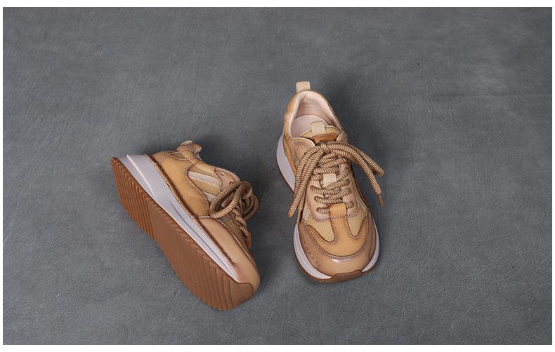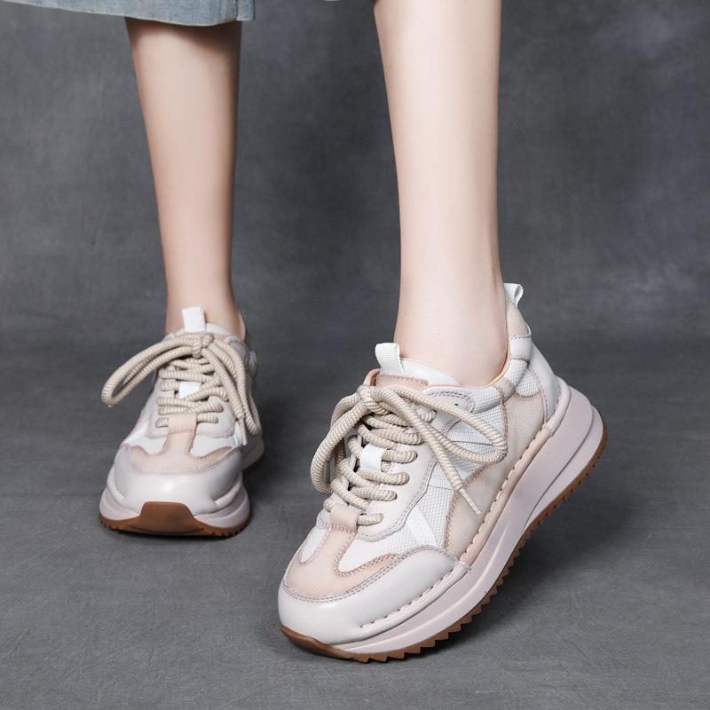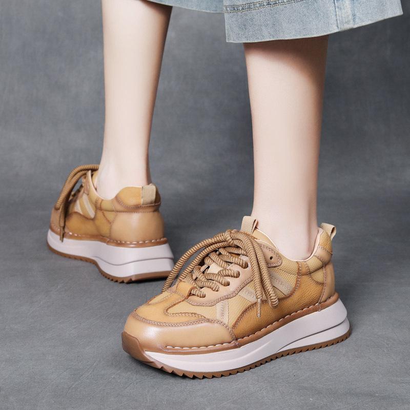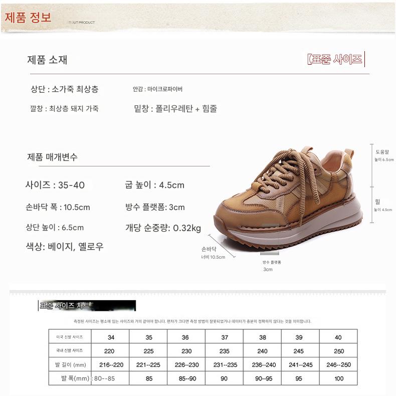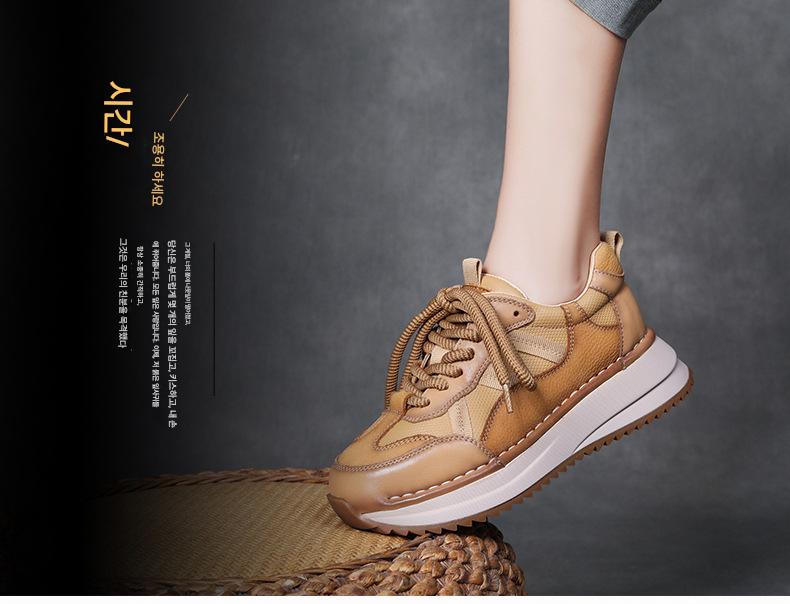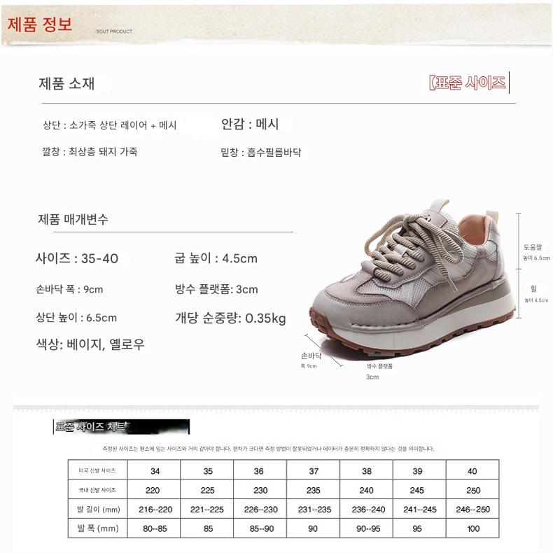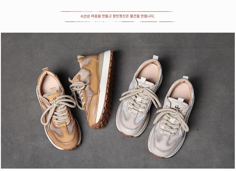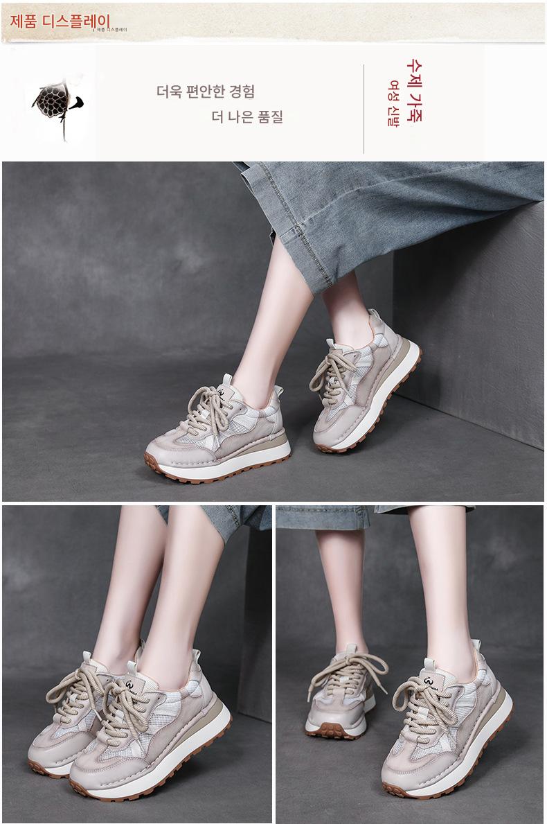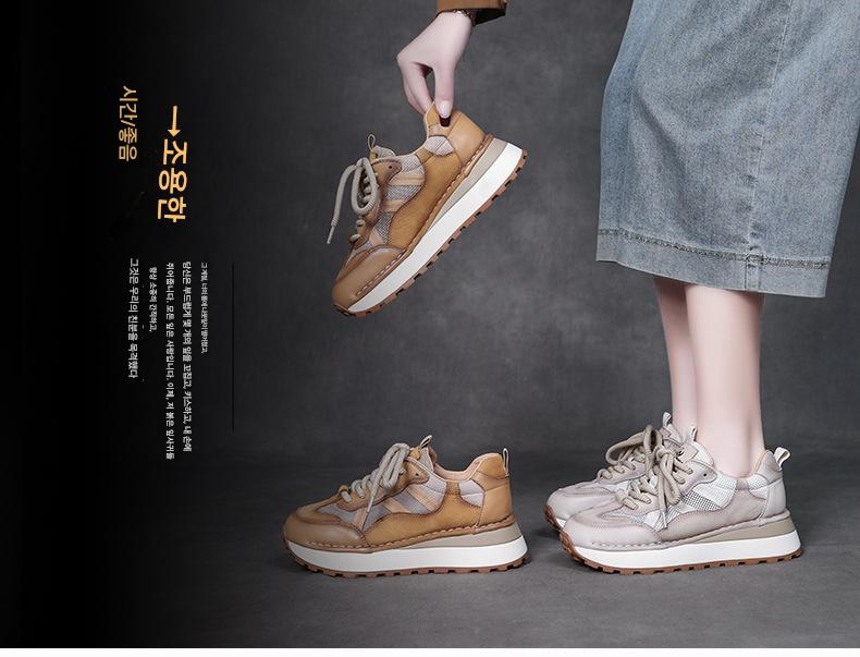 정품 가죽 여성화 1층 소가죽 2024년 신상 캐주얼 봄 가을 레이스업 미끄럼 방지 두꺼운 바닥 통기성 메시 웨지힐 싱글화