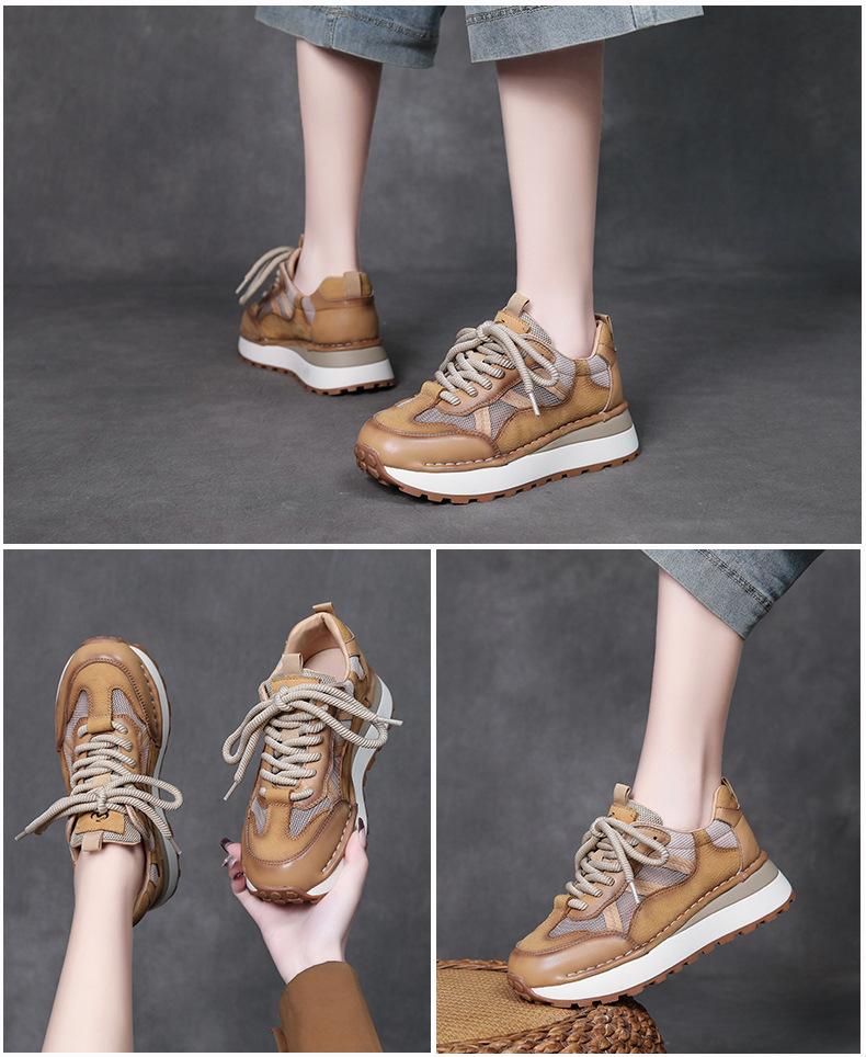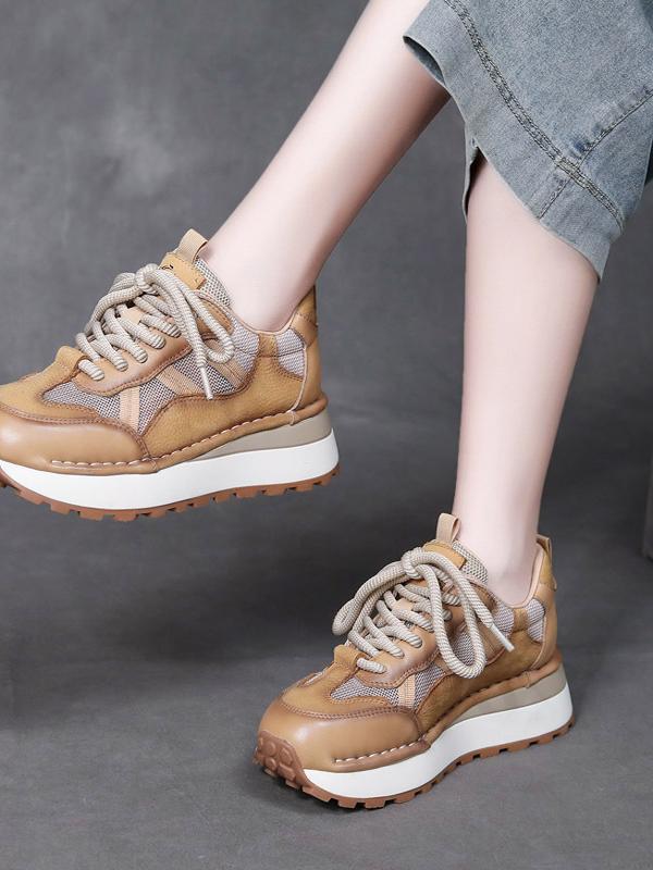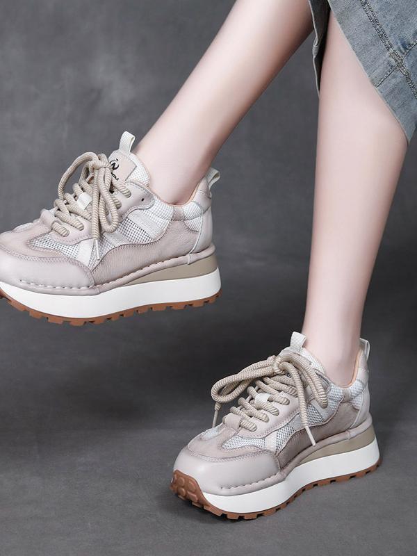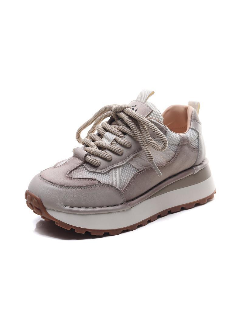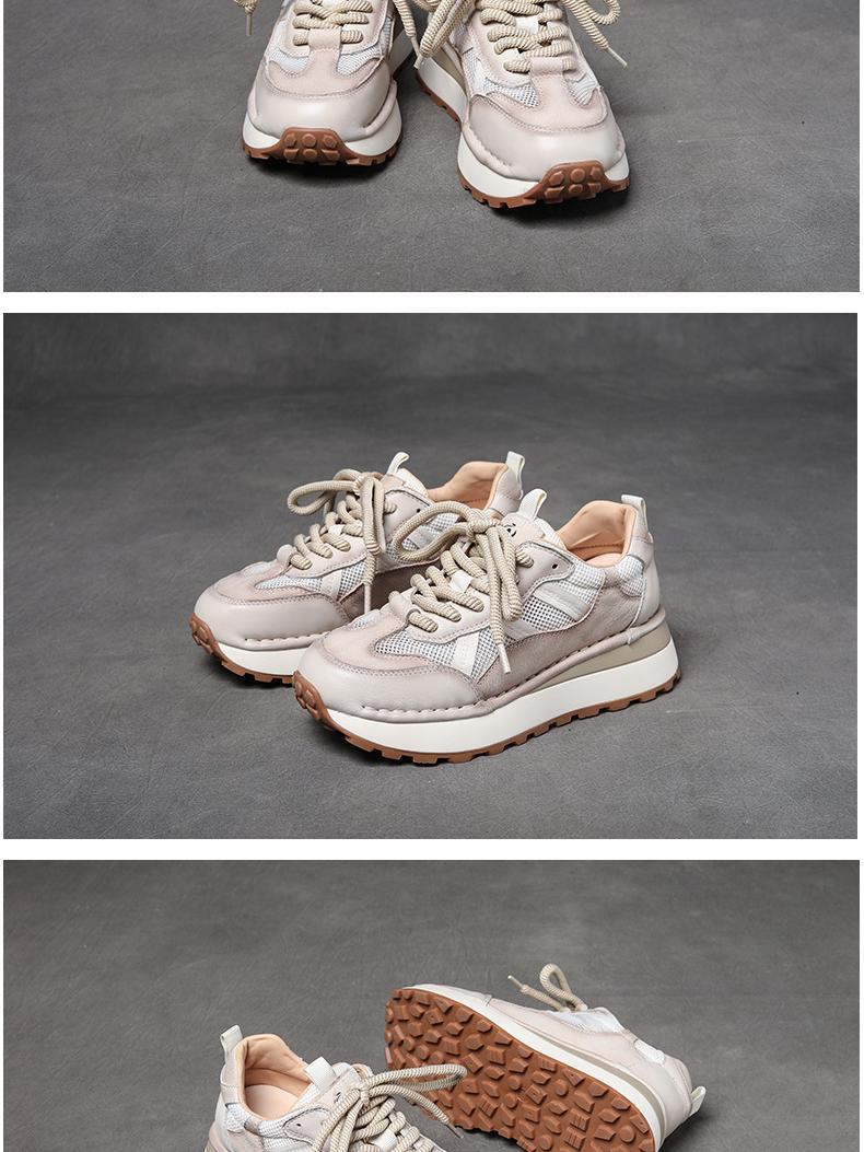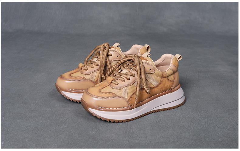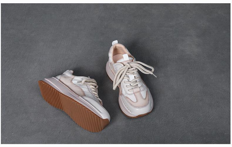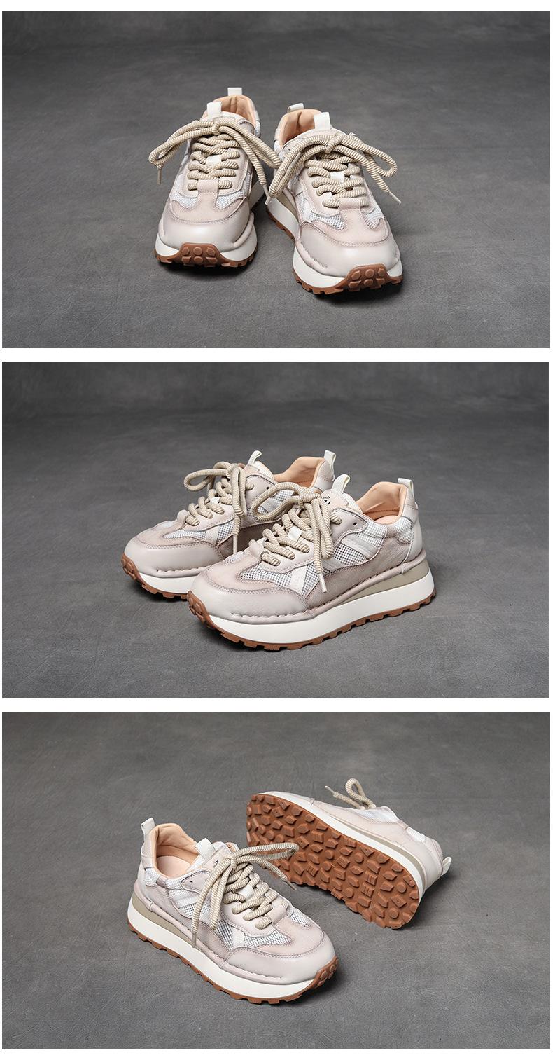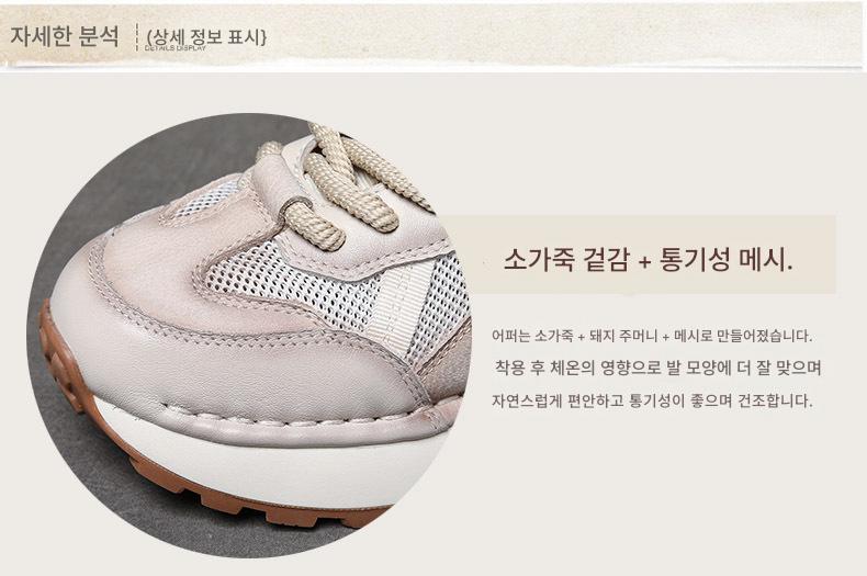 정품 가죽 여성화 1층 소가죽 2024년 신상 캐주얼 봄 가을 레이스업 미끄럼 방지 두꺼운 바닥 통기성 메시 웨지힐 싱글화