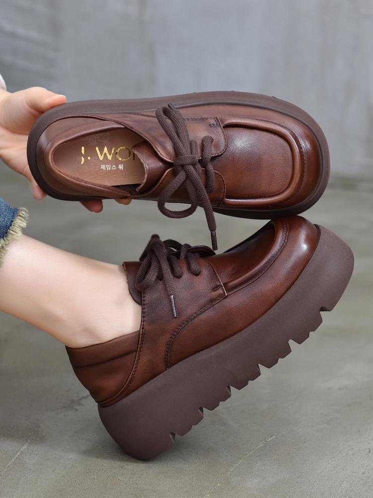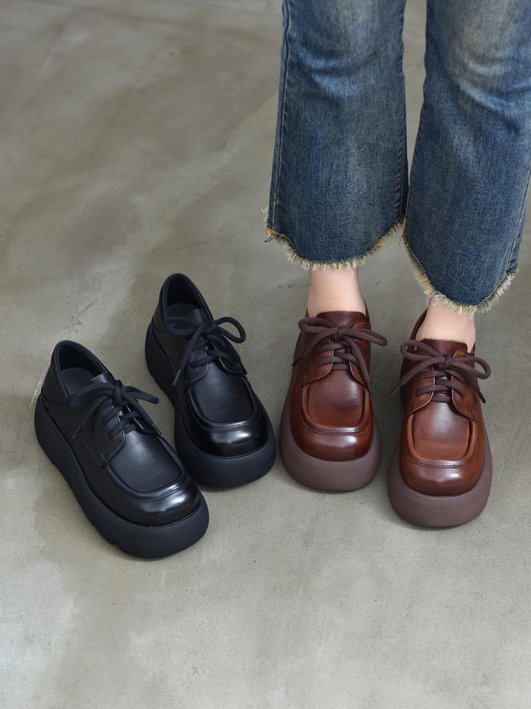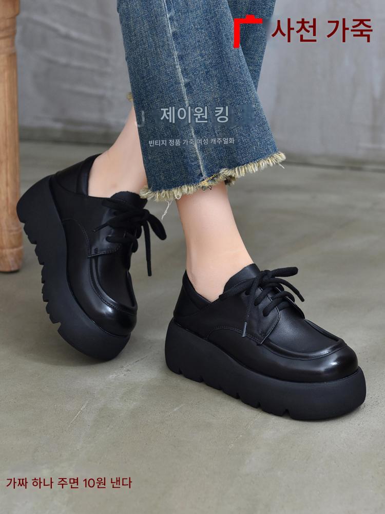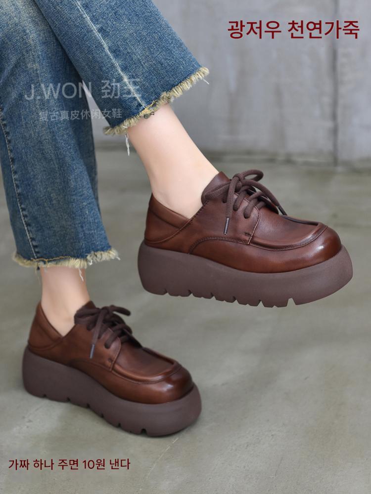진왕 2025 봄 여름 신상 정품 가죽 로퍼 두꺼운 밑창 레이스업 싱글 슈즈 캐주얼 레트로 올매치 가죽 슈즈 여성용