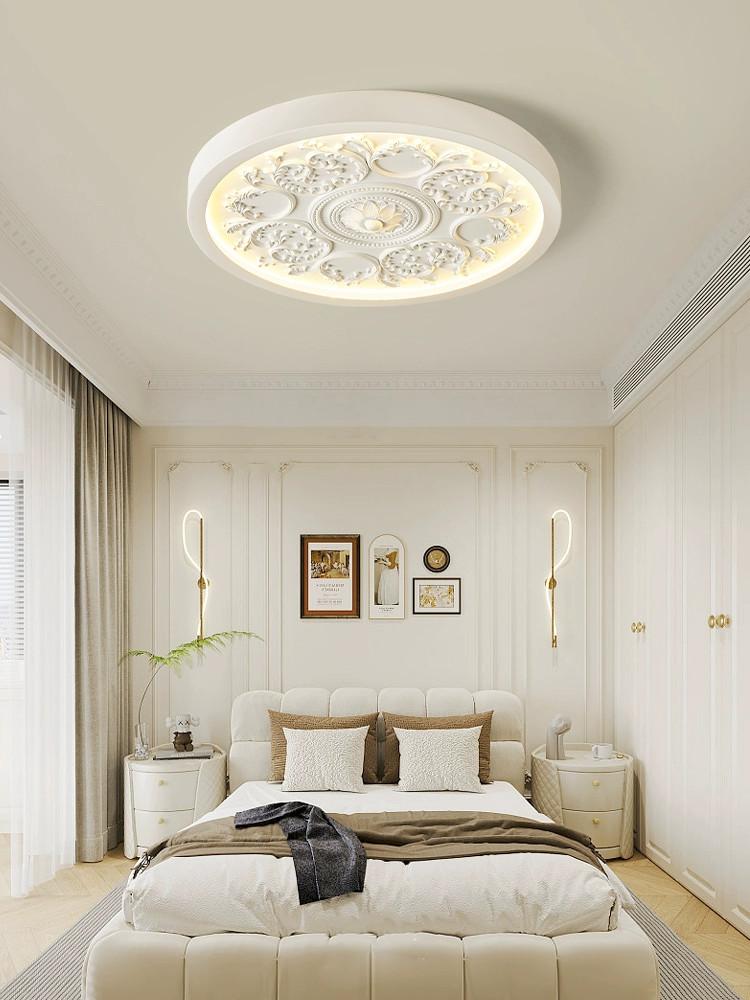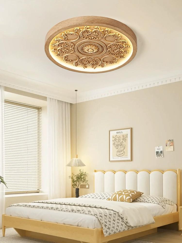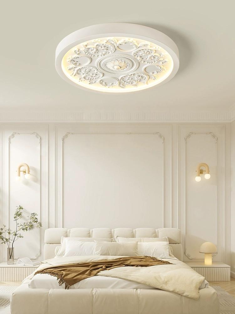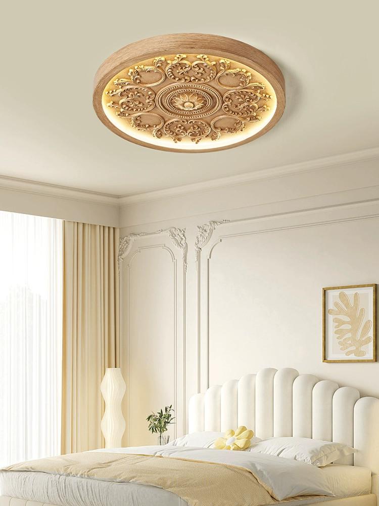 침실 램프 크림 스타일 새로운 예술 조각 프랑스 꽃 램프 심플한 원형 모조 목재 색상 룸 천장 램프