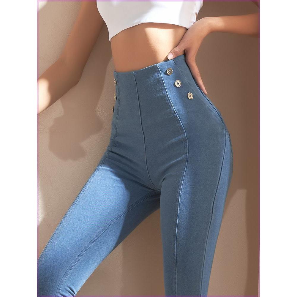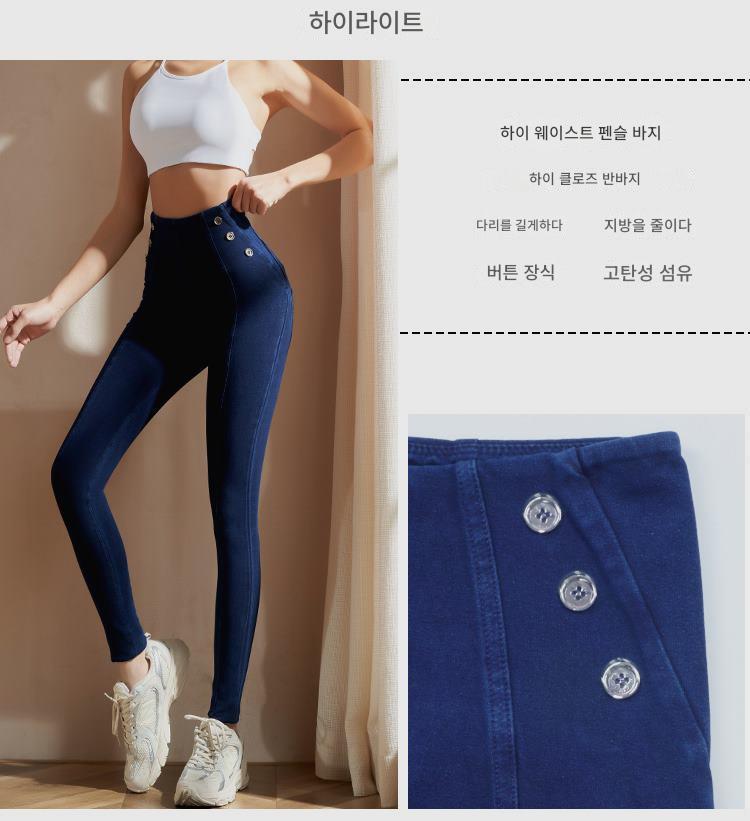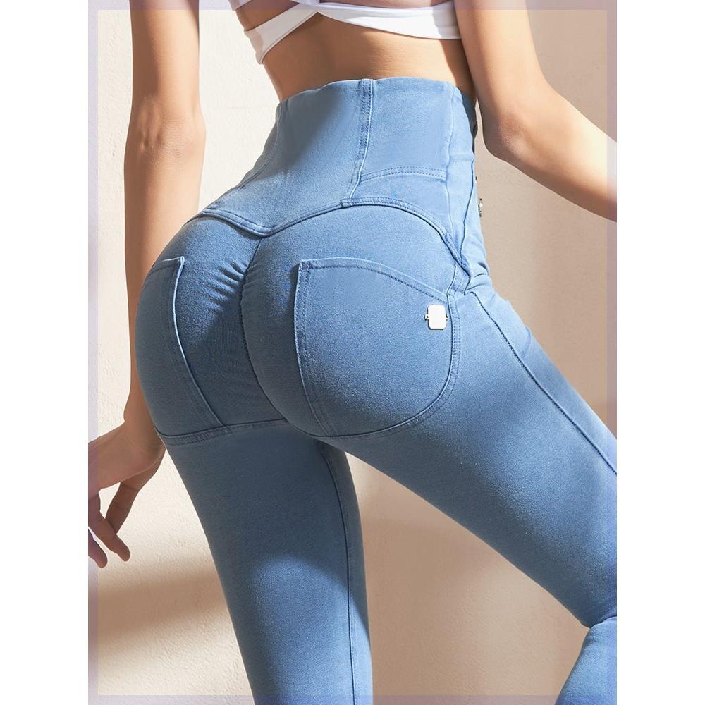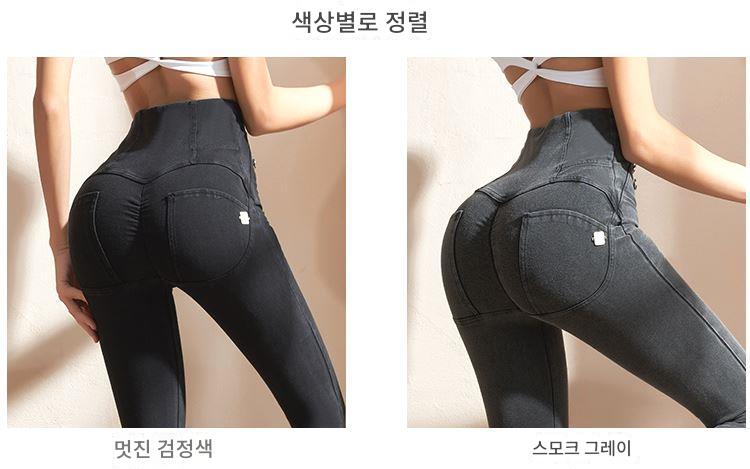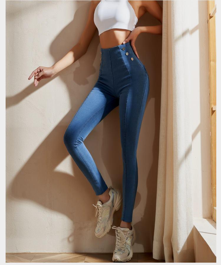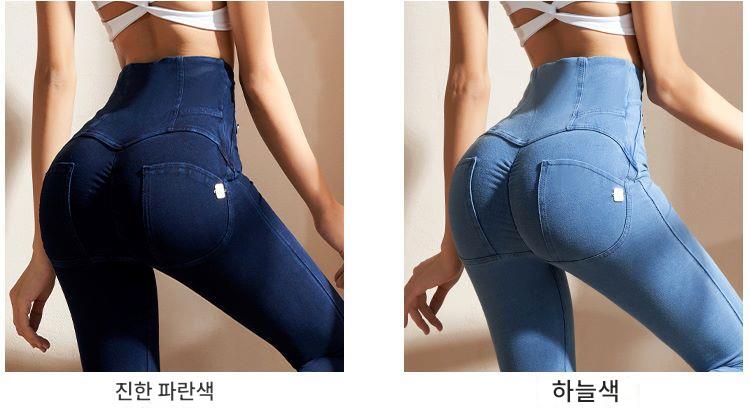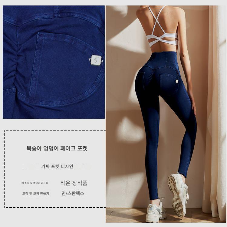 2024년 신상품 인조 데님 스포츠 팬츠 하이웨이스트 피치 힙 타이트 요가 팬츠 사이드 버튼 힙 리프팅 피트니스 팬츠 여성