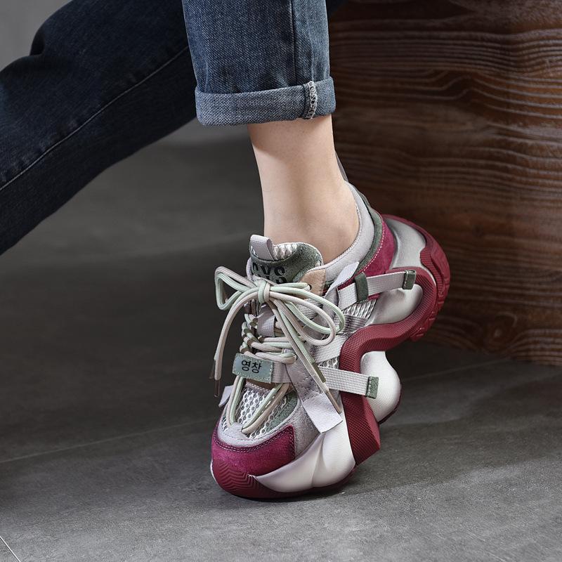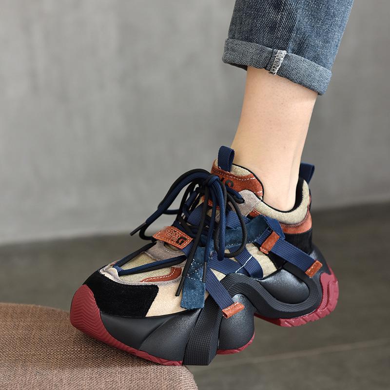 2025년 봄 신상품 정품 가죽 두꺼운 밑창 아빠화 여성 캐주얼 레이스업 로우탑화 디자인 인 트렌디화 하이힐