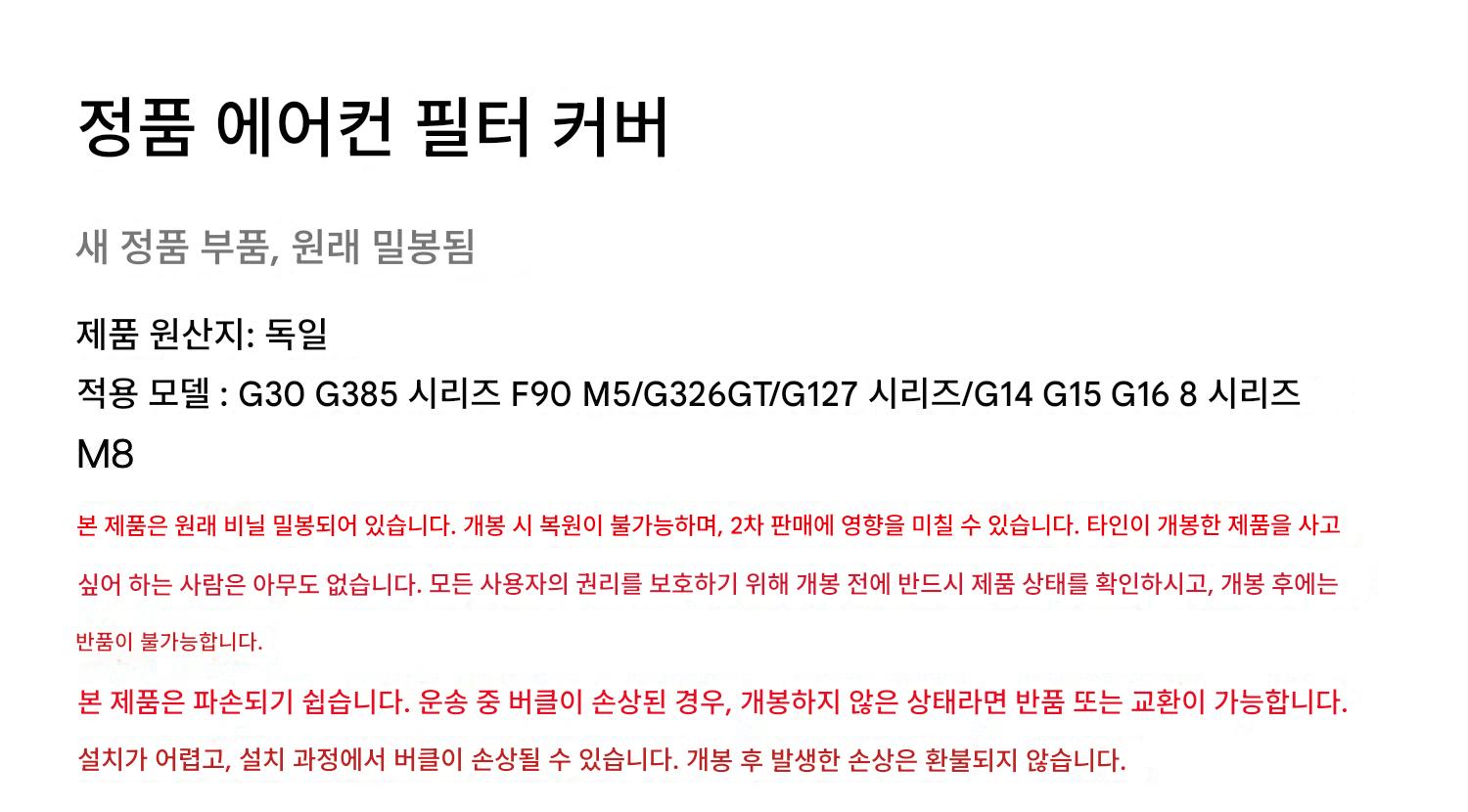 BMW 5 시리즈 정품 에어컨 필터 커버 G30G38 530 G12 740 G15 840 8 시리즈 X5X6X7